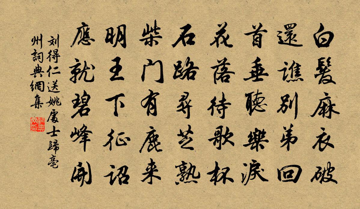詩詞名句歷史字典書法欣賞書法字典國語詞典說文解字康熙字典古漢語字典標 題 作 者 詩 句 送姚處士歸亳州作者:劉得仁 朝代:唐代送姚處士歸亳州原文白髮麻1/1衣破,還譙別弟回。首垂聽樂淚,花落待歌杯。石路尋芝熟,柴門有鹿來。明王下征詔,應就碧峰開。詩詞問答問:送姚處士歸亳州的作者是誰?答:劉得仁問:送姚處士歸亳州寫於哪個朝代?答:唐代問:送姚處士歸亳州是什麼體裁?答:五律劉得仁送姚處士歸亳州書法欣賞送姚處士歸亳州書法作品注釋全唐詩:卷544-20詩詞推薦秋日即事邵雍〔宋代〕鳥聲亂晝林,為誰苦驅逼。蟲聲亂夜庭,為誰苦勞役。嗟哉彼何短,一概無休息。借問此何長,兩能忘語默。早春有感鄭剛中〔宋代〕帶煙構外陰晴好,趁暖花苞日夜肥。有宅一區園十畝,不知天遣幾時歸。柳梢青 至順癸酉立春,客有持逃禪翁此卷相虞集〔元代〕題柳梢青調,亦賦一首雲從別幽花。玉堂金馬,十載忘家。橫幅疏枝,如逢舊識,同在天涯。荒村茅屋欹斜。待歸秋樹陸游〔宋代〕秋風一夜吹橋樹,明日來看已非故。吳中九月霜尚薄,落葉半隨飛鳥去。老人心事感凋零,只欲逢秋醉不醒。范寬夜歸陸游〔宋代〕今年寒到江鄉早,未及中秋見雁飛。八十老翁頑似鐵,三更風雨采菱歸。病中對石竹花皇甫冉〔唐代〕散點空階下,閒凝細雨中。那能久相伴,嗟爾殢秋風。和宋太史北樓新亭孟浩然〔唐代〕返耕意未遂,日夕登城隅。誰道山林近,坐為符竹拘。麗譙非改作,軒檻是新圖。遠水自嶓冢,長雲吞具區。願隨鴛鴦湖棹歌 之八十二朱彝尊〔清代〕秋晚東林落木疏,白蓮僧寺水中居。昏鐘不隔漁莊火,古殿猶存日本書。 雲居寺孤桐白居易〔唐代〕一株青玉立,千葉綠雲委。亭亭五丈余,高意猶未已。山僧年九十,清靜老不死。自雲手種時,一棵青桐子。直從冬懷三首張耒〔宋代〕悲笳奏已罷,落月在西壁。臥聞中林鳥,先曉鳴嘖嘖。爾求亦易供,固合事安息。夜歸陵旦起,何爾更勞役。乾坤水調歌頭(水洞)韓元吉〔宋代〕今日俄重九,莫負菊花開。試尋高處,攜手躡屐上崔嵬。放目蒼岩千仞。雲護曉霜成陣。知我與君來。古寺倚修竹桂隱紀詠靜賞亭張鎡〔宋代〕皂隸百輕肥,金朱彈丸篋。君方踞胡床,風掀緗冊葉。緣識宋太宗〔宋代〕眼識諸緣相,行持妙法存。明開邪見性,不見有無根。青弋江顧況〔唐代〕淒清回泊夜,淪波激石響。村邊草市橋,月下罟師網。聲聲慢侯善淵〔元代〕賢愚間異,曲直叢林,清濁事急難分。多少無知,開口信意胡葷。*呼為斥*,把靈椿、喚作朝菌。便假饒,是歲暮皈自城中,一病垂死,病起遣悶四首楊萬里〔宋代〕索居獨寡歡,巾車入城闉。親舊久不見,一見交相欣。挽衣招我飲,惟恐我出門。不招我亦往,不留我亦存。殷懃謝袁起岩使君借貢院居陳造〔宋代〕久晴忽一雨,為洗暑氣煩。斯人作欣慼,造物無怨恩。我方墮窮塗,獨能庇寒暄。公亦不自德,自笑煩於言。瓊台西路高似孫〔宋代〕一夜天台雨,青鞋蹋盡沙。添將清瀑水,濁盡碧桃花。涉澗鋤生術,和雲嚼野茶。便無仙骨分,不敢更思家。用太白韻贈報恩南老一首王阮〔宋代〕上人片雲孤,賤子亦萍蹤。兩枝同社蓮,千歲後凋松。今年九華山,去年五老峰。江南好風景,但願長相從。海棠崔鶠〔宋代〕渾是華清出浴初,碧綃斜掩見紅膚。便教桃李能言語,要比嬌妍比得無。名句推薦千層石樹遙行路,一帶山田放水聲。姚鼐《山行·布穀飛飛勸早耕》 秋風萬里芙蓉國,暮雨千家薜荔村。譚用之《秋宿湘江遇雨》 綠杯紅袖趁重陽。人情似故鄉。晏幾道《阮郎歸·天邊金掌露成霜》 知之曰明哲,明哲實作則。佚名《尚書·商書·說命上》 不種閒花,池亭畔、幾竿修竹。陸容《滿江紅·詠竹》 前不見古人,後不見來者。陳子昂《登幽州台歌》 龍噓氣成雲,雲固弗靈於龍也。韓愈《雜說一·龍說》 輪匠執其規、矩,以度天下之方圓墨子《墨子·天志(上)》 劍河風急雪片闊,沙口石凍馬蹄脫。岑參《輪台歌奉送封大夫出師西征》 示上以足,示下以惠,怨自削減。來俊臣《羅織經·固榮卷第六》
