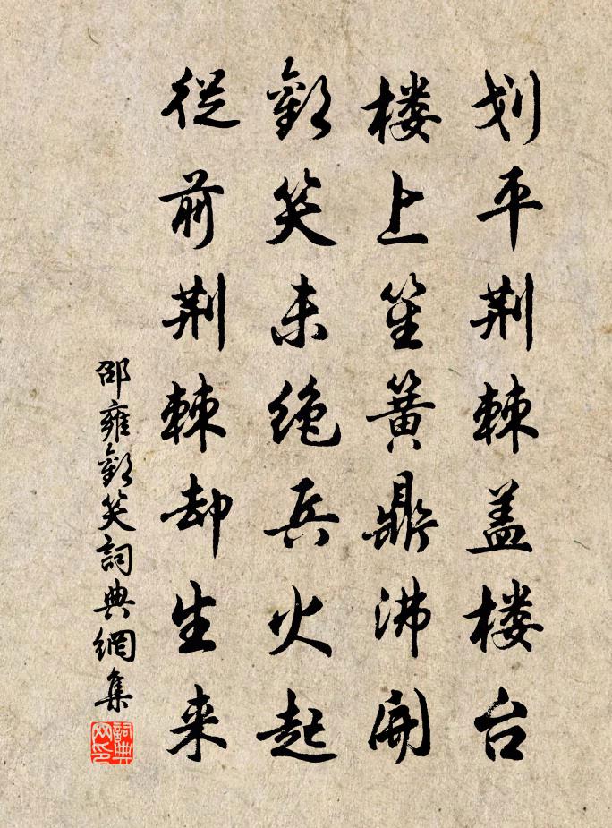 詩詞名句歷史字典書法欣賞書法字典國語詞典說文解字康熙字典古漢語字典標 題 作 者 詩 句 歡笑作者:邵雍 朝代:宋代歡笑原文劃平荊棘蓋樓台,樓上笙簧鼎沸開。歡笑未絕兵火起,從前荊棘卻生來。詩詞問答問:歡笑的作者是誰?答:邵雍問:歡笑寫於哪個朝代?答:宋代邵雍歡笑書法欣賞歡笑書法作品詩詞推薦石城夜賦陳與義〔宋代〕初月光滿江,斷處知急流。沉沉石城夜,漠漠西漢秋。為客寐常晚,臨風意難收。三更柁樓底,身世入搔頭。九日登叢台王建〔唐代〕平原池閣在誰家,雙塔叢台野菊花。零落故宮無入路,西來澗水繞城斜。洞仙歌朱彝尊〔清代〕花糕九日,綴蠻王獅子。圓菊金鈴鬢邊媚。向閒房密約,三五須來,也不用青雀先期飛至。恩深容易怨,釋怨成歡句楊簡〔宋代〕萬里蒼茫融妙間,三杯虛白浴天真。四怨三愁五情詩十二首。二怨曹鄴〔唐代〕庭花已結子,岩花猶弄色。誰令生遠處,用盡春風力。讀裴如晦萬里集書其後梅堯臣〔宋代〕君自萬里回,遂成萬里集。其詩二百篇,文字必已立。定應侔前人,未嘗有蹈襲。古溪蠻鐵刀,出冢土花澀。誰將紀事二十四首梁啓超〔清代〕眼中既已無男子,獨有青睞到小生。如此深恩安可負,當筵我幾欲卿卿。沁園春劉子實〔宋代〕臘後寒收,柳眼青歸,梅花笑生。正陽和有腳,日邊送暖,洪鈞換軸,天上回星。試巧春盤,介眉春酒,生意從頭悼逝張耒〔宋代〕結髮為夫婦,少年共饑寒。我迂趨世拙,十載困微官。男兒不終窮,會展凌風翰。相期脫崎嶇,一笑紓艱難。秋風次韻趙養民碧虛坐上范成大〔宋代〕已將山色染眉黛,更挽江波添酒罍。珍重江山勸人醉,笑人驅馬惺惺回。東湖晚步洪恩橋海棠洞三首陳杰〔宋代〕百花洲前萬柳堤,一川紅綠醉春時。樓台忽斷見西爽,鶯燕正深聞子規。邊上作三首貫休〔唐代〕山無綠兮水無清,風既毒兮沙亦腥。胡兒走馬疾飛鳥,聯翩射落雲中聲。陣雲忽向沙中起,探得胡兵過遼水。堪嗟次韻張昌言給事喜雨黃庭堅〔宋代〕三雨全清六合塵,詩翁喜雨句凌雲。垤漂戰蟻余追北,柱擊乖龍有裂文。減去鮮肥憂玉食,遍宗河嶽起爐薰。聖功夏日山中李白〔唐代〕懶搖白羽扇,裸袒青林中。脫巾掛石壁,露頂灑松風。羃窗周獻甫〔宋代〕薄紙新糊就,悠然一室清。有風寒不到,無月夜能明。暫隔前山色,時敲落葉聲。凍蠅可憎汝,鑽撲漫營營。偈三首釋洪英〔宋代〕青山重疊疊,綠水響潺潺。未到懸崖處,抬頭子細看。二絕句劉得仁〔唐代〕何處訪岐路,青雲但憶歸。風塵數年限,門館一生依。外族帝王是,中朝親舊稀。翻令浮議者,不許九霄飛。青玉案(有懷軒車山舊隱)王之道〔宋代〕半年不踏軒車路。仿佛過、長橋去。貼水行雲風送度。兩行高柳,一坡修竹,是我嘗游處。黃鸝休嘆青春暮。出谷頌古四十八首釋慧開〔宋代〕問既一般,答說相似。飯里有砂,泥中有刺。句何麒〔宋代〕一楠枯再生,兩石合無罅。名句推薦遙看孟津河,楊柳郁婆娑。佚名《折楊柳歌辭五首》 燕子來時新社,梨花落後清明。晏殊《破陣子·春景》 夫有尤物,足以移人左丘明《左傳·昭公·昭公二十八年》 常隨寶鐙陪金勒,絕塞指揮萬馬嘶。俞益謨《中洲株柳》 深林人不知,明月來相照。王維《竹里館》 生而知之;或學而知之;或困而知之:及其知之,一也。子思《中庸·第二十章》 長相思,長相思。晏幾道《長相思·長相思》 夫因兵死守蓬茅,麻薴衣衫鬢髮焦。杜荀鶴《山中寡婦 / 時世行》 君是南山遺愛守,我為劍外思歸客。蘇軾《滿江紅·江漢西來》 野幕敞瓊筵,羌戎賀勞旋。盧綸《和張僕射塞下曲·其四》
