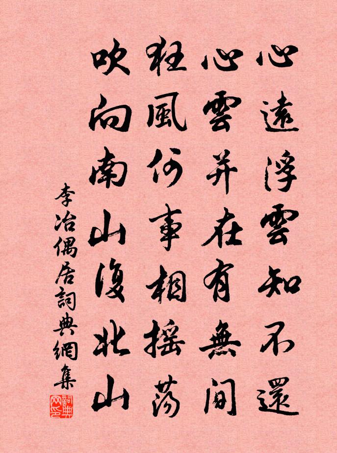 詩詞名句歷史字典書法欣賞書法字典國語詞典說文解字康熙字典古漢語字典標 題 作 者 詩 句 偶居作者:李冶 朝代:唐代偶居原文心遠浮雲知不還,心雲並在有無間。狂風何事相搖盪,吹向南山復北山。詩詞問答問:偶居的作者是誰?答:李冶問:偶居寫於哪個朝代?答:唐代問:偶居是什麼體裁?答:七絕李冶偶居書法欣賞偶居書法作品注釋全唐詩:卷805-14詩詞推薦白贊陳郁〔宋代〕年主九秩開,凡臉映碧眼,心靜寸心安,味窮百事懶。由中以至和,聞道亦非晚。頌證道歌證道歌釋印肅〔宋代〕即是如來真實相,鬧市卓牌標榜樣。子湖狗子咬三關,未透玄機招業障。古漁父詞十二首王銍〔宋代〕漁父家風我所知,家風要與道相宜。不懷貪餌知鉤意,常似絲綸未下時。霜夜無睡,聞畫角孤鴈二首楊萬里〔宋代〕畫角聲從枕底鳴,愁霜怨月不堪聽。擁紬起坐何人伴,只有殘燈半暈青。南嶽張舜民〔宋代〕它國西南隅,亘地{左山右勾}嶁外。奇峰七十二,主客雅相對。轍在想虔游,銘知知禹會。寄韓卷院南澗常伯之子姜特立〔宋代〕每思南澗一悽然,不見風騷二十年。子厚猶能記先友,審言且喜有家傳。蜩螗聲亂無遺響,山水人亡有絕弦。海內江城子劉辰翁〔宋代〕涌金門外上船場。湖山堂。眾賢堂。到幾淒涼,城角夜吹霜。誰識兩峰相對語,天慘慘,水茫茫。月移疏影傍人牆臨江仙(乙未,高宗慶七十,母氏封宜人作)丘崈〔宋代〕天上玉卮稱萬壽,人間湛露初勻。種萱堂上閱青春。薰風頻送喜,同日拜絲綸。班在蕊珠仙綴立,等閒歷遍燕秦。題正覺院籜龍軒二首王安石〔宋代〕北軒名字經平了,愛此吾能為賦詩。山雨江風一披拂,籜龍還自有吟時。到龍井寺鄭清之〔宋代〕竹門斜倚酒家簾,石路高低記水簾。炙背老農驚傴僂,乘肩痴女笑窺覘。數羝人立攀籬落,一蝶兒嬉掠繖檐。款約再和古梅蘇泂〔宋代〕和羹之說昔有聞,豈得不如魯泮芹。聞名尚救渴將軍,會稽竹箭胡能群。初花的皪美無度,情事淡泊春空雲。樹猶雜感十首以野曠沙岸淨天高秋月明為韻陸游〔宋代〕天人本一理,禍福常昭然。人眾何足恃,妄謂能勝天?適燕當北轅,調瑟當解弦。五行未可忽,洪範禹所傳。游嶽麓寺李東陽〔明代〕危峰高瞰楚江乾,路在羊腸第幾盤?肆樹松杉雙徑合,四山風十一僧寒。平沙淺草連天遠,落日孤城隔水看。薊北杏溪十首蓮塘姚合〔唐代〕方塘菡萏高,繁艷相照耀。幽人夜眠起,忽疑野中燒。曉尋不知休,白石岸亦峭。霜風王同祖〔宋代〕一夜霜風動地寒,塞垣火未報平安。嫦娥亦帶傷心色,為照征人尚抱鞍。大水雜言鄧肅〔宋代〕前日雨如絲,繽紛雜朝霧。昨日雨如注,萬壑爭馳騖。今朝有霽色,作意在芒屨。那知昨如傾,漫天飛瀑布。介休閒房釋文珦〔宋代〕閒房近竺岑,四面是清陰。涉物皆成趣,無因廢得吟。蛇蟠枯樹腹,雀乳古亭心。倘或遊人見,猶疑隱欠深。劉道祖江程萬丘順甫講易孟子拾其意為二十韻劉子翬〔宋代〕吾初讀七篇,未領躍如義。晚而窺大易,稍解寂然意。乃知平放著,的的目前事。盡心則無餘,窮神忽超詣。以斯蒲生鍾馗文同〔宋代〕寒風酸號月慘苦,梟飛狐鳴滿墟墓,叢棘亂礓翳野霧。古社禿剝倒枯樹,下有三鬼相嘯聚,初行誰家作{外門內主偈頌二百零五首釋正覺〔宋代〕不得諱,有頭底。當時你帶累別人,而今別人帶累你。來生我家,作業相似,針線穿聯細中細。迦葉阿難不相知,名句推薦內外相應也,言行相稱韓非及後人《韓非子·解老》 清晨入古寺,初日照高林。常建《題破山寺後禪院》 女大不中留。馮夢龍《警世通言·卷三十八》 聞誅一夫紂矣,未聞弒君也。孟子《孟子·梁惠王章句下·第八節》 剩水殘山無態度,被疏梅料理成風月。辛棄疾《賀新郎·把酒長亭說》 把酒對斜日,無語問西風。楊炎正《水調歌頭·把酒對斜日》 句有可削,足見其疏;字不得減,乃知其密。劉勰《文心雕龍·熔裁》 壯心未與年俱老,死去猶能作鬼雄。陸游《書憤五首·其二》 天下英雄誰敵手?曹劉。生子當如孫仲謀辛棄疾《南鄉子·登京口北固亭有懷》 雁聚河流濁,羊群磧草膻。齊己《送人游塞》