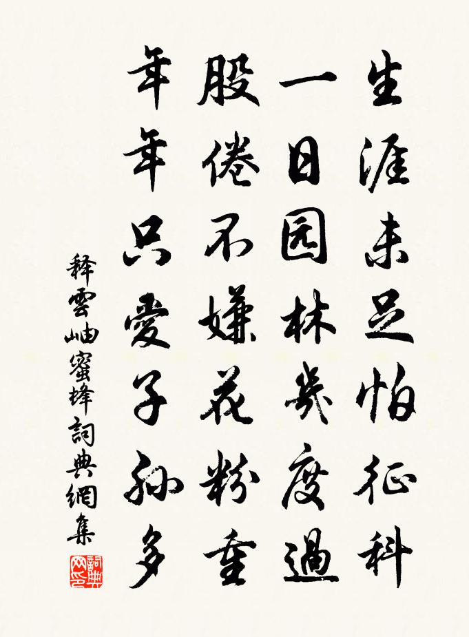 詩詞名句歷史字典書法欣賞書法字典國語詞典說文解字康熙字典古漢語字典標 題 作 者 詩 句 蜜蜂作者:釋雲岫 朝代:宋代蜜蜂原文生涯未足怕征科,一日園林幾度過。股倦不嫌花粉重,年年只愛子孫多。詩詞問答問:蜜蜂的作者是誰?答:釋雲岫問:蜜蜂寫於哪個朝代?答:宋代釋雲岫蜜蜂書法欣賞蜜蜂書法作品詩詞推薦寄題喻叔奇國傅郎中園亭二十六詠花屏楊萬里〔宋代〕錦障豪舉笑騃童,松圖冷淡惱山翁。玉山頹處誰扶著,花作屏風倚暖紅。鷓鴣天謝逸〔宋代〕桐葉成陰拂畫檐。清風涼處卷疏簾。紅綃舞袖縈腰柳,碧玉眉心媚臉蓮。愁滿眼,水連天。香箋小字倩誰傳。梅黃廣南韓公舶使致龍涎香三種數珠一串戲贈曾幾〔宋代〕千里傳聞陸凱,一枝遠寄梅花。虎節無煩驛使,龍涎走送寒家。池邊梅花一株盛開王炎〔宋代〕老來裘褐怯風吹,難傍花邊把一卮。嚼蕊嗅香清興在,尚呵凍筆欲題詩。送趙舒處士歸廬山李鹹用〔唐代〕歸岫香爐碧,行吟步益遲。諸侯師不得,樵客偶相隨。思舊江雲斷,談玄岳月移。只應張野輩,異代作心知。賈麟自睦來杭復將如蘇戲贈短句強至〔宋代〕春風那解系狂游,朝醉桐江暮柳洲。大手千篇隨電掃,孤蹤四海學雲浮。榮名不落閒宵夢,退築聊為晚歲謀。老橘次韻路德章吳斗南同迓朱侍講項安世〔宋代〕兩年京洛筆生埃,忽見清詩眼為開。蕭灑並將秋色寫,雄豪更帶夜潮來。可憐拄腹五千卷,誰與澆愁三百杯。莫遺南歌子·萬萬千千恨辛棄疾〔宋代〕萬萬千千恨,前前後後山。傍人道我轎兒寬。不道被他遮得、望伊難。今夜江頭樹,船兒系那邊。知他熱後甚時眠為人吟邵雍〔宋代〕為人須是與人群,不與人群不盡人。大舜與人焉有異,帝堯親族亦推倫。人心齟齬一身病,事體和諧四海春。心在乞雙峰山頻婆果朱翌〔宋代〕我聞如來有佛眼,結子成時速寄來。從此慈悲修廣目,得爭開處便爭開。頻酌淮河水戴復古〔宋代〕有客游濠梁,頻酌淮河水。東南水多鹹,不如此水美。春風吹綠波,鬱郁中原氣。莫向北岸汲,中有英雄淚。題茅山仙台藥院劉言史〔唐代〕擾擾浮生外,華陽一洞春。道書金字小,仙圃玉苗新。芝草迎飛燕,桃花笑俗人。樓台爭聳漢,雞犬亦嫌秦。願得立春日大雪作代簡招友蕭元之〔宋代〕山意久辭臘,林根凍未消。清尊如有待,白髮正無聊。歲去梅花在,春初柳絮飄。同吟二三子,折簡可能招。齊天樂(元夜閱夢華錄)蔣捷〔宋代〕銀蟾飛到觚梭外。娟娟下窺龍尾。電紫鞘輕,雲紅D12C曲,雕玉輿穿燈底。峰繒岫綺。沸一簇人聲,道隨竿媚冬日觀漁獵者陸游〔宋代〕人閒漁獵各相從,南陌東阡處處逢。繡羽觸機余耿介,錦鱗出網尚噞喁。傍觀扶杖常移日,就買還家足御冬。更待即事六絕王炎〔宋代〕了無俗駕到蝸廬,隱几閒翻貝葉書。屬會蒼頭休灑掃,綠苔隨意上階除。雜曲歌辭。妾薄命張籍〔唐代〕薄命婦,良家子,無事從軍去萬里。漢家天子平四夷,護羌都尉裹屍歸。念君此行為死別,對君裁縫泉下衣。與君寄棲賢渙上人鄭會〔宋代〕棲賢橋下水流沙,開了菖蒲幾度花。想得老師無別事,亂雲晴日補袈裟。聞伯可郎中銳然有冥鴻之舉小詩奉慶吳芾〔宋代〕郎省聲猷藹縉紳,看看步武到通津。合留北闕扶宸極,卻向西溪整釣綸。愧我暮年方謝事,羨君閉歲便抽身。時賢踏沙行 雪中山茶洪希文〔元代〕風掠寒條,雪封凍蕊。行人蟻凍荒崖里。千岩萬壑白皚皚,孤紅傑出真堪美。生類殲夷,芳心銷歇。玄冥漏*春生名句推薦因依老宿發心初,半學修心半讀書。王建《寄舊山僧》 林中有奇鳥,自言是鳳凰。阮籍《詠懷八十二首·其七十九》 禮,經國家,定社稷,序民人,利後嗣左丘明《左傳·隱公·隱公十一年》 此路無知己,明珠莫暗投。高適《送魏八》 枉己者不能直人,忘親者不能忠君。張廷玉《明史·列傳·卷六十七》 烹羊宰牛且為樂,會須一飲三百杯。李白《將進酒》 置將不善,壹敗塗地司馬遷《史記·高祖本紀》 歲暮百草零,疾風高岡裂。杜甫《自京赴奉先縣詠懷五百字 / 自京赴奉先詠懷五百字》 輪台東門送君去,去時雪滿天山路。岑參《白雪歌送武判官歸京》 殘杏枝頭花幾許。啼紅正恨清明雨。趙令畤《蝶戀花·欲減羅衣寒未去》