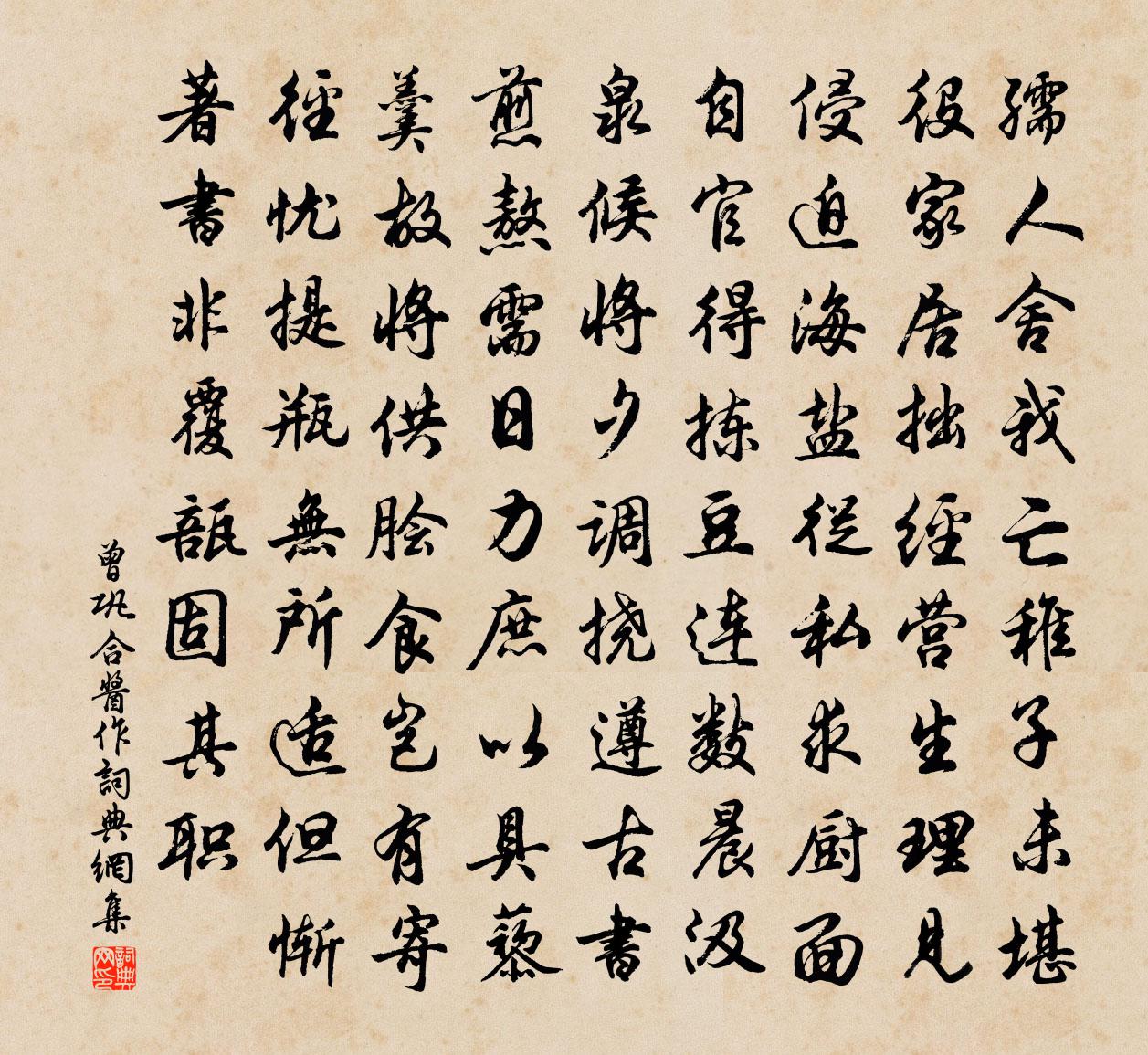 詩詞名句歷史字典書法欣賞書法字典國語詞典說文解字康熙字典古漢語字典標 題 作 者 詩 句 合醬作作者:曾鞏 朝代:宋代合醬作原文孺人舍我亡,稚子未堪役。家居拙經營,生理見侵迫。海鹽從私求,廚面自官得。揀豆連數晨,汲泉候將夕。調撓遵古書,煎熬需日力。庶以具藜羹,故將供膾食。豈有寄徑憂,提瓶無所適。但慚著書非,覆瓿固其職。詩詞問答問:合醬作的作者是誰?答:曾鞏問:合醬作寫於哪個朝代?答:宋代曾鞏合醬作書法欣賞合醬作書法作品詩詞推薦百寶妝長筌子〔元代〕一點靈光,輪迴萬劫,胎卵濕化無歇。苦海無涯,生滅甚時徹。無根四大非堅固,戀此個形骸何太拙。把浮沉世夢句諶祜〔宋代〕造物未嘗私化外,英雄何事老隆中。九日水閣韓琦〔宋代〕池館隳摧古榭荒,此延嘉客會重陽。雖慚老圃秋容淡,且看黃花晚節香。酒味已醇新過熟,蟹螯先實不須霜。年來和奇父竹齋小池及遊春五絕胡寅〔宋代〕不瞻犀柄動經旬,忽報巾車獨輾春。曾作天津歌酒伴,此間誰是識花人。居山陸游〔宋代〕涉世緣雖薄,居山味自長。穿雲雙履濕,洗藥一溪香。有酒作臉纈,無愁供鬢霜。遼天渺歸鶴,千載付茫茫。次韻呂之壽見憶丘葵〔宋代〕日暮客送客,此情悲復悲。棲棲吾老矣,寂寂子何之。跬步便相憶,論心未有期。江湖成底事,空使素衣緇。秋旱熱甚尤苦登陟輿中戲成黃公度〔宋代〕少皞不用事,八月猶苦熱。南方本炎蒸,況乃甘澤闕。雨師弛厥職,旱魃逞餘孽。金石鑠欲流,污池龜甲裂。稼穡耕園驛蔡襄〔宋代〕使軺迢遞到天涯,候館遷延感歲華。白髮卻攀臨砌樹,青條猶放過牆花。悲來唯見金城柳,醉後曾乘海客槎。欲問頌古釋道顏〔宋代〕猛虎當路坐,游魚腳底過。不覺紫胡老,便打劉鐵磨。游青源二首文天祥〔宋代〕鍾魚閒日月,竹樹老風煙。一徑溪聲滿,四山天影圓。無言都是趣,有想便成緣。夢破啼猿雨,開元六百年。夜登孔伯昭南樓時沈太清朱升在座孟浩然〔唐代〕誰家無風月,此地有琴尊。山水會稽郡,詩書孔氏門。再來值秋杪,高閣夜無喧。華燭罷然蠟,清弦方奏鵾。沈生和漁具十絕牟巘五〔宋代〕熒熒枯蚌中,急雪灑不滅。西風明日晴,雙花為儂結。閒適陸游〔宋代〕陸子居山陰,杜門輒經年。有時思出遊,兩屨凌風煙。長鑱斸靈曲,大瓢挹飛泉。眼長不及寸,能著萬里天。不飲人日驚蟄前數日大雪寄孫奇父韓叔夏胡寅〔宋代〕臘雪不溉旱,天公念嘉生。稚春乃祁寒,號令如冬行。栗烈鼓噫氣,碎訇動霆聲。初疑雨翻盆,旋覺霰灑甍。暫止寒松嘆(勝勝慢二首)賀鑄〔宋代〕鵲驚橋斷,鳳怨簫閒,彩雲薄晚蒼涼。難致祖州靈草,方士神香。寒松半敧澗底,恨女蘿、先委冰霜。寶琴塵網,南浦泊舟蕭元之〔宋代〕重來江閣俯滄流,一帶西山萬古愁。漁叟不知來客意,徑移船過北沙頭。題崔逸人山亭錢起〔唐代〕藥徑深紅蘚,山窗滿翠微。羨君花下酒,蝴蝶夢中飛。和張文裕安寒十首司馬光〔宋代〕何處初寒好,初寒禹鑒門。遙天露崖口,輕浪漱山根。萬佛龕苔老,一燈林靄昏。漁梁杳相望,石瀨夜聲喧。次韻周子直四首張嵲〔宋代〕西北疆途蹙,東南信未通。小夫方自智,大將莫論功。敵馬來關外,油幢入閬中。孤臣難自力,報國意無窮。得江西報六言十首劉克莊〔宋代〕大江已浪頭白,中原未棗兒紅。折北不愁春水,吠南何必秋風。名句推薦尊前只恐傷郎意,閣淚汪汪不敢垂。夏竦《鷓鴣天·鎮日無心掃黛眉》 誠既勇兮又以武,終剛強兮不可凌。屈原《國殤》 鶯初解語,最是一年春好處。蘇軾《減字木蘭花·鶯初解語》 算明朝、未了重陽,紫萸應耐看。吳文英《霜花腴·重陽前一日泛石湖》 使人有面前之譽,不若使人無背後之毀陳繼儒《小窗幽記·集醒篇》 八月寒葦花,秋江浪頭白。李頎《送劉昱》 喜遇重陽,更佳釀今朝新熟。宋江《滿江紅·喜遇重陽》 世事茫茫難自料,春愁黯黯獨成眠。韋應物《寄李儋元錫》 君者,舟也;庶人者,水也。水則載舟,水則覆舟。荀子《荀子·哀公》 惜恐鏡中春。不如花草新。張先《菩薩蠻·憶郎還上層樓曲》