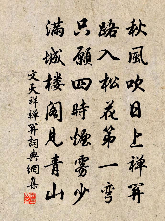 詩詞名句歷史字典書法欣賞書法字典國語詞典說文解字康熙字典古漢語字典標 題 作 者 詩 句 禪關作者:文天祥 朝代:宋代禪關原文秋風吹日上禪關,路入松花第一彎。只願四時煙霧少,滿城樓閣見青山。詩詞問答問:禪關的作者是誰?答:文天祥問:禪關寫於哪個朝代?答:宋代問:文天祥的名句有哪些?答:文天祥名句大全文天祥禪關書法欣賞禪關書法作品詩詞推薦暑中懶出王令〔宋代〕暑雲無雨易飛揚,旱日當天不可望。浪走俗塵無遠到,不如嘉樹坐余涼。已嫌風少難平暑,更被蟬飢取實腸。夢到即事呈閎中順之二年兄二首晁補之〔宋代〕蠖軒屈首詩書人,自喻適志非求伸。聞蟬熟寐白竹簟,見客一整烏紗巾。語言無味窮鬼志,香火有緣居士身。明年仲連兄治南堂韓維〔宋代〕予生乏時用,惟懶性所便。強輓亦已退,雖鞭詎能前。有園不盈畝,正在居南偏。荒埋日失治,坐惜嘉觀捐。伯氏賢者之孝二百四十首甄逢林同〔宋代〕史書良為稹,褒詔卻因袁。足使濟不朽,何堪逢自言。重九前一日領客登城即席次張以道韻張鎡〔宋代〕未倒花前鑿落金,登攜那怕嫩寒侵。歸牛下隴爭浮水,宿鳥隨山不過林。衰鬢預吹明日帽,放歌時帶故園音。菊煙挽張舍人安國四首王阮〔宋代〕近別逾旬朔,俄傳訃問來。初疑餘子謗,漸沸使人猜。竟作青黃木,終成犯怒雷。數行衰淚盡,吾意獨憐才。熙寧以後祀高禖六首佚名〔宋代〕昭見精衷,靈承端命。青帝姑懷,神禖儲慶。祚以蕃昌,協於熙盛。螽斯眾多,流於雅詠。有感張嵲〔宋代〕傾摧漢祚是安昌,只恐狂瀾世莫當。自古忠言寧盡用,老臣得不戒王章。出郭姜特立〔宋代〕歲暮偶出郭,斜陽帶遠村。雪松含臘意,沙水動春痕。嘆老陸游〔宋代〕晨起梳頭滿鏡霜,豈堪著腳少年場。酒徒分散情疏索,棋敵憑陵意頡頏。寓世極知均醉夢,餘生只合老耕桑。石帆春晴泛舟陸游〔宋代〕兒童莫笑是陳人,湖海春回發興新。雷動風行驚蟄戶,天開地辟轉鴻鈞。鱗鱗江色漲石黛,嫋嫋柳絲搖麴塵。欲上題花光梅十首一枝橫出王柏〔宋代〕踏雪尋香幾度吟,吟詩那得似花人。水村雲壑抽身出,月掛疎籬別有春。對月懷簽判丈兼簡文顯趙蕃〔宋代〕季月風當凜,南方候實偏。長林未搖落,頻夕對嬋娟。恨我遙成隔,知公夜不眠。連牆有周子,置論每超然。吊元魯山孟郊〔唐代〕搏鷙有餘飽,魯山長飢空。豪人飫鮮肥,魯山飯蒿蓬。食名皆霸官,食力乃堯農。君子恥新態,魯山與古終。天璞分韻作梅花詩得東字陸游〔宋代〕淺寒籬落清霜後,疏影池塘淡月中。北客同春俱稅駕,南枝與我兩飄蓬。從來遇酒千鍾少,此外評花四海空。惟恨自桃川至辰州絕句四十有二趙蕃〔宋代〕新綠深深嫩更黃,非花非草定何香。故山草木皆余愛,最愛抽梢竹過牆。次綱官王簿韻兼簡伯潛二首廖行之〔宋代〕江上晴光照眼濃,十分春色滿城東。客懷何限湘波綠,漕事方殷漢粟紅。雅有詩情添興遠,可無酒力破愁攻。舳艫奉和族祖紫嚴翁謾興十首汪炎昶〔宋代〕地稈山故崇,河黃濟故清。彼豈超然中,但婢吾無能。我家壁中書,不知相牛經。比與鮮于柬之游池上已而辱三詩見示因次韻晁公溯〔宋代〕如風如高人,於世豈求售。惟予招則來,怏出土囊口。臨風弄清泠,笑視月在手。吾州玻璃江,不減蒲萄酒。玉珮丁謂〔宋代〕至寶不自獻,韜藏亦英華。余香被草木,秀擢幽岩花。名句推薦四邊伐鼓雪海涌,三軍大呼陰山動。岑參《輪台歌奉送封大夫出師西征》 旅客三秋至,層城四望開。杜審言《登襄陽城》 毛羽未成,不可以高蜚司馬遷《史記·蘇秦列傳》 師也者,教之以事而喻諸德者也戴聖《禮記·文王世子》 酷憐嬌易散,燕子學偎紅。納蘭性德《臨江仙·絲雨如塵雲著水》 白日來深殿,青雲滿後塵杜甫《寄李十二白二十韻》 應難奈,故人天際,望徹淮山,相思無雁足。史達祖《八歸·秋江帶雨》 故人遠,問誰搖玉佩,檐底鈴聲。蔣捷《聲聲慢·秋聲》 還作江南會,翻疑夢裡逢。戴叔倫《客夜與故人偶集 / 江鄉故人偶集客舍》 今人不見古時月,今月曾經照古人。李白《把酒問月·故人賈淳令予問之》
