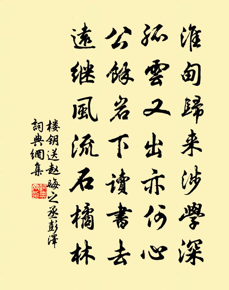 詩詞名句歷史字典書法欣賞書法字典國語詞典說文解字康熙字典古漢語字典標 題 作 者 詩 句 送趙晦之丞彭澤作者:樓鑰 朝代:宋代送趙晦之丞彭澤原文淮甸歸來涉學深,孤雲又出亦何心。公餘岩下讀書去,遠繼風流石橘林。詩詞問答問:送趙晦之丞彭澤的作者是誰?答:樓鑰問:送趙晦之丞彭澤寫於哪個朝代?答:宋代樓鑰送趙晦之丞彭澤書法欣賞送趙晦之丞彭澤書法作品詩詞推薦伏日劉克莊〔宋代〕屋山竹樹帶疏蟬,淨掃風軒散發眠。老子平生無長物,陶詩一卷枕屏邊。晚步南城下張良臣〔宋代〕冷雲堆屋晚仍春,惘惘人行陌上昏。飛去飛來沙上雁,去年洲渚舊蘆根。聞蟬寄友人(一作李端詩)郎士元〔唐代〕昨日始聞鶯,今朝蟬又鳴。朱顏向華發,定是幾年程。故國白雲遠,閒居青草生。因垂數行淚,書寄十年兄。蟠梅衛宗武〔宋代〕妙製成春春未知,園工自出一家機。折旋夭矯龍蛇勢,繚繞繽紛蛾蝶圍。煙篆不生騰賸馥,月痕相倚衒清輝。西城曹娥廟潘牥〔宋代〕一川經漲夕陽波,幼婦碑殘鎖綠蘿。不止但爭三十里,曹瞞元不識曹娥。啟母廟李廌〔宋代〕帝武啟宗周,玄鳥浚哲商。塗山配神禹,獨不嗣娥姜。異時天與賢,嗣子繄匪良。欲肇天與子,是用開厥祥。鈞台讀道藏蘇軾〔宋代〕嗟予亦何幸,偶此琳宮居。宮中復何有,戢戢千函書。盛以丹錦囊,冒以青霞裾。王喬掌關鑰,蚩尤守其廬。乘閒次韻寺丞叔都城喜雪李洪〔宋代〕東郊初未布陽和,湖上祥霙點淥波。重璧台遙黃竹作,孤山園近落梅多。表儀共仰豐年玉,賦詠宜陪賡載歌。誰憶山間次季芳韻真山民〔宋代〕好山多在眼,塵事少關心。風竹有聲畫,石泉無操琴。許猿分野果。留鶴襯雲林。憶故園李新〔宋代〕杖藜出北郭,山阿延餘暉。屏營立高原,霜飈吹我衣。牛羊稍絕跡,聚落燈火稀。顧我豈無家,廢置不得歸。大田大人和雲樓底雪千峰樓頭著寓翁梅力開萼綠桃洪咨夔〔宋代〕寄榻高寒地,收心懶散翁。雞鳴虛室白,鴉起小窗紅。古操塵弦拂,新詩凍研烘。桃梅芳意覺,不是去年叢。聚蚊梅堯臣〔宋代〕日落月復昏,飛蚊稍離隙。聚空雷殷殷,舞庭煙冪冪。蛛網徒爾施,螗斧詎能磔。猛蠍亦助惡,腹毒將肆螫。不能本禪人爛柴釋智愚〔宋代〕祗為到頭乾不盡,縱饒見火亦難吹。年來歲往消磨去,不許春風管帶伊。鷓鴣天·戊午拜復職奉祠之命辛棄疾〔宋代〕老退何曾說著官。今朝放罪上恩寬。便支香火真侍俸,更綴文書舊殿班。扶病腳,洗衰顏。快從老病借衣冠。此身賀新郎 寄辛幼安,和見懷韻陳亮〔宋代〕老去憑誰說。看幾番、神奇臭腐,夏裘冬葛。父老長安今餘幾,後死無仇可雪。猶未燥、當時生髮。二十五弦多少寒食鄭剛中〔宋代〕江鄉時節逢寒食,花落未將春減色,嶺南能有幾多花,寒食臨之掃春跡。花多花少非我事,春去春來亦堪惜。柴門和人雪意梅堯臣〔宋代〕凍雲低重野,遠樹昏未分。朝來庭竹上,摵摵霰已聞。扣門有兵吏,嘉命傳相君。趨合展熊席,卷幔飄爐熏。桂漿歸去來集字十首蘇軾〔宋代〕役役倦人事,來歸車載奔。征夫問前路,稚子候衡門。入息亦詩策,出遊常酒樽。交親書已絕,雲壑自相存。冬夜官舍圍爐傳酒曾豐〔宋代〕放散衙曹小退安,閉門開架檢書看。檐前月色生寥寂,屋外風聲長隙寒。灰火撥愁頭屢點,爐燈挑喜指頻彈。家人與郛郎作骨董羹四首釋慧空〔宋代〕寒士百葅食藉佳,敢比八珍五侯家。分甘長貧體生粟,誰能一飽面發霞。自羹青菘燒蘆菔,更雜石耳相天花。願留名句推薦故人不可見,新知萬里外。文天祥《端午即事》 名不徒生,而譽不自長。功成名遂。墨子《墨子·02章 修身》 天下雖安,忘戰必危。姜子牙《司馬法·仁本》 稱是秦時避世人,勸酒相歡不知老。李白《山人勸酒》 登臨送目,正故國晚秋,天氣初肅。王安石《桂枝香·登臨送目》 平林漠漠煙如織,寒山一帶傷心碧。李白《菩薩蠻·平林漠漠煙如織》 道吾好者是吾賊,道吾惡者是吾師。佚名《增廣賢文·上集》 木蘭舟上珠簾卷,歌聲遠,椰子酒傾鸚鵡盞。李珣《南鄉子·山果熟》 斜陽照墟落,窮巷牛羊歸。王維《渭川田家》 暖風熏得遊人醉,直把杭州作汴州。林升《題臨安邸》