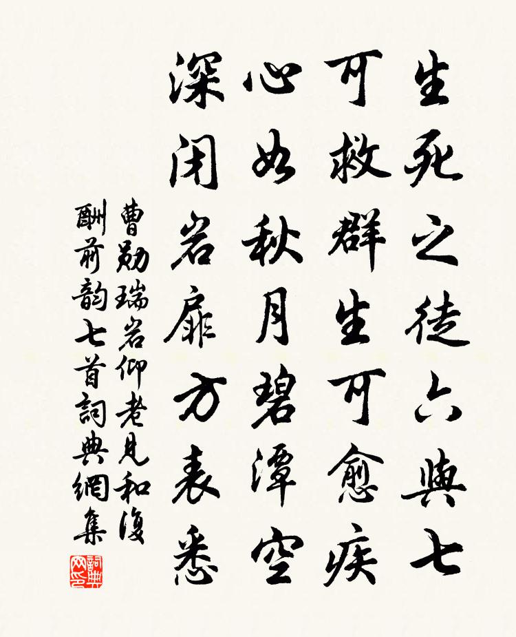 詩詞名句歷史字典書法欣賞書法字典國語詞典說文解字康熙字典古漢語字典標 題 作 者 詩 句 瑞岩仰老見和復酬前韻七首作者:曹勛 朝代:宋代瑞岩仰老見和復酬前韻七首原文生死之徒六與七,可救群生可愈疾。心如秋月碧潭空,深閉岩扉方表悉。詩詞問答問:瑞岩仰老見和復酬前韻七首的作者是誰?答:曹勛問:瑞岩仰老見和復酬前韻七首寫於哪個朝代?答:宋代曹勛瑞岩仰老見和復酬前韻七首書法欣賞瑞岩仰老見和復酬前韻七首書法作品詩詞推薦荳葉黃晁補之〔宋代〕蒹葭蒼,荳葉黃。南村不見岡,北村十頃強。東家車滿箱,西家未上場。荳葉黃,野離離。鼠窟之,兔入畦。豕母送選上人釋行海〔宋代〕江天雁過客心遙,一舸涼風八月潮。七十二湖煙雨岸,蓼花楓葉正蕭蕭。壽湖南汪倉十首廖行之〔宋代〕紫樞勳業舊青氈,更上中台秉化權。它日鴻鈞陶壽域,赤松相與不論年。瑪瑙坡四詠釋智圓〔宋代〕瑪瑙坡前樹,春來亦著華。雨晴煙乍斂,濃艷斗朝霞。答彭州職方朱員外公綽宋祁〔宋代〕四忝方州換隼旟,九番官樹老儲胥。淹留太史編殘藁,廢忘河東篋里書。遠想淵雲才不逮,略通邛僰計仍疏。夢回酒酣再賦一絕吳芾〔宋代〕二年兩度到蛾眉,今日還來話別離。所恨行人難久住,酒闌不見月明時。題李杜蘇黃像山谷洪咨夔〔宋代〕神為驂騑氣為車,秋雲扶疏春風腴。湯餅睡起茗碗須,意往獨與奚奴俱。奴底頭笑公,放懶不著書。和傅侍郎至臨漳感舊十詠陳淳〔宋代〕南州佳品勝羅浮,青女飛花任打頭。寒涸更深香更烈,松朋梅友敢凌不。夜泊虹縣同施景仁太博河上納涼書事梅堯臣〔宋代〕與君愛清風,移榻就明月。月落見星繁,星繁如晝熱。沾衣輕露墜,響岸崩湍齧。坐思都城時,誰許腳不鞋。和顏長官百詠漁父朱繼芳〔宋代〕秋風淅淅獵菰蒲,如此江山其可孤。天與玻瓈三萬頃,更添一半夕陽鋪。送恭叔赴海門尉端叔約同過湘西酌別四首趙蕃〔宋代〕君嘆父兄別,我嗟朋友疎。窮冬仍遠道,異縣復離居。僅得追隨再,何由懷抱攄。因來湖外使,為寄海邊書。己亥雜詩龔自珍〔清代〕秋心如海復如潮,惟有秋魂不可招。漠漠鬱金香在臂,亭亭古玉佩當腰。氣寒西北何人劍,聲滿東南幾處簫。一川次韻蘇教授飯鄭教授五首項安世〔宋代〕臥龍山下鹿門居,消得幽人一草廬。更有勝如諸葛處,稻花香里看芙蕖。胡寅赴明州慈谿尉宋祁〔宋代〕久困天官調,東南亦第如。客篙新溜急,春樹雜花餘。越{榷木換月}豐池鴨,吳袍競庫綀。還音與歸夢,併附浙芭蕉三首楊萬里〔宋代〕骨相玲瓏透八窗,花頭倒掛紫荷香。繞身無數青羅扇,風不來時也不涼。和人與人分惠賜冰楊巨源〔唐代〕天水藏來玉墮空,先頒密署幾人同。映盤皎潔非資月,披扇清涼不在風。瑩質方從綸閣內,凝輝更向畫堂中。麗詞感春三首韓愈〔唐代〕偶坐藤樹下,暮春下旬間。藤陰已可庇,落蕊還漫漫。新葉大,瓏瓏晚花乾。==青天高寥寥,兩蝶飛翻翻。時節定風波歐陽修〔宋代〕對酒追歡莫負春。春光歸去可饒人。昨日紅芳今綠樹。已暮。殘花飛絮兩紛紛。粉面麗姝歌窈窕。清妙。尊前信任舟過嚴州戴表元〔宋代〕溪石茸茸出,水泉滃滃懸。銜杯仙洞頂,掛席客星邊。古岸魚為市,窮鄉繭當田。生涯著處有,奔走愧華巔。新年多雨一日晴色可喜戴復古〔宋代〕一晴良可喜,始覺好新年。綠漲春前水,青開雨後天。看花吾老矣,把酒興悠然。病腳妨行樂,三杯歸醉眠。名句推薦增冰峨峨,飛雪千里些。屈原《招魂》 吳洲春草蘭杜芳,感物思歸懷故鄉。宋之問《寒食江州滿塘驛》 為惜故人去,復憐嘶馬愁。高適《送魏八》 酒極則亂,樂極則悲。司馬遷《史記·滑稽列傳》 芭蕉不展丁香結, 同向春風各自愁。李商隱《代贈二首》 細柳開營揖天子,始知灞上為嬰孩李白《司馬將軍歌》 但存夫子三分禮,不犯蕭何六尺條。馮夢龍《醒世恆言·卷十三》 白日依山盡,黃河入海流。王之渙《登鸛雀樓》 河水傾潑丈余,雞鳴犬吠滿城中。蒲松齡《地震》 當斷不斷,反受其亂班固《漢書·傳·高五王傳》