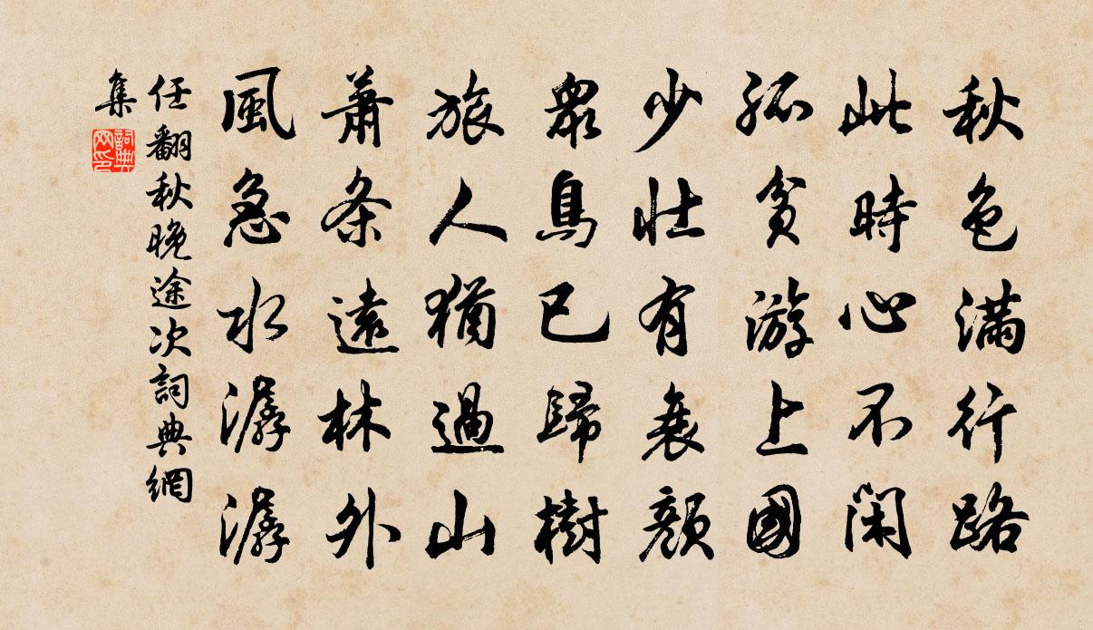 詩詞名句歷史字典書法欣賞書法字典國語詞典說文解字康熙字典古漢語字典標 題 作 者 詩 句 秋晚途次作者:任翻 朝代:唐代秋晚途次原文秋色滿行路,此時心不閒。孤貧游上國,少壯有衰顏。眾鳥已歸樹,旅人猶過山。蕭條遠林外,風急水潺潺。詩詞問答問:秋晚途次的作者是誰?答:任翻問:秋晚途次寫於哪個朝代?答:唐代問:秋晚途次是什麼體裁?答:五律任翻秋晚途次書法欣賞秋晚途次書法作品注釋全唐詩:卷727-31詩詞推薦次韻仇仁近有懷見寄十首方回〔宋代〕猶喜看書懶作詩,暮年自合省云為。預知陰雨骨骸痛,怯上好山筋力罷。不寐有時忘數息,無疑焉用扣歸奇。寄聲臨終偈釋祖珍〔宋代〕生本無生,死本無死。生死二途,了無彼此。南鄉子 次可行韻二首許有壬〔元代〕薄宦苦營營。半世長亭復短亭。一旦結茅當疊嶂,雲屏。朝暮陰晴幾樣青。濁酒瓦盆盛。農父無才卻有情。好雨知偈頌二十四首釋智遇〔宋代〕去時曉露消袢暑,歸日秋聲滿夕陽。恩渥重重何以報,望無雲處禍天長。杯盤吟邵雍〔宋代〕林下杯盤大寂寥,寂寥長願似今朝。君看擊鼓撞鍾者,勢去賓朋不易招。題創得齋乾隆〔清代〕西北谷猶迥,晴和爽拂晨。輕輿試深造,曲蹬宿知循。山景仍依舊,人情率喜新。賚籌英吉利,事亦創非陳。贈無擇老禪因觀稼鄭霖〔宋代〕兩年風雨為民愁,那得偷閒物外游。誰謂秋鴻留爪甲,吳儂一稔殿眉頭。喜覽裴中丞詩卷(一作寄裴使君)姚合〔唐代〕新詩盈道路,清韻似敲金。調格江山峻,功夫日月深。蜀箋方入寫,越客始消吟。後輩難知處,朝朝枉用心。王夷甫羅隱〔唐代〕把得閒書坐水濱,讀來前事亦酸辛。莫言麈尾清譚柄,壞卻淳風是此人。送瞿生還拜親晏殊〔宋代〕門標楊氏闕,家有漢皇書。射策淹前志,鳴榔省舊居。仙山人罕到,幽境畫難如。雲竇開賓館,芝田足歲儲。修詞趙河源幼子種蓮於盆池一乾開雙葉戲作小詩時陳文蔚〔宋代〕穉子堂前戲彩時,種蓮積水作盆池。間聞並萼窺紅影,誰識雙柯媚綠漪。莫胃微荄無妙意,也知造物等兒嬉。看看捕盜至栗洪嶺下道人庵滯留數日遣興喻良能〔宋代〕亂山深處小溪隈,夏木陰 * 半回。風岸欹斜對青竹,雨枝低重弄黃梅。濃愁難辦新詩語,吉耗聊傾濁酒杯。戲彩過葉道卿侍讀小園蔣堂〔宋代〕秀野亭連小隱堂,紅蕖綠條媚滄浪。卞山居士無歸意,卻借吳儂作醉鄉。飲謝公輔家晁補之〔宋代〕皇天於春自著意,安排未遣東皇家。朝雨已教潤壓土,曉風更將寒約花。詩篇驅使到老得,酒船拍浮即生涯。四年長安書事寄薛戴李端〔唐代〕朔雁去成行,哀蟬響如昨。時芳一憔悴,暮序何蕭索。笑語且無聊,逢迎多約略。三山不可見,百歲空揮霍。故事沁園春(七月朔壽盧守)姚勉〔宋代〕一葉新涼,又是西風,吹轉素商。攬玉壺英氣,鍾為人物,銀河精采,融作文章。司巧天公,攙先七夕,分付天孫舜江樓王冕〔元代〕舜江樓上一徘徊,四面雲山錦障開。於古豈徒賢二相,只今睍可致三台。月明鼓角空中起,風靜波濤地底回。別駕題馬氏草堂復齋聽雪張栻〔宋代〕平生求友人千里,永夜論心雪滿窗。為問 * 聽修竹,何如一舸泛清江。用韻奉寄孟嶠之仲並〔宋代〕剩喜今年琢句頻,仍聞燈火夜相親。懸知聳壑昂霄日,不負腰金托玉身。攻苦詩書如白屋,加鞭辭藻正青春。古來自門下後省歸臥酺池寺觀盧鴻草堂圖黃庭堅〔宋代〕黃塵逆帽馬辟易,歸來下簾臥書空。不知繡鞍萬人立,何如盧郎駕飛鴻。名句推薦不似天涯,捲起楊花似雪花。蘇軾《減字木蘭花·立春》 選賢於野,則治身業弘;求士子朝,則飾智風起。沈約《宋書·列傳·卷五十五》 無邊落木蕭蕭下,不盡長江滾滾來。杜甫《登高》 黃花本是無情物,也共先生晚節香。于謙《過菊江亭》 春秋代序,陰陽慘舒,物色之動,心亦搖焉。劉勰《文心雕龍·物色》 金河秋半虜弦開,雲外驚飛四散哀。杜牧《早雁》 舟覆乃見善游,馬奔乃見良御。劉安及其門客《淮南子·說林訓》 大漠孤煙直,長河落日圓。王維《使至塞上》 無言暗將紅淚彈。闌珊,香銷輕夢還。納蘭性德《河傳·春淺》 潭潭大度如臥虎,邊頭耕桑長兒女黃庭堅《送范德孺知慶州》