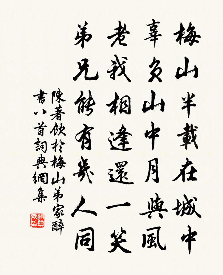 詩詞名句歷史字典書法欣賞書法字典國語詞典說文解字康熙字典古漢語字典標 題 作 者 詩 句 飲於梅山弟家醉書八首作者:陳著 朝代:宋代飲於梅山弟家醉書八首原文梅山半載在城中,辜負山中月與風。老我相逢還一笑,弟兄能有幾人同。詩詞問答問:飲於梅山弟家醉書八首的作者是誰?答:陳著問:飲於梅山弟家醉書八首寫於哪個朝代?答:宋代陳著飲於梅山弟家醉書八首書法欣賞飲於梅山弟家醉書八首書法作品詩詞推薦澆花喻良能〔宋代〕花木蒙沾潤,根堅枝亦驕。懸知如舌本,端藉酒杯澆。隋宮李商隱〔唐代〕紫泉宮殿鎖煙霞,欲取蕪城作帝家。玉璽不緣歸日角[1],錦帆應是到天涯。於今腐草無瑩火,終古垂楊有暮鴉曲江漁父李洞〔唐代〕兒孫閒弄雪霜髯,浪颭南山影入檐。臥穩篷舟龜作枕,病來茅舍網為簾。值春遊子憐蓴滑,通蜀行人說鱠甜。數尺齊天樂(吳興郡宴遇舊人)劉瀾〔宋代〕玉釵分向金華後,回頭路迷仙苑。落翠驚風,流紅逐水,誰信人問重見。花深半面。尚歌得新詞,柳家三變。綠葉題上虞南塔院齊唐〔宋代〕雁級指高冥,登瞻地域靈。路尋滄海斷,山帶沃洲青。八月九日晨興如廁有鴉啄蛆梅堯臣〔宋代〕飛烏先日出,誰知彼雌雄。豈無腐鼠食,來啄穢廁蟲。飽腹上高樹,跋觜噪西風。吉凶非予聞,臭惡在爾躬。物靈夜遊宮(美人)張鎡〔宋代〕鵲相龐兒誰有。兀底便、筆描不就。小邈如何敢出手。細端相,甚精神、甚洗漱。到老長廝守。不吃飯、也須唧次韻知縣兄夏夜古調蘇泂〔宋代〕非禽胡能飛,羽翰上青霄。非木胡能花,開謝隨驚飈。始予眷所生,於世免塵囂。頗知師寧蘧,貧樂富無驕。異哉送彭城周主簿建中移黃縣令賀鑄〔宋代〕客宦逢迎泗上州,酒籌詩卷慰淹留。九層燈火偃王塔,四面溪山彭祖樓。此去君辭棲棘地,年來吾有負薪憂。終期端午內中帖子詞夫人閣王珪〔唐代〕金縷黃龍扇,蘭芽翠釜湯。君王回浴殿,步輦正生香。賀幸普濟寺應制廣宣〔唐代〕南方寶界幾由旬,八部同瞻一佛身。寺壓山河天宇靜,樓懸日月鏡光新。重城柳暗東風曙,復道花明上苑春。向晚鷓鴣天高伯達〔宋代〕海上蟠桃月樣圓。從頭屈指幾千年。雙成已報春訊息,輸與蕭郎半月前。風露曉,月華鮮。獸爐煙裊水沉煙。騎鸞陪郡侯出郊勸農六絕洪咨夔〔宋代〕爭問官儂子謂誰,看來似不是農師。向人羞道閒陪涉,說與豳風七月詩。逍遙堂會宿二首〈並引〉蘇轍〔宋代〕轍幼從子瞻讀書,未嘗一日相舍。既壯,將遊宦四方,讀韋蘇州詩,至“安知風雨夜,復此對床眠”,惻然感之,感情於武陵〔唐代〕青山長寂寞,南望獨高歌。四海故人盡,九原新壟多。西沉浮世日,東注逝川波。不使年華駐,此生能幾何。常庵題范心遠〔宋代〕路入清溪第二灣,東風猶自逗餘寒。白雲粘地掃不去,黃葉戀枝吹未乾。沙上濕痕誰涉水,天邊長嘯獨憑闌。道人迎春花曹彥約〔宋代〕錦作薰籠越樣新,迎春猶及送還春。花時色與香如此,花後娟娟更可人。五福五代堂題句乾隆〔清代〕敷錫名垂洪範篇,祖功宗德已身肩。三朝厚幸雙文益,八袠初開五代全。苞茂即今看秩秩,旰宵唯是勵乾乾。奉時瑞香花新開五首楊萬里〔宋代〕馨德潛丘岳,春風是德還。新從眾香國,移種洞庭山。孤韻真無對,千花憂莫攀。騷經吾欲續,譜入芷蘅間。行路難五首楊萬里〔宋代〕長門陳阿嬌,卻要一生金屋貯嬌饒。長信班婕妤,卻要一生紈扇從玉車。妾心秪作專房地,別人亦有承恩意。妾心名句推薦何處營巢夏將半,茅檐煙里語雙雙。杜牧《村舍燕》 鳥飛反故鄉兮,狐死必首丘。屈原《九章》 甚獨抱清高,頓成淒楚。王沂孫《齊天樂·蟬》 命隨年欲盡,身與世俱忘;文天祥《除夜》 愛敬盡於事親,而德教加於百姓,刑於四海孔子及其弟子《孝經·天子》 帆影依依楓葉外,灘聲汩汩碓床間查慎行《雨過桐廬》 新年都未有芳華,二月初驚見草芽。韓愈《春雪》 安民可與為義,而危民易與為非賈誼《過秦論》 信命者,亡壽夭;信理者,亡是非;信心者,亡逆順;信性者,亡安危。列子及其弟子《列子·力命》 知賢之為明,輔賢之謂能,勉之強之,其福必長。荀子《荀子·解蔽》