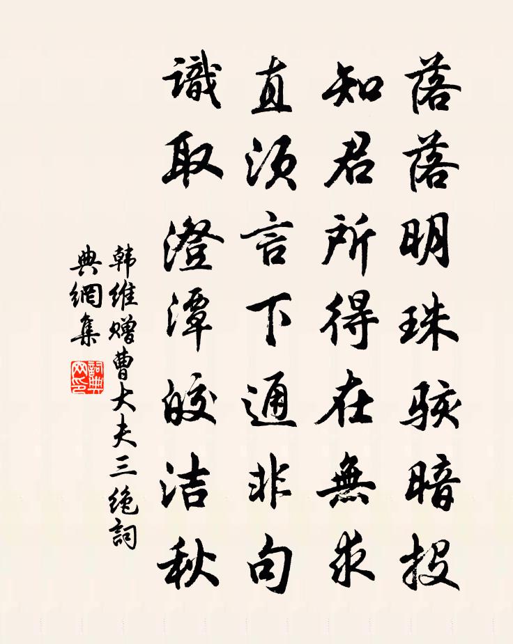 詩詞名句歷史字典書法欣賞書法字典國語詞典說文解字康熙字典古漢語字典標 題 作 者 詩 句 贈曹大夫三絕作者:韓維 朝代:宋代贈曹大夫三絕原文落落明珠駭暗投,知君所得在無求。直須言下通非句,識取澄潭皎潔秋。詩詞問答問:贈曹大夫三絕的作者是誰?答:韓維問:贈曹大夫三絕寫於哪個朝代?答:宋代韓維贈曹大夫三絕書法欣賞贈曹大夫三絕書法作品詩詞推薦浣溪沙汪莘〔宋代〕一曲清溪繞舍流。數間茅屋正宜秋。芙蓉灼灼出牆頭。元亮氣高還作令,少陵形瘦不封侯。村醪閒飲兩三甌。自嘲陸游〔宋代〕歲月惟遷萬事非,放翁可笑白頭痴。此生竟出古人下,有志尚如年少時。僻學固應知者少,長歌莫問和予誰。自嘲水調歌頭·冬至子之半魏了翁〔宋代〕冬至子之半,玉管罅微陽。壺中別有天地,轉覺日增長。一樣金章紫服,一樣朱顏綠髮,翁季儼相望。翁是修何行徐毅齋為東翔侄改字為存子陽枋〔宋代〕心酬萬事好深惟,來不須迎去莫隨。天理面前還他細,夢醒休似夢酣時。寄國香魚玄機〔唐代〕旦夕醉吟身,相思又此春。雨中寄書使,窗下斷腸人。山卷珠簾看,愁隨芳草新。別來清宴上,幾度落梁塵。曹侯善政頌黃庭堅〔宋代〕曹侯輟耕,學於上國。進士起家,為吏有績。雖窶人子,孔武且碩。我惠我威,養我好子。我勤我暇,不借吏史。螢衛宗武〔宋代〕本從腐草生,聚為寒士燈。一朝書課效,功寧不汝矜。古意·歡似機中絲吳偉業〔清代〕歡似機中絲,織作相思樹。儂似衣上花,春風吹不去。 點絳唇·春日風雨有感陳子龍〔明代〕滿眼韶華,東風慣是吹紅去。幾番煙霧,只有花難護。夢裡相思,故國王孫路,春無主!杜鵑啼處,淚染胭脂雨。陪諸公登廣福觀下望鼓蠡一首王阮〔宋代〕水繞一圍帶,山橫八字眉。壯哉極目地,慰此憑欄時。剡縣可乘興,渼陂真好奇。相逢休務日,因得數言詩。句張潞〔宋代〕柴垂戶外瞻天近,綠墮樓前到地香。東天目施樞〔宋代〕不謂山行得此晴,有名勝處必須經。玉田草滿春無極,石室人稀夜不扃。自料俗情應厭倦,誰知幽意在空冥。碧桃和文與可洋州園亭三十詠其八望雲樓蘇轍〔宋代〕雲生如湧泉,雲散如翻水。百變一憑欄,悠悠定誰使。百字令/念奴嬌徐經孫〔宋代〕八旬加二,荷君天垂祐,扶持老拙。目送新來檐外燕,手揀好花輕折。比似去年,十分強健,日看朱詩說。篇三百秋晚雜興陸游〔宋代〕置酒何由辦咄嗟,清言深媿淡生涯。聊將橫浦紅絲磑,自作蒙山紫筍茶。浣溪沙(和謙山)吳潛〔宋代〕春岸春風荻已芽,推排春事到蘆花。只應推上鬢邊華。投老未歸真左計,久陰得霽且舒懷。紅紅白白有殘葩。始生七章章八句上皇子嘉王生辰陳傅良〔宋代〕吾方貴吾生,相從多阽危。豈伊天地公,而獨及我私。於焉識仁端,一物豈忍遺。當思宇宙間,壽域鹹熙熙。清明書事曹勛〔宋代〕老來不復較三餘,只養恬愉守故居。新火又逢寒食節,故人誰寄一行書。隨人只得身康健,寓物須煩酒破除。剩讀飲牡丹高斯得〔宋代〕尚記年時醉我賓,抽簪起舞坐生春。誰呼七七逡巡手,重視三三夢幻身。獨樂園中老居士,沉香亭北謫仙人。吾今聞頂山徐道人改卜葉紹翁〔宋代〕先生新卜宅,只許白雲知。野蜜和峰割,岩花帶蝶移。坐諳苔石穩,醉忘木橋危。屋後寒梅放,因風寄一枝。名句推薦方以類聚,物以群分佚名《易傳·繫辭傳上·第一章》 吾聞馬周昔作新豐客,天荒地老無人識。李賀《致酒行》 方舟安可極,離思故難任!曹植《雜詩六首·其一》 此去與師誰共到,一船明月一帆風。韋莊《送日本國僧敬龍歸》 人間萬事,毫髮常重泰山輕。辛棄疾《水調歌頭·壬子三山被召陳端仁給事飲餞席上作》 福來有由,禍來有漸。陳壽《三國志·吳書·吳主五子傳》 民惟邦本,本固邦寧。佚名《尚書·夏書·五子之歌》 忽大風起,塵氣莽莽然,城市依稀而已。蒲松齡《山市》 冥冥寒食雨,客意向誰親?劉一止《冥冥寒食雨》 萬物迎春送殘臘,一年結局在今宵。戴復古《除夜》