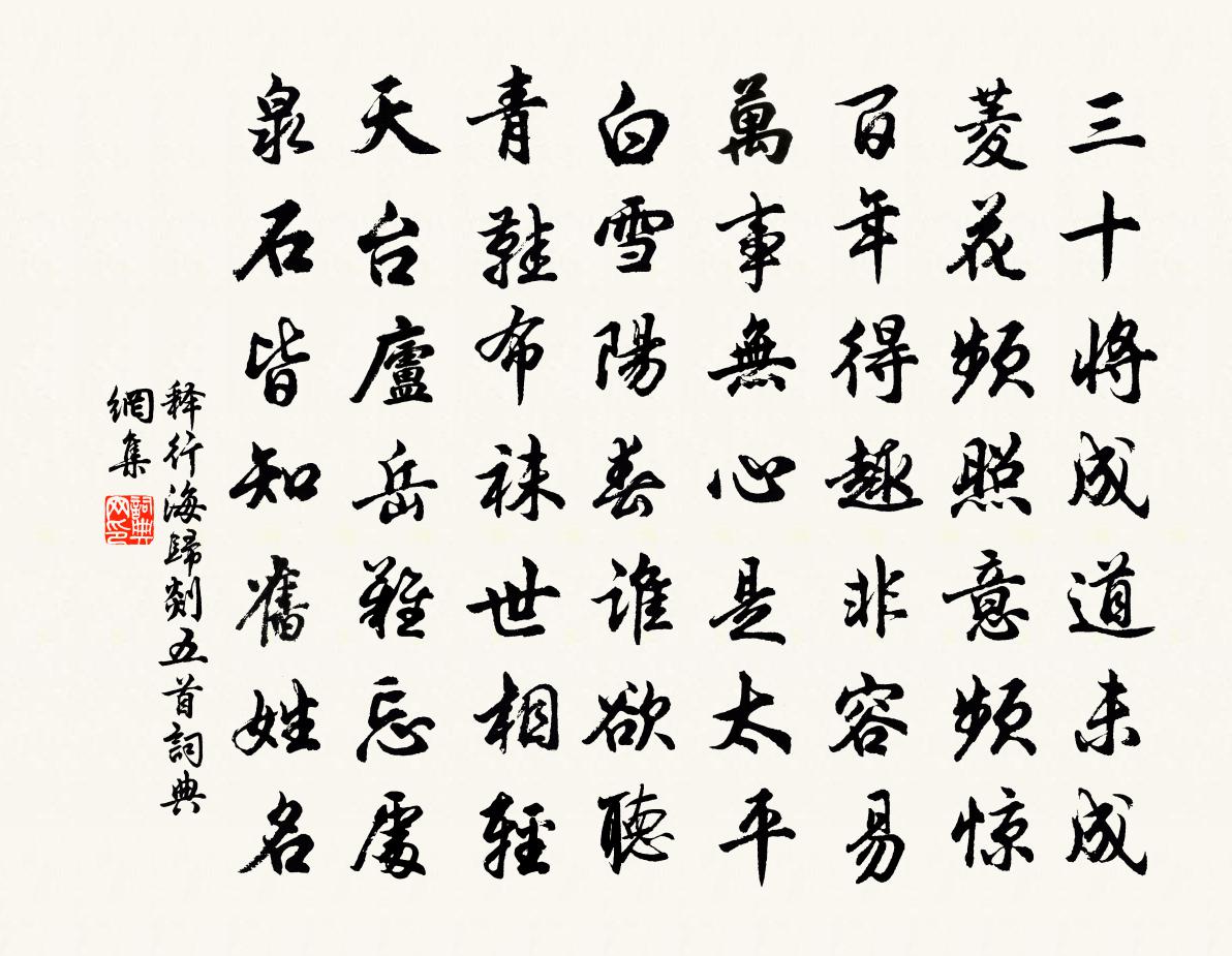 詩詞名句歷史字典書法欣賞書法字典國語詞典說文解字康熙字典古漢語字典標 題 作 者 詩 句 歸剡五首作者:釋行海 朝代:宋代歸剡五首原文三十將成道未成,菱花頻照意頻驚。百年得趣非容易,萬事無心是太平。白雪陽春誰欲聽,青鞋布襪世相輕。天台廬岳難忘處,泉石皆知舊姓名。詩詞問答問:歸剡五首的作者是誰?答:釋行海問:歸剡五首寫於哪個朝代?答:宋代釋行海歸剡五首書法欣賞歸剡五首書法作品詩詞推薦送楊晦叔提舉浙西並寄陳表道樓鑰〔宋代〕兩兩郎星映使星,老人星彩對晶明。褰帷共喜行畿甸,洗印仍欣就帝城。五馬況當恩始拜,三吳從此政尤清。便看遙賦義興潛泉李中〔唐代〕見說靈泉好,潺湲興莫窮。誰當秋霽後,獨聽月明中。濺石苔花潤,隨流木葉紅。何當化霖雨,濟物顯殊功。次韻仁近訝約予不至方回〔宋代〕風塵矯虔稱寡孤,疲甿暴骨紛痕瘏。驟得如願宮亭湖,鬼妾色悲充爾娛。老夫旅庖慳薪蔬,爨仆揶揄朝連晡。疇昔餞何君元赴汾陽儒諭何夢桂〔宋代〕雪月堂前冷掾廳,況如此邑甚於冰。行移太白西邊次,去占高青最上層。冷不然官舍燭,俸涼自糴太倉升。詩書莫自贊三首釋堅璧〔宋代〕三際斷,一亘空。轉不轉,功不功。迢迢物外像,矯矯岩間松。密密處不堪親近,荒林里得意相逢。靈溪房偶成陳著〔宋代〕隨雲入寶坊,寄憩正師房。醉枕老易醒,閒窗春亦忙。暄風□花氣,好客帶詩香。信美難久住,我家山水鄉。次韻尹朋梅花尤袤〔宋代〕江北江南天未春,陽和先已到孤根。斜枝冷落溪頭路,瘦影扶疏竹外村。水部未妨時遣興,玉妃誰復與招魂。天寒題游德昭壽藏名日復庵曾豐〔宋代〕劉伶未死先荷鍤,自負上超無礙法。死則已焉埋謂何,東坡猶笑未為達。之君之學齊死生,穴其吾屋屋吾穴。咽日重陽日陪韋卿宴朱灣〔唐代〕何必龍山好,南亭賞不暌。清規陳侯事,雅興謝公題。入座青峰近,當軒遠樹齊。仙家自有月,莫嘆夕陽西。再賦二首呈奇父陳與義〔宋代〕香遍東園花一枝,尋花覓路忽成迷。先生莫道心如鐵,喜氣朝來橫角犀。送赴省諸友徐懋功劉克莊〔宋代〕小陸詞章海內傳,名場久盍著先鞭。慣看餘子瓦樞壞,太息斯人鐵硯穿。疇昔薰香過半世,即今拾芥已中年。病翁東府雨中別子由蘇軾〔宋代〕庭下梧桐樹,三年三見汝。前年適汝陰,見汝鳴秋雨。去年秋雨時,我自廣陵歸。今年中山去,白首歸無期。客去離別難白居易〔唐代〕綠楊陌上送行人,馬去東回一望塵。不覺別時紅淚盡,歸來無可更沾巾。述九頌這節程公許〔宋代〕蘿門兮薜戶,宛其姝兮靜女。撫瑤琴兮清歌,歌不絕兮如縷。事君兮剛幾何,薺非甘兮蘗非苦。金石兮貞心,恩深早春閒遊張籍〔唐代〕年長身多病,獨宜作冷官。從來閒坐慣,漸覺出門難。樹影新猶薄,池光晚尚寒。遙聞有花發,騎馬暫行看。西湖夜景曾由基〔宋代〕處處芙蕖處處堂,閒行何地不清香。歸舟又趁機晚涼急,十里湖光蘸陽。浣溪沙(春夜)朱淑真〔宋代〕玉體金釵一樣嬌。背燈初解繡裙腰。衾寒枕冷夜香消。深院重關春寂寂,落花和雨夜迢迢。恨情和夢更無聊。頌古一百則釋正覺〔宋代〕曼殊問疾老毗耶,不二門開看作家。珉表粹中誰賞鑒,忘前失後莫咨嗟。區區抱璞兮楚庭臏士,璨璨報珠兮隋城斷聞桂衛宗武〔宋代〕山光水色染秋客,天際明霞一線紅。冉冉有香來鼻觀,廣寒花氣散晴空。郡齋水閣閒書湖橋文同〔宋代〕湖橋北頰花塢,水閣西頭竹村。霏霏薄霧紅暖,漠漠輕煙翠昏。名句推薦桃花落後蠶齊浴,竹筍抽時燕便來。朱彝尊《鴛鴦湖棹歌·一百首選二》 言不信者行不果。墨子《墨子·02章 修身》 楊柳乍如絲,故園春盡時。納蘭性德《菩薩蠻·問君何事輕離別》 懸衡而知平,設規而知圓。韓非及後人《韓非子·飾邪》 胡未滅,鬢先秋。淚空流。陸游《訴衷情·當年萬里覓封侯》 穿花蛺蝶深深見,點水蜻蜓款款飛杜甫《曲江二首》 青山霽後雲猶在,畫出東南四五峰。郎士元《柏林寺南望》 玉在櫝中求善價,釵於奩內待時飛。曹雪芹《紅樓夢·第一回》 湖山信是東南美,一望彌千里蘇軾《虞美人·有美堂贈述古》 飄飄何所似,天地一沙鷗。杜甫《旅夜書懷》