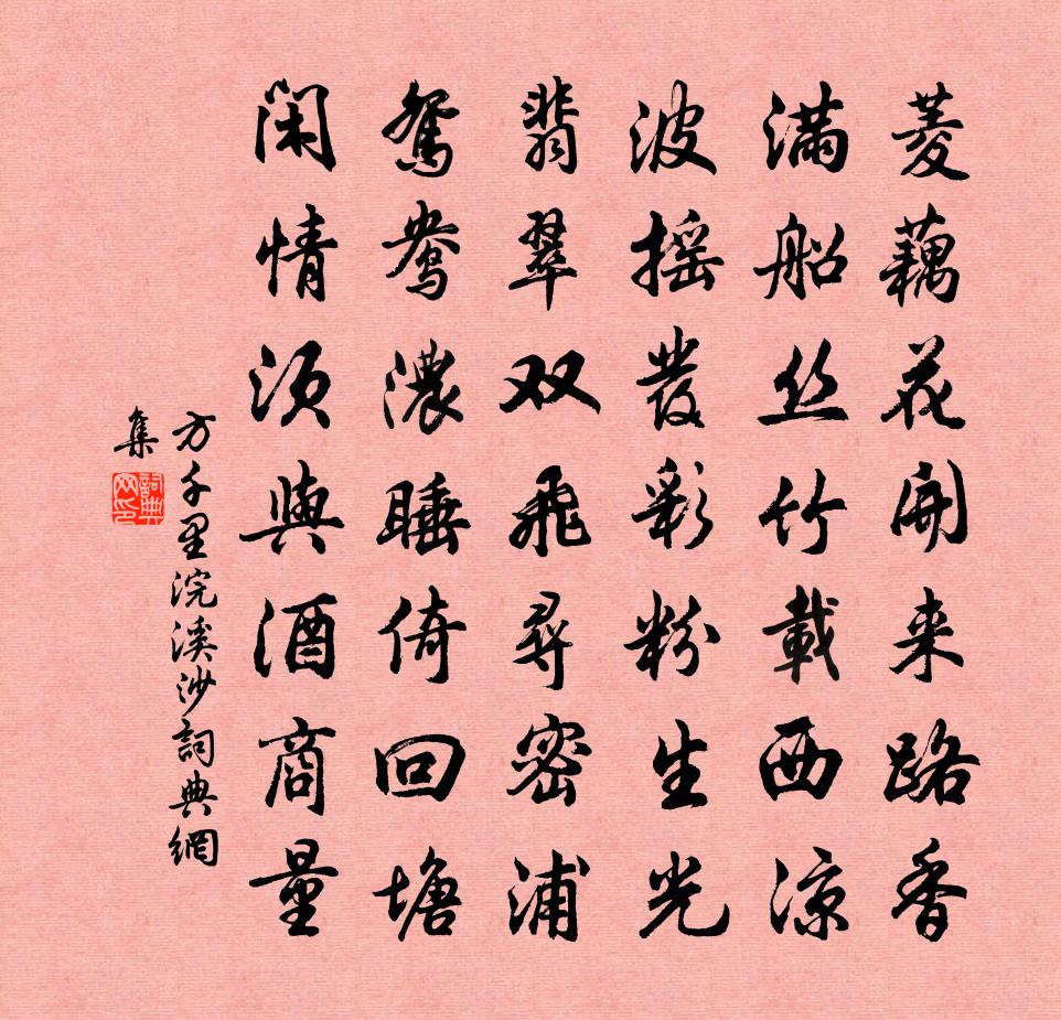 詩詞名句歷史字典書法欣賞書法字典國語詞典說文解字康熙字典古漢語字典標 題 作 者 詩 句 浣溪沙作者:方千里 朝代:宋代浣溪沙原文菱藕花開來路香。滿船絲竹載西涼。波搖發彩粉生光。翡翠雙飛尋密浦,鴛鴦濃睡倚回塘。閒情須與酒商量。詩詞問答問:浣溪沙的作者是誰?答:方千里問:浣溪沙寫於哪個朝代?答:宋代問:浣溪沙是什麼體裁?答:詞方千里浣溪沙書法欣賞浣溪沙書法作品詩詞推薦拈古十四首釋法薰〔宋代〕即心即佛,甜瓜甜徹蒂。非心非佛,苦瓠苦連根。不是心,不是佛,不是物,斫卻月中桂,清光迸海門。個裹若能寒山拾得望月贊釋法薰〔宋代〕木葉題詩,寺廚執爨。遇夜乘閒,林間舒散。一片冰壺無影像,分明照破渠肝膽。堪笑當時天台山中,也無一個具送人游江南杜荀鶴〔唐代〕滿酌勸君酒,勸君君莫辭。能禁幾度別,即到白頭時。晚岫無雲蔽,春帆有燕隨。男兒兩行淚,不欲等閒垂。安陽好(九之七)王安中〔宋代〕安陽好,曲水似山陰。咽咽清泉岩溜細,彎彎碧甃篆痕深。永晝坐披襟。紅袖小,歌扇畫泥金。鴨綠波隨雙葉轉,題汪水雲詩卷十首胡斗南〔宋代〕越舞吳謳別幾春,御船坊下即迷律。年來依舊多游賞,半是南人半北人。約張處士游梁譚用之〔唐代〕莫學區區老一經,夷門關吏舊書生。晉朝滅後無中散,韓國亡來絕上卿。龍變洞中千谷冷,劍橫天外八風清。好攜新晴讀樊川詩楊萬里〔宋代〕江妃瑟里芰荷風,淨掃痴雲展碧穹。嫩熱便嗔疏小扇,斜陽酷愛弄飛蟲。九千刻里春長雨,萬點紅邊花又空。不是紹興朝日十首佚名〔宋代〕[圜鍾為宮]玄鳥既至,序屢春分。朝於太陽,厥典地存。載嚴大采,示民有尊。揚光下蠲,煜燁工門。蘇幕遮高道寬〔元代〕這無為,先天造。有有無無,端的無窮妙。最上不空誰曾到。強曰為名,假作字之號。道真常,大秘奧。覺象圓明倪昭卿賦贈葉神童白玉蟾〔宋代〕神童天縱何聰明,十幅一息增榮名。若非唐朝李太白,靖通真人當復生。擊石轟雷驚四座,寶卷拈出安群情。八卦搗練子 離塵馬鈺〔元代〕離塵綱,出凡籠。*頭垢面類愚蒙。眼如盲,耳如聾。金為箭,玉為弓。木人射透水晶宮。赴蓬瀛,玉路通。經劍池祖無擇〔宋代〕巧冶何年百鍊金,刜鍾芒刃此湮沉。氣沖牛斗雖難掩,鑒遇張雷始見尋。恍惚莫窮神物遠,波瀾空在曲池深。鉛刀崇聖寺別楊至之許渾〔唐代〕蕭寺暫相逢,離憂滿病容。寒齋秋少燕,陰壁夜多蛩。樹暗水千里,山深雲萬重。懷君在書信,莫過雁回峰。採薇(節選)佚名〔先秦〕昔我往矣,楊柳依依。今我來思,雨雪霏霏。行道遲遲,載渴載飢。我心悲傷,莫知我哀!紹興祀皇地祗十五首佚名〔宋代〕坤元博厚,對越天明。展事方澤,稟惟顧歆。嘉玉量幣,祗牙純精。錫我繁祉,燕及函生。天津感事二十六首邵雍〔宋代〕名利從來本任才,行人不用苦相猜。壺中日月長多少,閒步天津看往來。出關和雷侍郎送行無魔不成佛觀過始知仁之句陳杰〔宋代〕事來思爛熟,罪去得深循。天壤嗟微義,風霜本至仁。十年江社夢,一道雪梅春。回首無他囑,當言莫愛身。次韻酬吳彥珍見寄二首王安石〔宋代〕篁竹荒茅五畝余,生涯山蕨與泉魚。家貧殖貨羞端木,鄉里傳書比仲舒。白日憶君聊遠望,青林嗟我似逃虛。春風舟中病思三首趙蕃〔宋代〕日腳陰晴屢,船身坐臥俱。溪山無入望,覊旅孰為娛。路識長安近,名非短策圖。無迷蔡謨蟹,且覓季鷹鱸。家園即事十三首鄭清之〔宋代〕書帶環生繚岸青,葉間蟲篆學陽冰。墨池文冢非難化,芝菌從教子厚蒸。名句推薦誠者,不勉而中不思而得:從容中道,聖人也。子思《中庸·第二十章》 之子歸窮泉,重壤永幽隔。潘安《悼亡詩三首》 人不通今古,馬牛如襟裾。佚名《增廣賢文·上集》 六曲闌乾偎碧樹,楊柳風輕,展盡黃金縷。馮延巳《鵲踏枝·清明》 匝路亭亭艷,非時裛裛香。李商隱《十一月中旬至扶風界見梅花》 明月幾時有?把酒問青天。蘇軾《水調歌頭·丙辰中秋》 小娃撐小艇,偷采白蓮回。白居易《池上》 試玉要燒三日滿,辨材須待七年期。白居易《放言五首·其三》 上醫醫國,其次疾人左丘明《國語·晉語·醫和視平公疾》 斷虹霽雨,淨秋空,山染修眉新綠。黃庭堅《念奴嬌·斷虹霽雨》
