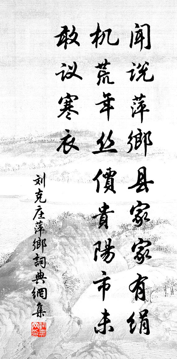 詩詞名句歷史字典書法欣賞書法字典國語詞典說文解字康熙字典古漢語字典標 題 作 者 詩 句 萍鄉作者:劉克莊 朝代:宋代萍鄉原文聞說萍鄉縣,家家有絹機。荒年絲價貴陽市,未敢議寒衣。詩詞問答問:萍鄉的作者是誰?答:劉克莊問:萍鄉寫於哪個朝代?答:宋代問:劉克莊的名句有哪些?答:劉克莊名句大全劉克莊萍鄉書法欣賞萍鄉書法作品詩詞推薦送史申之峽州司空曙〔唐代〕峽口巴江外,無風浪亦翻。蒹葭新有雁,雲雨不離猿。行客思鄉遠,愁人賴酒昏。檀郎好聯句,共滯謝家門。江下初秋寓泊杜荀鶴〔唐代〕濛濛煙雨蔽江村,江館愁人好斷魂。自別家來生白髮,為侵星起謁朱門。也知柳欲開春眼,爭奈萍無入土根。兄弟辛亥元日送章德茂自建康移帥江陵二首楊萬里〔宋代〕極知借寇未多時,道是微黃有近期。不割半青江令宅,卻飛大白習家池。湖山解語云來暮,淮水無情也去思。莫近水調歌頭(壽楊憲)章斯才〔宋代〕秋老楚天闊,光粲極南星。郁蔥瑞靄浮動,湘水舞湘靈。方啟流虹華旦,恰值紱麟彌月,嘉會慶千齡。維岳絳神處玉樓春·尊前擬把歸期說歐陽修〔宋代〕尊前擬把歸期說。未語春容先慘咽。人生自是有情痴,此恨不關風與月。離歌且莫翻新闋。一曲能教腸寸結。直須菩薩蠻·鳳凰相對盤金縷溫庭筠〔唐代〕鳳凰相對盤金縷,牡丹一夜經微雨。明鏡照新妝,鬢經雙臉長。畫樓相望久,欄外垂絲柳。音信不歸來,社前雙燕無眠虞儔〔宋代〕蛩吟砌下豈知時,我亦無眠有所思。夜永只憐燈作伴,秋涼最許簟先知。十年擾擾夢中事,一笑悠悠世上兒。數盡次花翁自笑韻杜范〔宋代〕村翁活計謝田莊,肯與時人較短長。餘事詩篇陵鮑謝,太平胸次到黃唐。以通為隱渾無礙,有樂償貧似略當。自笑句顏棫〔宋代〕衰草連天慘澹黃。閒居陸游〔宋代〕廚給胡麻粒,山供鹿脯盤。掃門遲客至,入郭借書看。句晃逈〔宋代〕清興比方心境妙,月明池淨白蓮開。邵伯埭下寄高郵陳郎中徐鉉〔唐代〕故人相別動經年,候館相逢倍慘然。雇我飲冰難輟棹,感君扶病為開筵。河灣水淺翹愁鷺,柳岸風微噪暮蟬。欲識送徐性初歸隆興董嗣杲〔宋代〕歲華須鬢里,行色水雲中。南徑寒花在,西山落葉空。別憐今夜酒,歌續古人風。歸隱東湖上,忘機狎釣翁。和許端夫兄弟二首時端夫出守當塗王之道〔宋代〕相喜何須日寄聲,如君無處不知名。縱觀妙墨雲煙動,想見新詩欬唾成。帶雪山川增綺麗,向春梅柳自欣榮。好將林檢院琦第一百三十五文天祥〔宋代〕時危挹佳士,慘澹隨回鶻。佯狂真可哀,死淚終映睫。句張鎡〔宋代〕空對爛銀盤。寶劍吟陸游〔宋代〕幽人枕寶劍,殷殷夜有聲。人言劍化龍,直恐興風霆;不然憤狂虜,慨然思遐征。取酒起酹劍:至寶當潛形,豈無仆在會稽泛舟至剡中是時雪遲梅子煙外萬枝夾王銍〔宋代〕山回水轉碧玲瓏,月在群山四合中。香滿一船梅勝雪,休夸訪戴畫屏風。石季平嘗為於仲模詩改二字後仲模有詩來復用鄭剛中〔宋代〕趙璧微瑕豈易改,抉磨深賀得良工。古人規誨有餘樂,近世交朋無此風。二字相裨何預我,一篇兼報重煩公。新吟春愁曲溫庭筠〔唐代〕紅絲穿露珠簾冷,百尺啞啞下纖綆。遠翠愁山入臥屏,兩重雲母空烘影。涼簪墜發春眠重,玉兔熅香柳如夢。錦疊名句推薦但見淚痕濕,不知心恨誰。李白《怨情》 林表明霽色,城中增暮寒。祖詠《終南望余雪》 習讀書之業,便當知讀書之樂王永彬《圍爐夜話·第五五則》 空山不見人,但聞人語響。王維《鹿柴》 從善如登,從惡如崩司馬光《資治通鑑·魏紀·魏紀三》 晚來天欲雪,能飲一杯無?白居易《問劉十九》 從今若許閒乘月,拄杖無時夜叩門。陸游《游山西村》 自伐者無功;自矜者不長。老子《老子·道經·第二十四章》 天平山上白雲泉,雲自無心水自閒。白居易《白雲泉》 勞心者治人,勞力者治於人。孟子《孟子·滕文公章句上·第四節》
