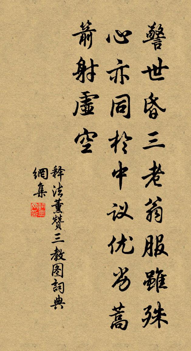 詩詞名句歷史字典書法欣賞書法字典國語詞典說文解字康熙字典古漢語字典標 題 作 者 詩 句 贊三教圖作者:釋法薰 朝代:宋代贊三教圖原文警世昏,三老翁,服雖殊,心亦同。於中議優劣,蒿箭射虛空。詩詞問答問:贊三教圖的作者是誰?答:釋法薰問:贊三教圖寫於哪個朝代?答:宋代釋法薰贊三教圖書法欣賞贊三教圖書法作品詩詞推薦田無秋興蒲壽宬〔宋代〕草屋柴門風露涼,寒瓜收蔓力鋤荒。新栽莙薘恰逢雨,欲剪芹藍猶待霜。牧豎歸來煨芋熟,田翁相就潑醅香。里胥浣溪紗/浣溪沙朱淑真〔宋代〕春巷夭桃吐絳英。春衣初試薄羅輕。風和煙暖燕巢成。小院湘簾閒不捲,曲房朱戶悶長扃。惱人光景又清明。癸未生朝躔父公父以酒肴而華其陋賦一絕陳藻〔宋代〕家貧何敢知生朝,多謝開尊慰寂寥。要跡一杯辭不受,便埯拙句作瓊瑤。玉燭新(海棠)方千里〔宋代〕海棠初雨後。似露粉妝成,肉紅團就。太真帳里,春眠醒、緩蹙樓前宮漏。潮生酒暈,獨自倚、闌乾時候。吹鬢影南鄉子佚名〔宋代〕淨盡露天機。只恐時人自執迷。頷下藏珠當猛取,休遲。道在身中更問誰。塵網急拋離。百歲年華七十稀。莫待老漁舟文天祥〔宋代〕一陣飛帆破碧煙,兒郎驚餌理弓弦。舟中自信婁師德,海上誰知魯仲連。初謂悠揚真賊艦,後聞欸乃是漁船。人生秋日送僧釋重顯〔宋代〕邊雁影邪,寒蟬聲速。乘時毳流,遠別岩谷。林驚一葉兮微風觸袖,水肅百川兮片月在目。因憶象骨老師曾送人,九日懷友趙希桐〔宋代〕江蟹初肥天欲霜,莫雲紅樹寫秋光。西風攜手登臨地,今日黃花兩處香。過明田寺會楊李二生於碧玉三首胡寅〔宋代〕已宅連延紫蓋椒,尋山依舊不辭遙。借床未暇桑三宿,解飯還須水一瓢。風外野雲俱淡盪,雨余秋氣亦蕭條。故人玉照堂梅花飄落如雪張鎡〔宋代〕陣陣翻空迴旋飛,綴巾沾袖卻橫吹。東風秘授看花訣,不在開時在落時。十一月十三日夜作陸游〔宋代〕風雪正相乘,蕭然一點燈。擁爐蒙衲被,就壁倚枯藤。火降神方王,河潮腦自凝。鄰雞太多事,三唱請晨興。勸世呂岩〔唐代〕一毫之善,與人方便。一毫之惡,勸君莫作。衣食隨緣,自然快樂。算是甚命,問什麼卜。欺人是禍,饒人是福。五哀詩李牧司馬光〔宋代〕椎牛饗壯士,拔距養奇材。虜帳方驚避,秦金已闇來。旌旗移幕府,荊棘蔓叢台。部曲依稀在,猶能話郭開。登疊彩山劉台〔明代〕嵯峨怪石倚雲間,洞銷煙霞六月寒。 我到登臨花正好,憑欄指點幾回看。 尚方崖赴劉次山館見過張埴〔宋代〕梅陰踏雨拾落花,鴉鴉溪上來筍車。插頭林隙不敢問,怕是天落山人家。入門涵衣花雨濕,執手無言惟作泣。十年春盡後園閒步邵雍〔宋代〕綠樹成陰日,黃鶯對語時。小渠初瀲灩,新竹正參差。倚杖疔吟久,攜童引步遲。好風知我意,故故向人吹。種花二首蘇轍〔宋代〕築室力已盡,種花功尚疏。山丹得春雨,艷色照庭除。末品何曾數,群芳自不如。今秋接千葉,試取洛人余。老將效唐人體陸游〔宋代〕寶劍夜長鳴,金痍老未平。指弓夸野戰,抵掌說番情。已矣黑山戍,悵然青史名。和親不用武,教子作儒生。偶詩五首司空圖〔唐代〕閒韻雖高不衒才,偶拋猿鳥乍歸來。夕陽照個新紅葉,似要題詩落硯台。芙蓉騷客空留怨,芍藥詩家只寄情。誰似洋州三十景獲浦鮮于侁〔宋代〕凝霜壓寒蘆,白月鋪淨練。誰起落梅聲,愁人淚如霰。名句推薦土膏欲動雨頻催,萬草千花一餉開;范成大《春日田園雜興》 早是他鄉值早秋,江亭明月帶江流。王勃《秋江送別二首》 昨夜更闌酒醒,春愁過卻病。李璟《應天長·一鉤初月臨妝鏡》 不知天外雁,何事樂長征?徐禎卿《在武昌作》 在天成象,在地成形。脫脫《宋史·志·卷五十二》 想得玉人情,也合思量我。孫光憲《生查子·窗雨阻佳期》 古宮閒地少,水港小橋多。杜荀鶴《送人游吳》 令公桃李滿天下,何用堂前更種花。白居易《奉和令公綠野堂種花》 鳥無聲兮山寂寂,夜正長兮風淅淅。李華《弔古戰場文》 寄意寒星荃不察,我以我血薦軒轅。魯迅《自題小像》