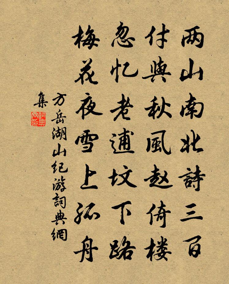 詩詞名句歷史字典書法欣賞書法字典國語詞典說文解字康熙字典古漢語字典標 題 作 者 詩 句 湖山紀游作者:方岳 朝代:宋代湖山紀游原文兩山南北詩三百,付與秋風趙倚樓。忽憶老逋墳下路,梅花夜雪上孤舟。詩詞問答問:湖山紀游的作者是誰?答:方岳問:湖山紀游寫於哪個朝代?答:宋代方岳湖山紀游書法欣賞湖山紀游書法作品詩詞推薦護國天王院故神霄玉清萬壽宮也廢圮略盡而規陸游〔宋代〕太霄帝君神霄府,一日璽書行海寓。築宮奔走誰敢後,萬牛挽材山作礎。步虛夜半落雲間,玉磬漻漻鸞鶴舞。帝師小道吟邵雍〔宋代〕藝雖小道,事亦系人。苟不造微,焉能入神。白鷺亭和人韻馬之純〔宋代〕一見斯亭喜可知,風來拂拂更清微。青山坐處天開畫,白鷺飛時雪滿磯。何必搜奇效康樂,正應得句似玄暉。最憐和陳府教授見贈戴埴〔宋代〕遺風洙車濱,汲古酌犧樽。魚躍進池藻翻,鶯呼和浩特庭樹喧。樂山不樂水,居城猶居村。渚宮蘇轍〔宋代〕楚寒多秋水,荊王有故宮。湘東晉宗子,高氏楚元戎。鑿沼長千尺,開亭費萬工。故樞密簽書贈正議大夫王彥霖輓詞二首蘇轍〔宋代〕傾蓋晚相親,東西省戶鄰。聽君占諫草,繼我出詞綸。京尹聲初浹,樞廷跡尚新。鄞鄲炊未熟,榮謝隔逡巡。偈頌一百二十三首釋崇岳〔宋代〕冶父方丈,了無遮障。拳踢相應,當仁不讓。妙轉綿綿一脈通,誰知滅卻臨濟宗。浣溪沙(四之三)張綱〔宋代〕象服華年兩鬢青。喜逢生日是嘉平。何妨開宴雪初晴。酒勸十分金鑿落,舞催三疊玉娉婷。滿堂歡笑祝椿齡。頌古四十五首釋慧遠〔宋代〕唱拍相隨特地新,舞衣歌版不須呈。雲間獨有簫韶曲,未肯流傳取次人。浣溪沙周邦彥〔宋代〕樓上晴天碧四垂,樓前芳草接天涯。勸君莫上最高梯。新筍已成堂下竹,落花都上燕巢泥,忍聽林表杜鵑啼。依韻和李持正晚晴出謁王子高馬上口占之作強至〔宋代〕謫仙醉跨玉鯨鱗,夷甫名談喜更聞。照眼暖光開野日,入懷晴氣散江雲。塵埃洗去人家好,空闊飛來鳥翼勤。莫望題趙昌父山居八詠苔竹軒楊萬里〔宋代〕青士長得瘦,翠兄工買貧。向來素愛者,已賺一詩人。病中宿宜陽館聞雨李約〔唐代〕難眠夏夜抵秋賒,簾幔深垂窗燭斜。風吹桐竹更無雨,白髮病人心到家。送杜鵑花吳融〔唐代〕春紅始謝又秋紅,息國亡來入楚宮。應是蜀冤啼不盡,更憑顏色訴西風。許宰和篇至再用韻謝王邁〔宋代〕陶令束帶督郵讀,歸來高興潛有激。昌黎縣齋飽讀書,自謂此日足可惜。二賢詩留天地間,千載寶之為雙璧。當官定風波·感舊蘇軾〔宋代〕莫怪鴛鴦繡帶長,腰輕不勝舞衣裳。薄倖只貪遊冶去,何處,垂楊系馬恣輕狂。花謝絮飛春又盡,堪恨。斷弦塵管白蓮花釋惠日〔宋代〕神物何由測,芬陀陸地興。素芳呈玉雪,梵剎筆丘陵。換額從偏霸,縣碑自老僧。扎勤勤來者,期使續千燈。秋詞陸游〔宋代〕東吳七月暑未艾,川雲忽興天晝晦。蔽空雨點弩發機,平地成渠屋穿背。早禾玉粒自天瀉,村北村南喧地碓。大牲從駕玉津園二首曹勛〔宋代〕天子行春御六龍,五雲回暖泛晴風。和鸞寶苑梅花路,剩有香傳玉座中。喜翁文堯員外病起黃滔〔唐代〕衛玠羊車懸,長卿駟馬姿。天嫌太端正,神乃減風儀。飲冰俾消渴,斷谷皆清羸。越僧夸艾炷,秦女隔花枝。自能名句推薦人生如逆旅,我亦是行人。蘇軾《臨江仙·送錢穆父》 至今思項羽,不肯過江東。李清照《夏日絕句》 窮則獨善其身,達則兼善天下。孟子《孟子·盡心章句上·第九節》 颯颯西風滿院栽,蕊寒香冷蝶難來。黃巢《題菊花》 亂花漸欲迷人眼,淺草才能沒馬蹄。白居易《錢塘湖春行》 忠臣不借人以力,貞女不假人以色。劉向《列女傳·貞順傳·楚白貞姬》 支離東北風塵際,漂泊西南天地間。杜甫《詠懷古蹟五首·其一》 楚江湄,湘娥乍見,無言灑清淚周密《繡鸞鳳花犯·賦水仙》 茅檐長掃淨無苔,花木成畦手自栽。王安石《書湖陰先生壁》 洛陽城裡見秋風,欲作家書意萬重。張籍《秋思》