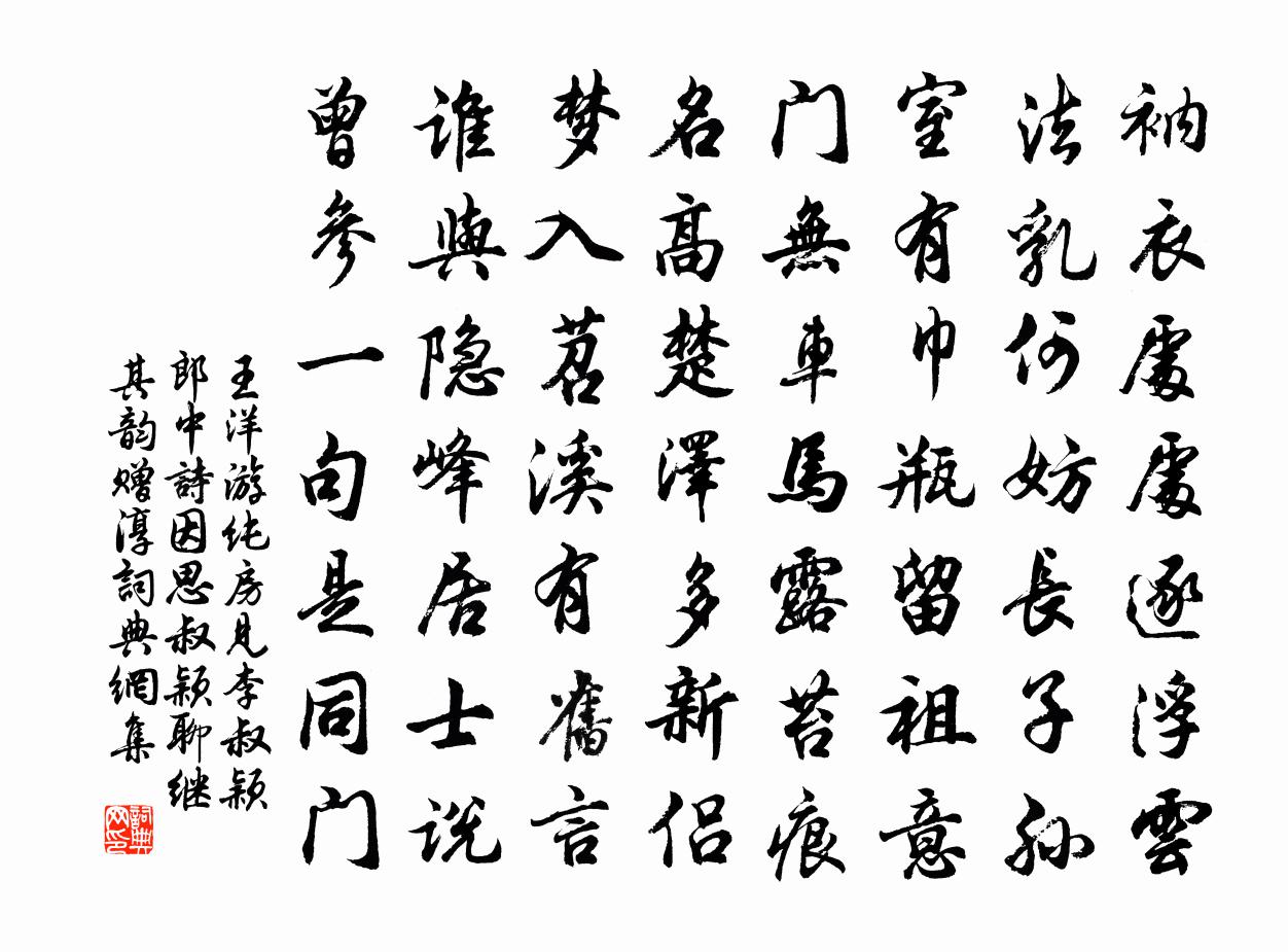 詩詞名句歷史字典書法欣賞書法字典國語詞典說文解字康熙字典古漢語字典標 題 作 者 詩 句 游純房見李叔穎郎中詩因思叔穎聊繼其韻贈淳作者:王洋 朝代:宋代原文衲衣處處逐浮雲,法乳何妨長子孫。室有巾瓶留祖意,門無車馬露苔痕。名高楚澤多新侶,夢入苕溪有舊言。誰與隱峰居士說,曾參一句是同門。詩詞問答問:《游純房見李叔穎郎中詩因思叔穎聊繼其韻贈淳》的作者是誰?答:王洋問:該詩寫於哪個朝代?答:宋代書法欣賞游純房見李叔穎郎中詩因思叔穎聊繼其韻贈淳書法作品詩文賞析【原題】:游純房見李叔穎郎中詩因思叔穎聊繼其韻贈淳化禪師詩詞推薦瀟湘神黃公紹〔宋代〕望湖天。望湖天。綠楊深處鼓鼘鼘。好是年年三二月,湖邊日日看划船。送盛寺丞鄭獬〔宋代〕蕭相關中守,元瑜鄴下豪。秋風嘶白馬,路草照青袍。地入參旗近,河連積石高。當年兵戰處,尊酒屬吾曹。舟中即事楊萬里〔宋代〕阿翁阿囝自相隨,賞遍江淮春盛時。熊白同嘗臘前酒,雌黃自改曉間詩。醉來忽笑天地窄,老去那能兒女悲。身後春雨陸游〔宋代〕擁被聽春雨,殘燈一點春。吾兒歸漸近,何處宿長亭?謝師恩 警俗回心王處一〔元代〕好兒好女心頭氣。生死難相替。不測無常先到你。皮囊臭爛,骨骸分散,空惹冤家淚。悟來不使心猿戲。慧劍磨教和竟陵王遊仙詩沈約〔南北朝〕夭矯乘絳仙。螭衣方陸離。玉鑾隱雲霧。溶溶紛上馳。瑤颱風不息。赤水正漣漪。崢嶸玄圃上。聊攀瓊樹枝。木蘭花/玉樓春莫將〔宋代〕清姿自是生寒瘦。更在春前並臘後。誰教六出巧遮藏,爭似一番先透漏。謝娘莫把翻衣袖。無限瓊英飄玉甃。開時亂定到邑蕭澥〔宋代〕蒙蒙野草自榮華,破屋夾茅人賣茶。滿巷門基帶磚石,有時認得故人家。寄馮使君貫休〔唐代〕端居碧雲暮,好鳥啼紅芳。滿郭桃李熟,捲簾風雨香。清吟繡段句,默念芙蓉章。未得歸山去,頻升謝守堂。吳起守信宋濂〔明代〕昔吳起出,遇故人,而止之食。故人曰:“諾,期返而食。”起曰:“待公而食。”故人至暮不來,起不食待之。呈菊坡先生陳樞使宋伯仁〔宋代〕但知猿鶴伴閒居,不覺憂時鬢已疏。對客怕言今日事,挑燈重讀少年書。樓迎山色詩堪畫,門對梅花月共鋤。相業落花十絕馮時行〔宋代〕著花著酒苦相留,嗔雨嗔風畢竟休。有熊游揚元嫵媚,無心點綴亦風流。頌古十九首釋慧暉〔宋代〕重重去儘自平常,春暖風和日漸長。戶外鳥啼聲細碎,岩花狼藉滿山房。澄水如鑒崔顥〔唐代〕聖賢將立喻,上善貯情深。潔白依全德,澄清有片心。澆浮知不撓,濫濁固難侵。方寸懸高鑒,生涯詎陸沉。對泉見京兆韋參軍量移東陽其二李白〔唐代〕聞說金華渡。東連五百灘。全勝若耶好。莫道此行難。猿嘯千溪合。松風五月寒。他年一攜手。搖艇入新安。中春愴懷寄二三知己齊己〔唐代〕眼暗心還白,逢春強憑欄。因聞積雨夜,卻憶舊山寒。竹撼煙叢滑,花燒露朵乾。故人相會處,應話此衰殘。頌石頭和尚草庵歌釋印肅〔宋代〕方丈老人相體解,一默全包無小大。曼殊讚嘆實希奇,問疾不任知自敗。偈釋省回〔宋代〕南番人泛船,塞北人搖艫。波斯入大唐,須彌山作舞。朝中措(丙午立春大雪,是歲十二月九日丑時立春)范成大〔宋代〕東風半夜度關山。和雪到闌乾。怪見梅梢未暖,情知柳眼猶寒。青絲菜甲,銀泥餅餌,隨分杯盤。已把宜春縷勝,盧懷慎徐鈞〔宋代〕曹參尚守蕭何法,鮑叔慚分管仲權。莫笑當時呼伴食,元之秉國恐妨賢。名句推薦瘦雪一痕牆角,青子已妝殘萼。王庭筠《謁金門·雙喜鵲》 生死有命,富貴在天。佚名《增廣賢文·上集》 春如舊。人空瘦。淚痕紅浥鮫綃透。陸游《釵頭鳳·紅酥手》 吳洲如見月,千里幸相思。李白《送張舍人之江東》 借問酒家何處有?牧童遙指杏花村。杜牧《清明》 眾芳搖落獨暄妍,占盡風情向小園。林逋《山園小梅二首》 釀泉為酒,泉香而酒洌;歐陽修《醉翁亭記》 馬嘶人散後,秋風換、故園夢裡。吳文英《丁香結·夷則商秋日海棠》 狂夫之言,聖人擇焉。司馬遷《史記·七十列傳·淮陰侯列傳》 一生之內, 當無愧古人姚察、姚思廉《梁書·列傳·卷二十九》