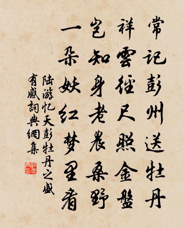常記彭州送牡丹,祥雲徑尺照金盤。豈知身老農桑野,一朵妖紅夢裡看。