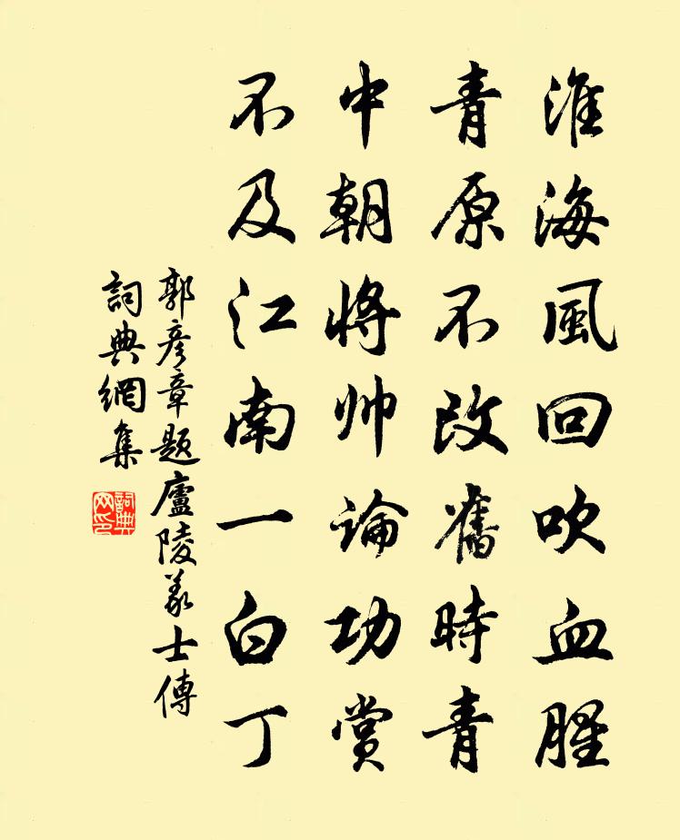 詩詞名句歷史字典書法欣賞書法字典國語詞典說文解字康熙字典古漢語字典標 題 作 者 詩 句 題廬陵義士傳作者:郭彥章 朝代:宋代題廬陵義士傳原文淮海風回吹血腥,青原不改舊時青。中朝將帥論功賞,不及江南一白丁。詩詞問答問:題廬陵義士傳的作者是誰?答:郭彥章問:題廬陵義士傳寫於哪個朝代?答:宋代郭彥章題廬陵義士傳書法欣賞題廬陵義士傳書法作品詩詞推薦溪上春望羅鄴〔唐代〕無端溪上看蘭橈,又是東風斷柳條。雙鬢多於愁里鑷,四時須向酬中銷。行人駿馬嘶香陌,獨我殘陽倚野橋。吟水和裴延齡尚書寄題果州謝舍人仙居盧綸〔唐代〕飄然去謁八仙翁,自地從天香滿空。紫蓋迥標雙鶴上,語音猶在五雲中。青溪不接漁樵路,丹井唯傳草木風。歌此題山谷姚黃梅花朱翌〔宋代〕姚花富貴江梅妙,俱是花中第一流。戲出小詩花一樣,先生下筆與春謀。寄友人陳觀〔宋代〕廢書開復卷,寧與世浮沉。萬事自有分,一生閒用心。天寒快征馬,日暮急歸禽。多少隆中客,空為抱膝吟。以鑒贈趙制置袁燮〔宋代〕吁嗟此鑒,惟銅之精。磨之治之,瑩乎其明。其明維何,洞燭毫髮。非由外至,實自中發。我有良友,天支之英。再次寄肯堂韻五首陳造〔宋代〕枝筇過我海雲邊,空穀人聲喜欲顛。更喜重逢各強健,未須悽惋話彫年。句釋惠崇〔宋代〕探騎通番壘,降兵逐漢旗。董雙成舊隱二首白玉蟾〔宋代〕月戀梅窗呈水墨,風依竹檻奏笙竽。金幡玉勝無從見,尚想雲間唱步虛。種菊史鑄〔宋代〕春初種菊助盤蔬,益氣輕身載舊圖。終藉九秋扶正色,芳時偷得醉工夫。少年游·重陽過後晏殊〔宋代〕重陽過後,西風漸緊,庭樹葉紛紛。朱闌向曉,芙蓉妖艷,特地斗芳新。 霜前月下,斜紅淡蕊,明媚欲回春。莫北游酬孟雲卿見寄劉長卿〔唐代〕忽忽忘前事,事願能相乖。衣馬日羸弊,誰辨行與才。善道居貧賤,潔服蒙塵埃。行行無定止,懍坎難歸來。慈母軾以去歲春夏,侍立邇英,而秋冬之交,子由蘇軾〔宋代〕微生偶脫風波地,晚歲猶存鐵石心。定似香山老居士,世緣終淺道根深。題醒心軒黃庭堅〔宋代〕盡日竹風談法要,無人竹影又斜陽。他時若有相應者,莫負開軒人姓黃。聞嚴坦叔入朝再用前韻戴復古〔宋代〕淒涼風雨日,強把甕頭春。獨守空虛室,那逢耗磨辰。詩家青眼舊,世路白頭新。每誦梅花句,一心思故人。何府君輓詩魏了翁〔宋代〕林泉間富貴,縑素老功夫。古樹檠蒼乾,修庭擁碧梧。只安車下澤,不侈騎傳呼。軋軋成都道,還家日未晡。次韻周公謹見寄馬廷鸞〔宋代〕退之懷桂林,藥物珍陸離。物情惡衰歇,義心感親和。我生欠一死,不死當語誰。與我制頹齡,悠悠白雲期。貞元杉錢聞詩〔宋代〕鶴去悽然一古杉,傲霜凌雪幾年間。若非一種靈根異,安得青青不改顏。祀先蠶六首佚名〔宋代〕盛服承祀,出自公桑。億不羽皮,利及萬方。百味旨酒,有飶其香。神其歆止,洋洋在傍。室人墓下葉茵〔宋代〕楚愴埋香地,卿須念藁砧。齊眉中道訣,同穴百年心。刀尺凝餘澤,松梧帶老陰。可能如饁婦,相對白頭吟。題石壁山紹上人觀風亭釋智圓〔宋代〕界江千萬山,石壁惟清幽。中有忘機人,超然樂岩丘。創亭號觀風,嘉景自成收。群峰呈晚碧,長溪瀉寒流。視聽名句推薦燕子歸來依舊忙。憶君王,月破黃昏人斷腸。謝克家《憶君王·依依宮柳拂宮牆》 不以規矩,不能成方圓孟子《孟子·離婁章句上·第一節》 昨別今已春,鬢絲生幾縷。韋應物《長安遇馮著》 去年米貴闕軍食,今年米賤大傷農。杜甫《歲晏行》 楊柳千條拂面絲,綠煙金穗不勝吹。溫庭筠《題柳》 新寒中酒敲窗雨,殘香細裊秋情緒。納蘭性德《菩薩蠻·新寒中酒敲窗雨》 小樓一夜聽春雨,深巷明朝賣杏花。陸游《臨安春雨初霽》 水晶簾外娟娟月,梨花枝上層層雪。楊基《菩薩蠻·水晶簾外娟娟月》 見了你朝霞的顏色,便感到我落月的沉哀戴望舒《山行(見了你朝霞的顏色)》 西園何限相思樹,辛苦梅花候海棠。元好問《鷓鴣天·候館燈昏雨送涼》