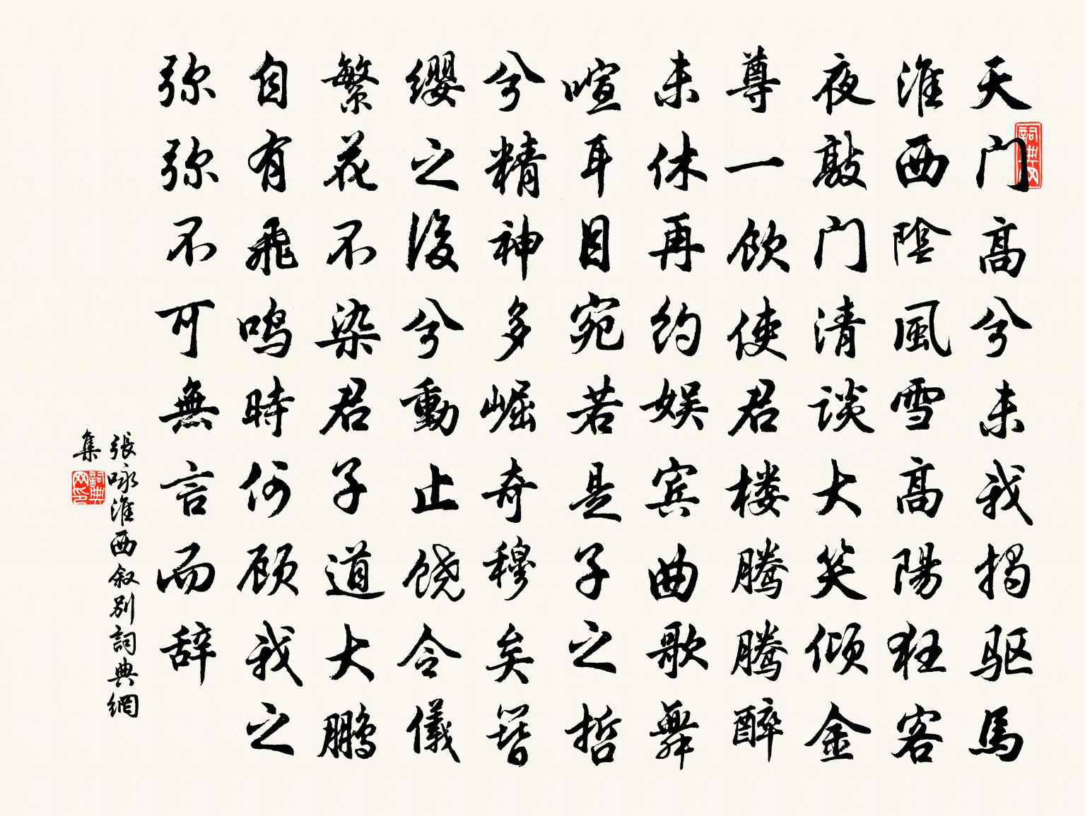 詩詞名句歷史字典書法欣賞書法字典國語詞典說文解字康熙字典古漢語字典標 題 作 者 詩 句 淮西敘別作者:張詠 朝代:宋代淮西敘別原文天門高兮未我揭,驅馬淮西陰風雪。高陽狂客夜敲門,清談大笑傾金尊。一飲使君樓,騰騰醉未休。再約娛賓曲,歌舞喧耳目。宛若是子之哲兮,精神多崛奇。穆矣簪纓之後兮,動止饒令儀。繁花不染君子道,大鵬自有飛鳴時。何顧我之瀰瀰,不可無言而辭。詩詞問答問:淮西敘別的作者是誰?答:張詠問:淮西敘別寫於哪個朝代?答:宋代張詠淮西敘別書法欣賞淮西敘別書法作品詩詞推薦中秋月項安世〔宋代〕素娥行處與誰同,玉斧修成幾許功。空里若安丹桂木,雲中應有白銀宮。蟾行萬里惟三足,兔滿千山望一雄。海闊失調名佚名〔宋代〕華宮瑤館游畢。卻返絳節、回鸞翼。荷殷勤、三斝香醪,供養我、上真仙客。赤靄浮空,祥雲遠布,是我來時節。新荷葉(詠荷)趙長卿〔宋代〕冷徹蓬壺,翠幢鼎鼎生香。十頃琉璃,望中無限清涼。遮風掩日,高低襯、密護紅妝。陰陰湖裡,羨他雙浴鴛鴦。次韻李士舉丈除夕王灼〔宋代〕兒孫思故國,詩酒送窮年。祿近禾三百,人慚員半千。壯心非曩昔,尊足幸輕便。投曉椒觴盡,春風共醉顛。郡牧李侍郎生日朱長文〔唐代〕柱史仙翁舊指枝,生賢左右太平基。居留成就昭陵後,賜告從容故里時。籌策久為當世重,動勞方受兩宮知。欲祈寄獻闕下一二知已祖無擇〔宋代〕公道當朝絕比倫,因馮暖筆變孤根。才沖霰雪游梁苑,便逐風雷化禹門。南郡已甘拋絳帳,東州何幸佐朱旛。心懷又蜆子和尚贊釋了惠〔宋代〕赤手立生涯,教廬一個蝦。不從江裹得,樹上摝將來。遣興聯句孟郊〔唐代〕我心隨月光,寫君庭中央。 ——孟郊月光有時晦,我心安所忘。 ——韓愈常恐金石契,斷為相思腸。 ——孟三良詩曹植〔魏晉〕功名不可為。忠義我所安。秦穆先下世。三臣皆自殘。生時等榮樂。既沒同憂患。誰言捐軀易。殺身誠獨難。攬涕次韻朱萬卿五首陳造〔宋代〕陳雷好賓主,亹亹客風流。末座仍枚叟,捐金得莫愁。濃歡兼卜夜,暇日賴銷憂。近按梁州譜,何妨一再謳。紹興以後蜡祭四十二首佚名〔宋代〕[圜鍾為宮]玄冬筆祀,始於伊耆。幾事聿成,庸答蕃釐。眷言西顧,匪神司之。歸功爾神,翩其下來。虞美人·銀床淅瀝青梧老納蘭性德〔清代〕銀床淅瀝青梧老,屧粉秋蛩掃。采香行處蹙連錢,拾得翠翹何恨不能言。迴廊一寸相思地,落月成孤倚。背燈和月蘇才翁輓詩二首歐陽修〔宋代〕握手接歡言,相知二十年。文章家世事,名譽弟名賢。可惜英魂掩,惟余醉墨傳。秋風衰柳岸,撫柩送歸船。送雪竇圓兄歸疏山釋紹曇〔宋代〕錦鏡濃妝蜀樣花,沒塵無處惹塵埃。好歸說與曹家女,已是當堂打破來。鳳凰山曹豳〔宋代〕鳳去寥寥今幾年,至今人喚鳳凰山。只愁有鳳無人識,卻指凡禽誤世間。出關吳泳〔宋代〕曉帶雞星出,春從鳥道餐。霧漫旗彩壞,霜落劍花寒。天險今雖在,人謀昔所難。臨關能虎視,一亮亢曹瞞。鮮于東之晉伯之子贈詩次韻晁公溯〔宋代〕高簾不捲戶長開,須子時時著屣一。一坐清風生白羽,九衢烏帽失黃埃。天基聖節錫宴致語口號洪咨夔〔宋代〕寶鳳銜春良玉墀,開基節後即天基。日行黃道三辰秩,斗轉蒼龍萬象熙。扶起車攻常武運,做成既醉太平晨。千官送商州杜中丞赴任皇甫曾〔唐代〕安康地理接商於,帝命專城總賦輿。夕拜忽辭青瑣闥,晨裝獨捧紫泥書。深山古驛分騶騎,芳草閒雲逐隼貍。綺皓過袁村袁說友〔宋代〕在昔有袁村,今到袁村路。峰傍呼父老,同姓亦三數。貴賤本無種,苗裔有疏附。我家建家派,一經立門戶。安用名句推薦聰以知遠,明以察微。司馬遷《史記·五帝本紀》 塞垣多少思歸客,留著長條贈遠遊。朱栴《官橋柳色》 一寸丹心圖報國,兩行清淚為思親。于謙《立春日感懷》 深夜無風新雨歇,涼月,露迎珠顆入圓荷。閻選《定風波·江水沉沉帆影過》 清風徐來,水波不興。蘇軾《前赤壁賦》 能脫身牢籠外,便是大英雄。王永彬《圍爐夜話·第二八則》 傳屐朝尋藥,分燈夜讀書。於鵠《題鄰居》 芄蘭之葉,童子佩韘。佚名《芄蘭》 自知者英,自勝者雄。王通《中說·卷四·事君篇》 楚江湄,湘娥乍見,無言灑清淚周密《繡鸞鳳花犯·賦水仙》