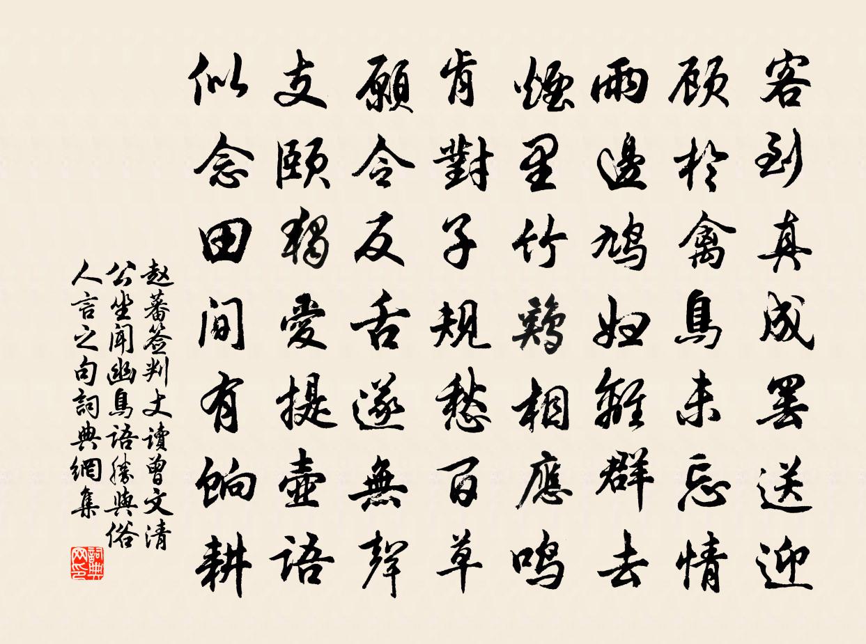 詩詞名句歷史字典書法欣賞書法字典國語詞典說文解字康熙字典古漢語字典標 題 作 者 詩 句 簽判丈讀曾文清公坐聞幽鳥語勝與俗人言之句作者:趙蕃 朝代:宋代原文客到真成罷送迎,顧於禽鳥未忘情。雨邊鳩婦離群去,煙里竹雞相應鳴。肯對子規愁百草,願令反舌遂無聲。支頤獨愛提壺語,似念田間有餉耕。詩詞問答問:《簽判丈讀曾文清公坐聞幽鳥語勝與俗人言之句》的作者是誰?答:趙蕃問:該詩寫於哪個朝代?答:宋代書法欣賞簽判丈讀曾文清公坐聞幽鳥語勝與俗人言之句書法作品詩文賞析【原題】:簽判丈讀曾文清公坐聞幽鳥語勝與俗人言之句感之為長句蕃謹次韻同賦詩詞推薦又作偈釋宗杲〔宋代〕大根大器大力量,荷擔大事不尋常。一毛頭上通訊息,遍界明明不覆藏。晚秋郊居八首趙蕃〔宋代〕鄰父疑為三徑孫,一生辛苦在田園。近來交友誰相顧,渠獨頻沾菜把恩。思錄舊詩於卷上,悽然有感,因成一章韓偓〔唐代〕緝綴小詩鈔卷里,尋思閒事到心頭。自吟自泣無人會,腸斷蓬山第一流。九日有感二首強至〔宋代〕憶昨方陪上相筵,召書忽到菊杯前。主人舉酒勤令飲,一醉秋風恰二年。杭州天竺、靈隱二寺頃歲亦布衣一游…追思為詩二首李紳〔唐代〕翠岩幽谷高低寺,十里松風碧嶂連。開盡春花芳草澗,遍通秋水月明泉。石文照日分霞壁,竹影侵雲拂暮煙。時有奉慈禪寺陳舜俞〔宋代〕一宿禪關萬慮空,明朝更上十餘峰。山依碧落不多遠,人在白雲無數重。水末疏鍾驚虎兕,門前瀦水穴蛟龍。勞生春晚雨中作陸游〔宋代〕冉冉流年不貸人,東園青杏又嘗新。方書無藥醫治老,風雨何心斷送春!樂事久歸孤枕夢,酒痕空伴素衣麈。畏途嘲賈似道劉壎〔宋代〕三百年余歷數更,東南萬里看昇平。黃金台上麒麟閣,混一元勛是賈生。送大理金少卿赴闕以老成耆德重於典刑為韻兼仲並〔宋代〕澆風昔未殄,向隅或不免。上心天地心,哀矜用中典。卿聯慎所付,遂極天下選。譏讞聊小試,經論期一展。織圖二十四首祝謝樓璹〔宋代〕春前作蠶市,盛事傳西蜀。此邦享先蠶,再拜絲滿目。馬革裹玉肌,能神不為辱。雖雲事渺茫,解與民為福。書懷衛博〔宋代〕一劍西來又蒯緱,空餘逸氣凜橫秋。羈情正類南飛鵲,生事渾隨萬里鷗。歲晚已驚霜入屨,夜寒唯有月當樓。四方舟中雨作趙蕃〔宋代〕旱而逢小雨,月亦當季秋。便覺重陽近,還成一舸游。關余荒徑菊,愧爾沒波鷗。詩就雲如卷,推篷得縱求。次太白水西韻陳柄〔宋代〕涇巘翠插天,涇溪清繞郭。巒環松竹里,崖磴自樓閣。是時秋陽驕,三日此棲泊。曉色林端來,晴雲岩際落。飛梯【仙呂】賞花時北沈和〔元代〕瀟湘八景休說功名皆是浪語,得失榮枯總是虛,便做道三公位待何如?如今得時務,盡荊棘是迷途。【麼篇】便是古詞曹鄴〔唐代〕高闕礙飛鳥,人言是君家。經年不歸去,愛妾面上花。妾面雖有花,妾心非女蘿。郎妻自不重,於妾欲如何?病後夏初雜書近況十首方回〔宋代〕妙年剛謂世無愁,汗漫猖狂萬里游。夢裡講經天竺國,醉中橫笛岳陽樓。散花女已無蹤矣,老樹精今尚在不。咋舌送季明府赴太平粹戴復古〔宋代〕庭闈定省外,都是坐廳時。盡日身無倦,對天心不欺。縣花潘岳賦,池草惠連詩。磨取九峰石,刊成德政碑。寄師文二首陳造〔宋代〕阿泰知何似,無書坐地偏。未妨歸緩緩,可免意縣縣。肖父仍便酒,如翁不蓄錢。況須供老眼,欲說已欣然。偈六十三首釋道寧〔宋代〕春風習習,春日熙熙。鳥啼東嶺上,花發樹南枝。園林並紫陌,賞玩頗相宜。行人半醉半醒,遊客似憨似痴。或歌送遲赴登封丞蘇轍〔宋代〕昔我過嵩陽,秋高日重九。晨邀同行客,共舉登高酒。藤鞋生胼胝,一覽河山富。封壇土消盡,中夜捫星斗。下山名句推薦翠葉吹涼,玉容消酒,更灑菇蒲雨。姜夔《念奴嬌·鬧紅一舸》 秋蕭索。梧桐落盡西風惡。黃機《憶秦娥·秋蕭索》 禍與福同門,利與害同城。佚名《增廣賢文·下集》 無作牛山悲,惻愴淚沾臆。李白《君子有所思行》 玉露金風報素秋,穿針樓上獨含愁。德容《七夕二首·其一》 莫聽穿林打葉聲,何妨吟嘯且徐行。蘇軾《定風波·莫聽穿林打葉聲》 勝敗兵家事不期,包羞忍恥是男兒。杜牧《題烏江亭》 寂寂聞猿愁,行行見雲收李白《尋高鳳石門山中元丹丘》 窗間梅熟落蒂,牆下筍成出林。范成大《喜晴》 爭奈醒來,愁恨又依然朱淑真《江城子·賞春》