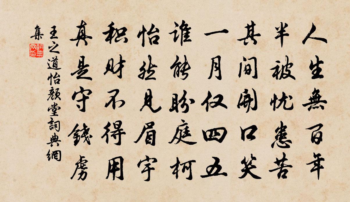 詩詞名句歷史字典書法欣賞書法字典國語詞典說文解字康熙字典古漢語字典標 題 作 者 詩 句 怡顏堂作者:王之道 朝代:宋代怡顏堂原文人生無百年,半被憂患苦。其間開口笑,一月僅四五。誰能盼庭柯,怡然見眉宇。積財不得用,真是守錢虜。詩詞問答問:怡顏堂的作者是誰?答:王之道問:怡顏堂寫於哪個朝代?答:宋代王之道怡顏堂書法欣賞怡顏堂書法作品詩詞推薦南宮宿齋靜思陝城東閣行寇準〔宋代〕南宮向夕景彌清,風行蕭然動遠情。憶到陝城東閣伴,拂窗敲砌送寒聲。和季弟韻二十首劉克莊〔宋代〕去國為農混里廛,故舊拋向短檠邊。台卿複壁猶溫孟,夷甫排牆始悔玄。送老只消營藁葬, * 不過費榆錢。枯腸寄魯山兄方岳〔宋代〕搖落山城暮,行人返照邊。亂蟬鳴古柳,獨鶴下遙川。秋事無多日,寒花又一年。故應深夜雨,重憶對床眠。秋興陳某〔宋代〕禾黍離離雨滿村,望中兵火幾家存,荒城半是征人骨,秋月偏驚旅客魂。豈意戰塵臨老見,不知心事向誰論。抱茅送人化修上釋慧空〔宋代〕盡謂黃龍山里龍,彌年翻去碧潭空。君行為報居人道,遐邇雖殊一雨同。次韻答陣夢錫十首陳造〔宋代〕巨室熒煌萬金產,小家經營一簪餘。克庸盟隨制梃足,更用荊屍來搗虛。贈來進士鵬李鹹用〔唐代〕語玄人不到,星漢在靈空。若使無良遇,虛言有至公。月明千嶠雪,灘急五更風。此際若吟力,分將造化功。春日烏延道中許棠〔唐代〕邊窮厄未窮,復此逐歸鴻。去路多相似,行人半不同。山川藏北狄,草木背東風。虛負男兒志,無因立戰功。受恩深王哲〔元代〕性亂因醪誤。精枯緣色妒。眼神傷敗,被財役住。鼻濁如何,只為氣使馨清去。浮世人難悟。*四事相牽,淪落苦過寶應縣新開湖十首楊萬里〔宋代〕五湖佳處是荒寒,卻為無山水更寬。皈去江南無此景,未須吃飯且來看。常祀五享三首真宗〔宋代〕皇祖皇考,配帝配天。駿奔葉相,神保言旋。祝以孝告,嘏以茲宣。去來永慕,宗事惟虔。費參政輓詩魏了翁〔宋代〕黨論危疑日,幾微細補縫。平舟行浪穩,暖氣拆冰融。風雨千閒屋,酸鹹一鼎瓮。人才關國本,誰念昔培封。虞美人·弄梅騎竹嬉遊日王國維〔清代〕弄梅騎竹嬉遊日。門戶初相識。未能羞澀但嬌痴。卻立風前散發襯凝脂。近來瞥見都無語。但覺雙眉聚。不知何日贈算數汪生方岳〔宋代〕貂蟬勳業麒麟畫,自有夔龍向上人。數本不為吾輩設,風煙之句水雲身。晚坐新亭對溪山有感二首錢時〔宋代〕莫道溪山閱世長,溪山今古幾興亡。金丹大藥皆虛妄,別有長生不死方。明妃曲二首·其二王安石〔宋代〕明妃初嫁與胡兒,氈車百兩皆胡姬。含 * 語獨無處,傳與琵琶心自知。黃金桿撥春風手,彈看飛鴻勸胡酒。漢宮次韻子瞻招隱亭蘇轍〔宋代〕隱居吾未暇,何暇勸夫人。試飲此亭酒,自慚纓上塵。林深開翠帟,岸斷峻嚴闉。送雪村酤釅,迎陽鳥哢新。竹風題趙子固詩卷劉克莊〔宋代〕紫芝仲白俱仙去,晚秀惟君擅士林。字肖率更親手作,詩疑賈島後身吟。九成合奏音方備,三染為纁色始深。老去題史院壁陸游〔宋代〕命薄謀常拙,年衰力轉微。鷁飛元合退,羝乳偶成歸。汗簡慚靡日,流麈怯染衣。無端霜夜月,應照舊苔磯。偶成呈林鄭二友兩絕鄭清之〔宋代〕人才百年能幾見,俗子一揖已累人。元溫亦知有此客,德操未省誰為賓。名句推薦新竹高於舊竹枝,全憑老乾為扶持。鄭燮《新竹》 唯願當歌對酒時,月光長照金樽里。李白《把酒問月·故人賈淳令予問之》 思其人,至其鄉;其處在,其人亡。司馬光《資治通鑑·漢紀三十九》 朔方正月雪澌澌,單于策馬至京西沈約《昭君辭》 卻是有,年年塞雁,歸來曾見開時。晁沖之《漢宮春·梅》 田園寥落干戈後,骨肉流離道路中。白居易《望月有感》 天秋木葉下,月冷莎雞悲。李白《秋思》 天下無指者,生於物之各有名,不為指也。公孫龍《公孫龍子·指物論》 人逢喜事精神爽,悶上心來瞌睡多。吳承恩《西遊記·第三十五回》 怪人不知理,知理不怪人。佚名《增廣賢文·下集》