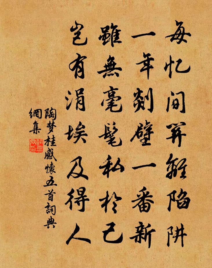 詩詞名句歷史字典書法欣賞書法字典國語詞典說文解字康熙字典古漢語字典標 題 作 者 詩 句 感懷五首作者:陶夢桂 朝代:宋代感懷五首原文每憶間關離陷阱,一年剡壁一番新。雖無毫髦私於己,豈有涓埃及得人。詩詞問答問:感懷五首的作者是誰?答:陶夢桂問:感懷五首寫於哪個朝代?答:宋代陶夢桂感懷五首書法欣賞感懷五首書法作品詩詞推薦無射詩佚名〔先秦〕國誠寧矣。遠人來觀。脩義經矣。好樂無荒。訪僧歸雲庵陶崇〔宋代〕閒過選佛場,歸雲翠如潑。入門偶有言,啟頰師便喝。掩耳煨芋爐,但把火深撥。呼童酌玉虹,注之旃檀缽。噓灰丁山眺望趙處澹〔宋代〕絕頂蒼崖險,藤蘿手自攀。雲煙萬里迥,宇宙一身閒。秋氣悲才子,夕陽明遠山。看看九日至, * 翠岩間。謁金門陳克〔宋代〕春漏促。誰見兩人心曲。罨畫屏風銀蠟燭。淚珠紅蔌蔌。懊惱歡娛不足。只許夢中相逐。今夜月明何處宿。畫橋春次韻吳守四首陳造〔宋代〕十日陰寒此日晴,歸來趁賞大花春。主家千斛香泉碧,卻自摩挱漉酒巾。琵琶亭祖無擇〔宋代〕晚泊湓江半客舟,琵琶亭下動閒愁。霓裳綠腰杳何許,楓葉荻花空自秋。賈傅有才悲鵩鳥,楚騷終古怨靈修。莫言贈吳令君吳儆〔宋代〕綠槐庭院鎖薰風,雙雙乳燕穿簾櫳。石榴花蹙宮羅樣,荔子枝翻蜀錦紅。海山秀色藏日色,袞作英豪儀上國。鵬翼和峽州馮使君題所居吳融〔唐代〕三年拔薤成仁政,一日誅茅葺所居。曉岫近排吟閣冷,夜江遙響寢堂虛。唯懷避地逃多難,不羨朝天臥直廬。記得上太師公相生辰詩十首佚名〔宋代〕地靈人傑產忠良,瑞靄龍蟠虎踞鄉。天欲中興神降岳,世將嘉靖弼生商。和羹早報梅花信,壽酒先飛柏葉觴。笑指句劉沆〔宋代〕三月內方有,百花中更無。春晚詠懷贈皇甫朗之白居易〔唐代〕艷陽時節又蹉跎,遲暮光陰復若何。一歲中分春日少,百年通計老時多。多中更被愁牽引,少處兼遭病折磨。賴有相見歡向子諲〔宋代〕亭亭秋水芙蓉。翠圍中。又是一年風露、笑相逢。天機畔。雲錦亂。思無窮。路隔銀河猶解、嫁西風。軟翻鞋 謝人助緣王處一〔元代〕清信出寬懷。都莫亂參猜。累蒙施惠宴重開。又無百回奉,相酬賽,春深去,夏歸來。齋會好編排。增福更消災。汪叔量白酒陳造〔宋代〕妙訣何年受異人,釀成珍齊只逡巡。端憂肯念霜髯客,取醉時分玉色春。篘處想如君德厚,飲來渾類我詩醇。借書和韋承慶過義陽公主山池其四杜審言〔唐代〕攢石當軒倚,懸泉度牖飛。鹿麛沖妓席,鶴子曳童衣。園果嘗難遍,池蓮摘未稀。捲簾唯待月,應在醉中歸。 琴趙崇森〔宋代〕群胥推案去,一客抱琴來。喚起高山趣,驅除俗吏埃。耳根從此淨,指法看君開。剩欲傳佳操,仙舟且莫回。柳陌聽早鶯陶翰〔唐代〕忽來枝上囀,還似谷中聲。乍使香閨靜,偏傷遠客情。間關難辨處,斷續若頻驚。玉勒留將久,青樓夢不成。千門為章道祖頗及葛藤華藏庵葛立方〔宋代〕鮮健龐翁今罷參,拄杖掛壁雲迷庵。開花聊幻仙七七,逗機更說禪三三。未辦浮丘招挹袖,且邀彌勒與同龕。庵中送簡能禪者歸仙都釋重顯〔宋代〕荷策下丹嶂,紛紛雪正飛。浮生誰未到,舊國自重歸。雲背猿聲斷,天遙鶚影微。蓮城古風月,又得振清機。重題別東樓白居易〔唐代〕東樓勝事我偏知,氣象多隨昏旦移。湖卷衣裳白重疊,山張屏障綠參差。海仙樓塔晴方出,江女笙簫夜始吹。春雨名句推薦君子懷德,小人懷土;君子懷刑,小人懷惠。孔子弟子《論語·里仁篇》 黃梅時節家家雨,青草池塘處處蛙。趙師秀《約客 / 有約》 吹到一片秋香,清輝了如雪。納蘭性德《琵琶仙·中秋》 野鴉無意緒,鳴噪自紛紛。杜甫《孤雁 / 後飛雁》 三杯吐然諾,五嶽倒為輕。李白《俠客行》 已知泉路近,欲別故鄉難。夏完淳《別雲間》 但責己,不責人,此遠怨之道也王永彬《圍爐夜話·第八五則》 城門失火,殃及池魚。司馬光《資治通鑑·梁紀·梁紀十六》 我居北海君南海,寄雁傳書謝不能。黃庭堅《寄黃幾復》 節用儲蓄,以備凶災范曄《後漢書·本紀·肅宗孝章帝紀》