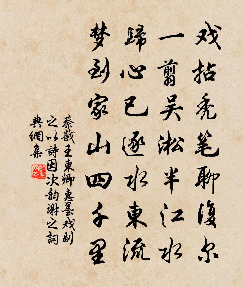 詩詞名句歷史字典書法欣賞書法字典國語詞典說文解字康熙字典古漢語字典標 題 作 者 詩 句 王東卿惠墨戲副之以詩因次韻謝之作者:蔡戡 朝代:宋代原文戲拈禿筆聊復爾,一翦吳淞半江水。歸心已逐水東流,夢到家山四千里。詩詞問答問:《王東卿惠墨戲副之以詩因次韻謝之》的作者是誰?答:蔡戡問:該詩寫於哪個朝代?答:宋代問:該詩是什麼體裁?答:七絕書法欣賞王東卿惠墨戲副之以詩因次韻謝之書法作品詩詞推薦東協濟祠陳岩〔宋代〕新祠金碧照林丘,十五年前認昔游。月桂山茶分左右,滿庭花事客春秋。西湖小隱周文璞〔宋代〕先帝何曾寵幸臣,家園籍沒幾經春。一丘賜與嬋娟魄,教主西湖似洛神。次韻幾復答予所贈三物三首石燈檠黃庭堅〔宋代〕誰憐湖海士,白髮夜窗檠。風雨雞不已,詩書眼尚明。禪枝安宿鳥,僧粥吼華鯨。但滿五車讀,行看一座傾。釣絲風連文鳳〔宋代〕短髮冷颼颼,倚船初下鉤。間來片水外,輕弄一痕秋。淺拂苹花落,低隨柳影浮。煙波清夢遠,吹不到王侯。城上觀月朱翌〔宋代〕月上孤城早,山迎雉堞低。四天浮沆瀣,萬瓦貯玻璃。松獵風聲北,江搖斗柄西。諸公宜款曲,吾且倚枯藜。已亥雜詩 293龔自珍〔清代〕忽向東山感歲華,恍如庾嶺對橫斜。敢參黃面瞿曇句,此是森森闕里花。侍宴隆慶池應制張說〔唐代〕靈池月滿直城隈,黻帳天臨御路開。東沼初陽疑吐出,南山曉翠若浮來。魚龍百戲紛容與,鳧鷁雙舟較溯洄。願似登峴首阻雨楊時〔宋代〕庭前古木已經秋,天外行雲暝不收。倚杖卻尋山下路,一川風雨濕征輈。十月八日聞雞鳴即起案上偶有陶集繙閱數詩有趙蕃〔宋代〕衾寒數窺窗,窗暗雞已號。比鄰遞東西,我起披緼袍。始占霜檐粲,忽聽風林鏖。乃知中夜雨,吾念亦良勞。郊廟歌辭。享太廟樂章。送神佚名〔唐代〕五聲備奏,三獻終祠。車移鳳輦,旆轉虹旗。禮周籩豆,誠效虔祗。皇靈徙蹕,簪紳拜辭。過和州報恩寺唐籍故居也吳龍翰〔宋代〕昔年此地著書人,詩骨成塵草木深。突兀眼前僧結屋,塔鈴風裡替君吟。次觀表文韻洪皓〔宋代〕求成虐執四三年,一木難支大廈顛。致死存孤思杵臼,恃強輕敵笑苻堅。國家未免中衰者,日月何妨薄食焉。今日題汪水雲詩卷十首胡斗南〔宋代〕當年出塞幾紅娃,曾共氈房看雪花。今日湖亭霜月夜,夢中猶聽撚琵琶。山中曹松〔唐代〕要路豪家非往還,岩門先有不曾關。眾心惟恐地無剩,吾意亦憂天惜閒。白練曳泉窗下石,絳羅垂果枕前山。樵夫寄李鶴田汪元量〔宋代〕文江別後又三年,別後三年詩幾篇。老去莫思身外事,命窮甘作飲中仙。天陰雨溼龍歸海,雲淡風輕鶴在田。回首玩月賈島〔唐代〕寒月破東北,賈生立西南。西南立倚何,立倚青青杉。近月有數星,星名未詳諳。但愛杉倚月,我倚杉為三。月乃賜耆老布帛(一作張復元詩)崔樞〔唐代〕殊私及耆老,聖德賑黎元。布帛忻天賜,生涯作主恩。情均皆挾纊,禮異賁丘園。慶洽時方泰,仁沾月告存。寧知梅花喜神譜欲謝一十六枝宋伯仁〔宋代〕滕六雨天花,南枝香斗白。瓊玉兩模糊,冷笑從君索。忠侍者自隱靜來既歸覓詩因述其意以贈之自可吳芾〔宋代〕上人手持隱靜書,示我刊成送行句。飄忽如雲不可留,又歸隱靜山中去。自謂為僧亦有緣,獲事老師非易遇。第念答劉正之見招四絕黃榦〔宋代〕求田問舍兩參差,木壞山頹萬古悲。多謝劉郎能館我,短檠疎雨聽清規。名句推薦雖死之日,猶生之年陳壽《三國志·吳書·吳主五子傳》 明歲秋風知再會,暫時分手莫相思。曹雪芹《殘菊》 是無貓邪,是不會蓄貓也。樂鈞《世無良貓》 少年俠氣,交結五都雄。賀鑄《六州歌頭·少年俠氣》 圖難於其易,為大於其細老子《老子·德經·第六十三章》 同來不得同歸去,故國逢春一寂寥!杜牧《宣州送裴坦判官往舒州時牧欲赴官歸京》 玉梅消瘦,恨東皇命薄。汪元量《傳言玉女·錢塘元夕》 閨中風暖,陌上草薰江淹《別賦》 三歲為婦,靡室勞矣。夙興夜寐,靡有朝矣。佚名《氓》 誰向若耶溪上,倩美人西去,麋鹿姑蘇。辛棄疾《漢宮春·會稽蓬萊閣懷古》