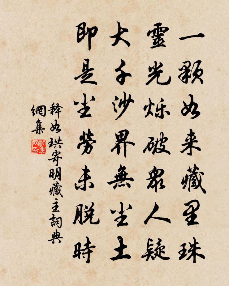 詩詞名句歷史字典書法欣賞書法字典國語詞典說文解字康熙字典古漢語字典標 題 作 者 詩 句 寄明藏主作者:釋如珙 朝代:宋代寄明藏主原文一顆如來藏里珠,靈光爍破眾人疑。大千沙界無塵土,即是塵勞未脫時。詩詞問答問:寄明藏主的作者是誰?答:釋如珙問:寄明藏主寫於哪個朝代?答:宋代釋如珙寄明藏主書法欣賞寄明藏主書法作品詩詞推薦和劉後村雜興胡仲弓〔宋代〕出處難為卜筮謀,植鰭無復轉岩求。清風不度麒麟閣,明月空沈鸚鵡洲。採石僅埋吟骨在,新亭猶帶淚痕羞。書生謁和靖先生虎丘祠堂李道傳〔宋代〕涵養當用敬,進學在致知。如車去只輪,跬步不可之。夫子受師說,惟敬實所持。升堂逮易簀,參倚日在斯。遺言哭蕭漁所趙文〔宋代〕於佛曾聞法,因詩遂得貧。若為三尺喙,不了百年身。在昔玄真子,如今主水神。飯餘茶又孰,不學淚沾巾。示獠奴阿段杜甫〔唐代〕山木蒼蒼落日曛,竹竿褭褭細泉分。郡人入夜爭餘瀝,豎子尋源獨不聞。病渴三更回白首,傳聲一注濕青雲。曾驚洋州三十景過溪亭鮮于侁〔宋代〕溪橋入庭下,杖履可忘憂。誰識釣璜翁,有時拋直鉤。石門曉行方瀾〔元代〕風高木葉脫,從此曉寒新。積雨見初日,遠山如故人。煙村一葦渡,野寺數家鄰。獨念行藏異,沙鷗未我馴。慶長叔招飲一桮,未釂,雪聲璀然。即席走筆楊萬里〔宋代〕急雪穿簾繞蠟燈,梅花微笑古銅瓶。朔風惡劇驚人殺,吹倒琉璃六曲屏。秋大熱上七里灘方回〔宋代〕吾生所未見,自古恐亦無。秋半不肯涼,赫日炎洪爐。沸湍七里灘,觸熱乘畏途。坐船汗如漿,況彼牽挽夫。一檣守耕圖唐寅〔明代〕南山之麓上腴田,當守犁鋤業瑪遷。昨日三山降除目,長沮同拜地行仙。過故府中武威公交城舊庄感事(武威公王茂元也)李商隱〔唐代〕信陵亭館接郊畿,幽象遙通晉水祠。日落高門喧燕雀,風飄大樹撼熊羆。新蒲似筆思投日,芳草如茵憶吐時。山下寄吳國西供奉齊己〔唐代〕別來相憶夢多迷,君住東朝我楚西。瑤闕合陪龍象位,春山休記鷓鴣啼。承恩位與千官別,應制才將十子齊。幾笑題李秋堂盟鷗集朱繼芳〔宋代〕相逢已恨十年遲,買酒吳山一夜詩。明日送春仍送客,柳花風颺鬢絲絲。江神子(勸酒)李壁〔宋代〕露荷香泛小池台。水雲堆。好風催。寶扇胡床,無事且徘徊。簾外海榴裙一色,判共酹、兩三杯。此懷能得幾番開壁侍者來訪作此贈之徐瑞〔宋代〕俗論行地不足聞,相從松下慰離群。喜師一吸西江水,許我平分華秋雲。更向鋒前來妙倍,莫於紙上泥陳文。純陽閒趣陸游〔宋代〕絕跡市朝外,結廬雲水間。心平詩淡泊,身退夢安閒。有酒旋尋伴,無門那說關?桐江故不遠,日暮趁潮還。題寶山寺二首釋圓悟〔宋代〕寓此曾三夏,重來隔五年。溪山亦良是,懷想轉悽然。老農十首曾協〔宋代〕朝家寬詔年年下,天上秋陽日日明。租稅入官公事了,壤歌遞與子孫賡。十二月三日夜橋上看月陸游〔宋代〕常時新月有無間,今夕清暉抵半環。柳外橋高最堪望,憑闌目送下西山。挽方親來伯劉克莊〔宋代〕弆藏古物或千年,漢晉隋唐在目前。死有一孫堪付託,生惟四友共周旋。寶扶風簋如原甫,臨永興書逼米顛。占盡泊船吳江宋伯仁〔宋代〕垂虹一抹跨晴江,好解帆繩系矮椿。水浸碧天天浸月,只消推起小篷窗。名句推薦夜深風竹敲秋韻,萬葉千聲皆是恨。歐陽修《玉樓春·別後不知君遠近》 西陸蟬聲唱,南冠客思深。駱賓王《詠蟬 / 在獄詠蟬》 日暮平沙秋草亂,一雙白鳥避人飛。袁宏道《感事·湘山晴色遠微微》 總是向人深處,當時枉道無情陸游《朝中措·代譚德稱作》 幽音變調忽飄灑,長風吹林雨墮瓦李頎《聽董大彈胡笳聲兼寄語弄房給事》 丹陽郭里送行舟,一別心知兩地秋。嚴維《丹陽送韋參軍》 余凡事喜獨出己見,不屑隨人是非。沈復《浮生六記·浪遊記快》 花漸凋疏不耐風,畫簾垂地晚重工,墮階縈蘚舞愁紅孫光憲《浣溪沙·花漸凋疏不耐風》 差之毫厘,失之千里。佚名《增廣賢文·上集》 夭夭園桃,無子空長。曹丕《煌煌京洛行》