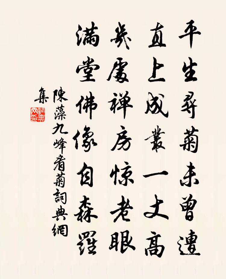 詩詞名句歷史字典書法欣賞書法字典國語詞典說文解字康熙字典古漢語字典標 題 作 者 詩 句 九峰看菊作者:陳藻 朝代:宋代九峰看菊原文平生尋菊未曾遭,直上成叢一丈高。幾處禪房驚老眼,滿堂佛像自森羅。詩詞問答問:九峰看菊的作者是誰?答:陳藻問:九峰看菊寫於哪個朝代?答:宋代陳藻九峰看菊書法欣賞九峰看菊書法作品詩詞推薦禽獸昆蟲之孝十首豺獺林同〔宋代〕曾聞豺祭獸,還見獺陳魚。人苟不知祭,能如豺獺乎。崔十四宅各賦一物得檐柳皇甫冉〔唐代〕官渡老風煙,潯陽媚雲日。漢將營前見,胡笳曲中出。復在此檐端,垂陰仲長室。臨江仙趙長卿〔宋代〕元約三年。文卿不忍舍主,厥母不容與議,堅索之去。今失於一農夫,常常寄聲,或片紙數字問訊。仙源有感,遂春日雜興陸游〔宋代〕出仕常騎禿尾驢,歸休自駕折轅車。今朝偶遇林夫子,借得齊民一卷書。重次前韻奉酬子由子開叔貢三舍人二首蘇頌〔宋代〕都堂直北正衙西,同日三賢拜紫泥。供張府泉批敕賜,刊碑朱墨典簽攜。姓名非夕金甌覆,手筆他年玉簡題。制詔郊廟歌辭。享太廟樂章。景雲舞佚名〔唐代〕惟睿作聖,惟聖登皇。精感耀魄,時膺會昌。舜慚大孝,堯推讓王。能事斯極,振古誰方。文明履運,車書同軌。壽成都黃副帥二首李劉〔宋代〕玉帳公弓應六蓬,瓣香遙遺賀南豐。捫參以手誰憐汝,居井之眉我倚公。壽域八荒隨氣轉,醉鄉五福與民同。老蟆酹江月(詠芍藥)曾協〔宋代〕一年好處,是滿城紅藥,留連□□。十里揚州應費了,多少春工妝飾。弱質欹風,芳心帶露,酒困嬌無力。園林綠望江南李真人〔元代〕分明道,朦朧在君家。龍虎見君君不見,徒將金寶作河車。爭得見黃與韓荊州書李白〔唐代〕白聞天下談士相聚而言曰:“生不用封萬戶侯,但願一識韓荊州。”何令人之景慕,一至於此耶!豈不以有周公之緣識宋太宗〔宋代〕為人能省己,就靜亦皆忙。春去秋來定,年諸日遠長。英姿終有異,賤品足顛狂。蠢動含靈性,善生惡自亡。出遊陸游〔宋代〕朝行躡屩穿幽谷,暮返褰裳涉亂流。提起短筇成一笑,每煩上座為分憂。夏旱五首劉克莊〔宋代〕尚食停珍膳,清齋禱竹宮。方當歌雲漢,未可和薰風。陪侍丞相安晚先生宿覺際寺夜遇大風可畏遂賦黃載〔宋代〕船頭落日如血紅,客言今夕當有風。空山夢回刺骨冷,纊被無力身如弓。但聞紙窗響僁窣,初意空廚飢鼠出。忽然永崇里觀居白居易〔唐代〕季夏中氣候,煩暑自此收。蕭颯風雨天,蟬聲暮啾啾。永崇里巷靜,華陽觀院幽。軒車不到處,滿地槐花秋。年光念奴嬌(曉起觀落梅)李洪〔宋代〕麗譙吹角,漸疏星明澹,簾篩殘月。裊裊霜飆欺翠袖,飛下一庭香雪。半面妝新,迴風舞困,此況真奇絕。桄榔林和汪正夫梅鄭獬〔宋代〕少陵老杜獨憐才,長句還如鐵馬來。酒味漸佳春漸好,苦教陸凱詠寒梅。仙霞道中黃公度〔宋代〕村村翁嫗賀年華,不道行人亦念家。可是浮名能挽我,杖藜元日度仙霞。送淮南轉運李學士君錫梅堯臣〔宋代〕王都重兵廩,命使總八方。淮南舟車沖,三楚籠利長。惟時有才彥,數計等桑羊。八月賜詔行,朱斾插大航。汴湍遣興吳汝弌〔宋代〕疏鬆碎明月,密竹篩清風。親交昔與別,若謂行相從。延企邈不及,音容隨想生。諒彼亦耿耿,飛爽留空形。援琴名句推薦長水塘南三日雨,菜花香過秀州城查慎行《曉過鴛湖》 記得綠羅裙,處處憐芳草。賀鑄《綠羅裙·東風柳陌長》 花近高樓傷客心,萬方多難此登臨。杜甫《登樓》 逆其根則伐其本,壞其真矣。佚名《黃帝內經·四氣調神大論》 漸行漸遠漸無書,水闊魚沉何處問。歐陽修《玉樓春·別後不知君遠近》 治強生於法,弱亂生於阿。韓非及後人《韓非子·外儲說右下》 閉心塞意,不高瞻覽者,死人之徒也哉。王充《論衡·卷十三·別通篇》 碧水丹山映杖藜,夕陽猶在小橋西。沈周《題畫》 秋風蕭瑟,洪波湧起。曹操《觀滄海 / 碣石篇》 西望雷塘何處是?香魂零落使人愁,淡煙芳草舊迷樓王士禎《浣溪沙·紅橋》