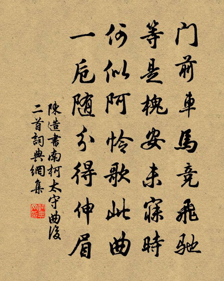 詩詞名句歷史字典書法欣賞書法字典國語詞典說文解字康熙字典古漢語字典標 題 作 者 詩 句 書南柯太守曲後二首作者:陳造 朝代:宋代書南柯太守曲後二首原文門前車馬競飛馳,等是槐安未寐時。何似阿憐歌此曲,一卮隨分得伸眉。詩詞問答問:書南柯太守曲後二首的作者是誰?答:陳造問:書南柯太守曲後二首寫於哪個朝代?答:宋代陳造書南柯太守曲後二首書法欣賞書南柯太守曲後二首書法作品詩詞推薦端午帖子九首曹勛〔宋代〕參差台殿照祥雲,疊雪含風彩縷新。玉帶輕紗迎令節,五雲深處奉嚴宸。望亭驛酬別周判官白居易〔唐代〕何事出長洲,連宵飲不休?醒應難作別,歡漸少於愁。燈火穿村市,笙歌上驛樓。何言五十里,已不屬蘇州。詠史詩陳宮胡曾〔唐代〕陳國機權未可涯,如何後主恣嬌奢。不知即入宮中井,猶自聽吹玉樹花。和喻迪孺郎中春日書事二首郭印〔宋代〕人間春思漫紛爭,祗把新詩喚曉鶯。妙處鐫鑱應鬼泣,醉中揮灑自風生。誰知雅道當今絕,獨與騷人並駕行。尺紙走馬燈賡張樞副韻吳潛〔宋代〕半勺蘭膏暖焰生,恍疑赤壁夜鏖兵。騎乘猛燎賓士疾,人運長鎗轉戰輕。旗影靜移雲母帳,劍鋩微掣水晶營。何人涼蟾宋祁〔宋代〕涼蟾齧殘雲,飛影上西廡。鵲鴉依空牆,蠨蛸已在戶。君行閱三歲,確戰亦云苦。新衣本自綻,故裳復誰補。朔風又對廳陳造〔宋代〕黃堂綠影轉槐龍,錦繡圍中度好風。珠履相輝人峙玉,金罍更勸酒如空。逢辰正自千齡會,勝日何妨一醉同。來歲巫山一段雲 黃橋晚照李齊賢〔元代〕隱見溪流轉,縱橫野壠分。隔林人語遠堪聞。村徑綠如裙。鳶集蜈山樹,鴉投鵠嶺雲。來牛去馬更紛紛。城郭日初生查子周紫芝〔宋代〕青絲結曉鬟,臨鏡心情懶。知為曉愁濃,畫得雙蛾淺。柳困玉樓空,花落紅窗暖。相對語春愁,只有春閨燕。頌釋真慈〔宋代〕撥塵見佛,佛亦是塵。問了答了,直下翻身。將至都下張耒〔宋代〕竟陵南望稻新熟,夢澤悠悠傷遠目。春風嶺上望齊安,太昊城邊攬秋菊。那知歲暮東州客,大山蒼寒曉霜白。雲收送王南海二首劉克莊〔宋代〕史氏循良傳,儒家果藝科。土荒耕老少,海近販人多。古有寧馨語,今無於蒍歌。縣知新令尹,琴調得民和。西江月薛式〔宋代〕鑿破玄元三五,撥開造化圭璋。希夷妙旨在中央。咫尺無名罔象。片餉工夫便得,教君地久天長。蓬萊仙島是吾鄉和寄喻景山陳宓〔宋代〕朱門到老幾人還,贏得階庭著蘚班。曾似高人無俗累,解將碧巘照朱顏。趣超今古沉酣外,句入雲煙縹緲間。白首萬松嶺趙史君〔宋代〕清溪狹徑小橋東,春入桃花處處同。我為日長無一事,偶然來此聽松風。即事文天祥〔宋代〕去年傷北使,今日嘆南馳。雲濕山如動,天低雨欲垂。征夫行未已,遊子去何之。正好王師出,崆峒麥熟時。滿庭芳·碧水驚秋秦觀〔宋代〕碧水驚秋,黃雲凝暮,敗葉零亂空階。洞房人靜,斜月照徘徊。又是重陽近也,幾處處,砧杵聲催。西窗下,風搖又次韻三首廖行之〔宋代〕一年好景今露螢,試問誰濯滄浪纓。隨時動遭不事謗,潔己自覺太清生。西風常次樂郊路,好酒不博當朝卿。浩然儒家子劉宗慶發披戴願贈二絕句俾藉之以謁樂曾豐〔宋代〕走俗何如學步虛,出家猶欠護身符。憑誰成就奇男子,逕自歸投大丈夫。題靈岩羅榮祖〔宋代〕巨鰲戴山凌空起,橫絕碧雲千萬里。嵐風飛淨明彩霞,四字八紘皆望里。霧障高懸五老峰,朵朵肖削成芙蓉。天柱名句推薦解落三秋葉,能開二月花。李嶠《風》 無情最是台城柳,依舊煙籠十里堤。韋莊《台城》 烏啼鵲噪昏喬木,清明寒食誰家哭。白居易《寒食野望吟》 我醉君復樂,陶然共忘機。李白《下終南山過斛斯山人宿置酒》 青春幾何時,黃鳥鳴不歇。李白《江南春懷》 名為虛,智者不計毀譽;利為上,愚者惟求良善。來俊臣《羅織經·制敵卷第五》 祖國沉淪感不禁,閒來海外覓知音。秋瑾《鷓鴣天·祖國沉淪感不禁》 少小雖非投筆吏,論功還欲請長纓。祖詠《望薊門》 騮馬新跨白玉鞍,戰罷沙場月色寒。王昌齡《出塞二首》 大雪北風催,家家貧白屋。環山樵《薛寶釵·雪竹》