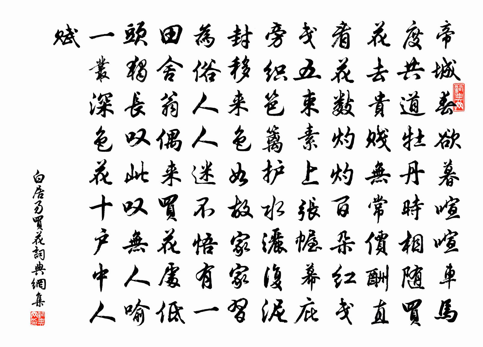 這一年暮春,長安城中車水馬龍,熱鬧非凡,紛來是到了牡丹盛開的時節,長安城裡的名門大戶紛紛相隨前去買花。牡丹花的價錢貴賤不一,價錢多少以花的品種來定。這裡的牡丹有的枝繁葉茂,鮮紅欲滴,小小的束花,方付五捆白絹的價錢。它們被精心呵護著,主人還給張上了帷幕,築起了樊籬,辛勤澆灌之餘還培上了最肥沃的土,因此花的顏色還和以前一樣鮮艷。家家習以為俗,更沒有人認為是錯的。有一個老農無意中也來到了買花的地方。目睹此情景,不由得低頭長嘆,然而此嘆又有誰在意呢:這一叢深色的牡丹花價錢相當於十戶中等人家一年的賦稅了。