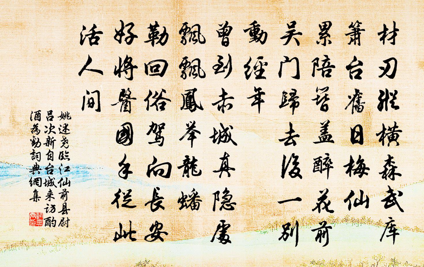 詩詞名句歷史字典書法欣賞書法字典國語詞典說文解字康熙字典古漢語字典標 題 作 者 詩 句 臨江仙(前縣尉呂次新自台城來訪,酌酒為勸)作者:姚述堯 朝代:宋代原文材刃縱橫森武庫,簫台舊日梅仙。累陪簪蓋醉花前。吳門歸去後,一別動經年。曾到赤城真隱處,飄飄鳳舉龍蟠。勒回俗駕向長安。好將醫國手,從此活人間。詩詞問答問:《臨江仙(前縣尉呂次新自台城來訪,酌酒為勸)》的作者是誰?答:姚述堯問:該詩寫於哪個朝代?答:宋代問:該詩是什麼體裁?答:詞書法欣賞臨江仙(前縣尉呂次新自台城來訪,酌酒為勸)書法作品詩詞推薦損翁釋心月〔宋代〕明知為學日有益,不知為道又如何。但覺家貧身漸老,聰明不及舊時多。訪故人鄧肅〔宋代〕天寒歲暮兩無聊,訪戴那辭千里遙。直上洞天三十六,馬蹄迤邐步瓊瑤。琵琶亭梅摯〔宋代〕陶令歸來為逸賦,樂天謫宦起悲歌。有弦應被無弦笑,何況臨弦泣更多。劉生病歸石介〔宋代〕泰山山前有瓊圃,其中不樹蕨與薇。千頭綠竹瑤實甘,百畝玉芝丹粒肥。麒麟于于鳳凰飽,鼓烈奮臆揚清輝。徂徠寄襄城孫主簿蔡襄〔宋代〕昔子尚穉孩,從親來此邑。今子稽簿書,職守仍前襲。歲月曾未幾,風流正相及。新硎刃益銛,舊署墨猶溼。非徒瀘州亂陸游〔宋代〕高寺坡前火照天,南定樓下血成川;從事橫屍太守死,處處巷陌森戈鋋。此州雄跨西南邊,平安烽火夜夜傳;豈知漁父舞史浩〔宋代〕不是神仙那得到。萬頃澄波舞鏡鸞,千尋疊嶂環旌蠶。光天圓玉夜長清,襯地濕紅朝不掃。賓主相逢欲盡歡,昇平山亭柳 贈歌者晏殊〔宋代〕家住西秦, * 藝隨身。花柳上,斗尖新。偶學念奴聲調,有時高遏行雲。蜀錦纏頭無數,不負辛勤。數年來往鹹秦王卷衣文同〔宋代〕鹹陽秦王家,宮闕明曉霞。丹文映碧鏤,光采相鉤加。銅螭逐銀猊,壓屋矜蟠拿。洞戶鎖日月,其中光景賒。春風寄陸同府楊公遠〔宋代〕憶昔輕舟衣錦還,青紅旗幟滿江邊。正逢時節梅將潦,又見池塘柳欲綿。千古棠陰思召伯,一封芝詔下堯天。行看再和郭印〔宋代〕學道無所得,但忘物我情。顏彭竟何在,壽夭皆空名。有酒且斟酌,同心唯友生。江亭縱言笑,鳥來語不驚。昭琴勉送吳國三五新戒歸齊己〔唐代〕法王遺制付仁王,難得難持劫數長。努力只須堅守護,三千八萬是垣牆。山中夜起月色皎然黎廷瑞〔宋代〕倦寐不知夜,開門風露深。明河掛屋角,月出東山岑。雙犢臥齧草,滿地梧桐陰。蔌蔌墮落葉,翻翻動棲禽。浮生故太師和王輓詩三首韓元吉〔宋代〕宿衛登環尹,榮思四十春。威名傳瀚海,功烈上麒麟。卻敵凝山嶽,臨機妙鬼神。中興奉朝請,勞舊總無人。達磨大師贊釋普濟〔宋代〕五一竺國,東震旦土。傳佛心宗,無本可據。無本據,一葦橫趨,大江東去。再次叔通來字詩字韻二首劉學箕〔宋代〕誰念溪翁我念之,折腰為米見諸詩。春秧夏穟苦縈抱,不似東坡更似誰。和陶詩六首和飲酒王阮〔宋代〕竹間固無鎖,俗客自不開。而欲挾彼態,使我變所懷。鄉原善同俗,於德則有乖。乃知違世人,所貴在幽棲。客有予歸示省松楸將以初秋望前汎湖之龍門已戒舟岳珂〔宋代〕擬放平湖月下船,櫂歌中夕髮長川。苹風好為雲開幕,蘭槳不妨人扣舷。猨鶴候迎將曉日,魚龍悲嘯未晴天。玉川菊露謠蒲壽宬〔宋代〕清晨采 * ,露滴露花叢。黃花泣白露,白露唏秋風。秋風莫相試,菊薤心不同。薤露明朝落不落,黃華獨老秋風護國寺秋吟八首白玉蟾〔宋代〕香篆孤煙裊,燈龕寸火微。夢和明月冷,心與白雲飛。名句推薦耕夫召募愛樓船,春草青青萬項田;張繼《閭門即事》 試澆橋下水,今夕到湘中。陳與義《臨江仙·高詠楚詞酬午日》 斷腸片片飛紅,都無人管,倩誰喚、流鶯聲住。辛棄疾《祝英台近·晚春》 自知者英,自勝者雄。王通《中說·卷四·事君篇》 愁凝處,渺渺殘照紅斂吳文英《宴清都·秋感》 大道如青天,我獨不得出。李白《行路難三首》 蒂有餘香金淡泊,枝無全葉翠離披。曹雪芹《殘菊》 旌旆夾兩山,黃河當中流。李白《經亂離後天恩流夜郎憶舊遊書懷贈江夏韋太守良宰》 易醉扶頭酒,難逢敵手棋。賀鑄《南歌子·疏雨池塘見》 散關三尺雪,回夢舊鴛機。李商隱《悼傷後赴東蜀辟至散關遇雪》
