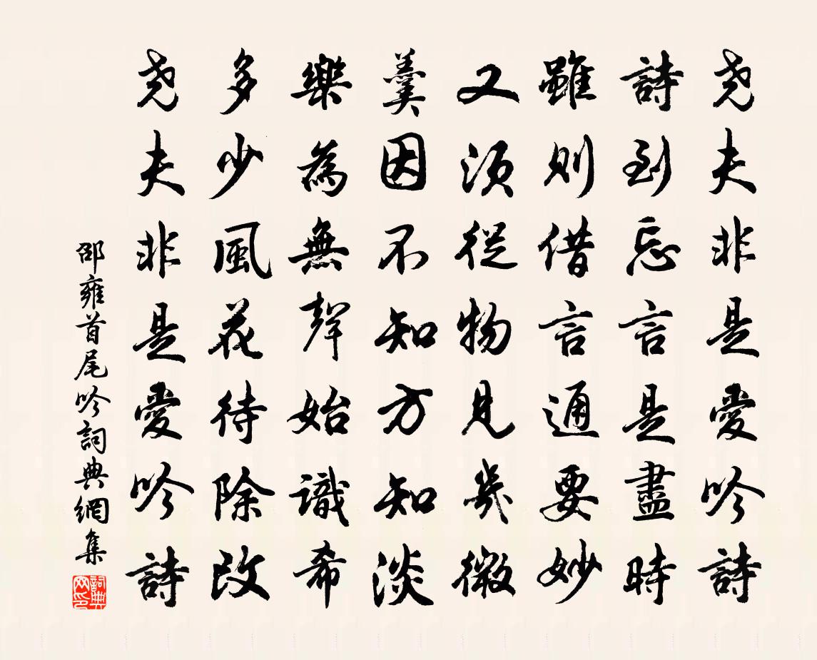 詩詞名句歷史字典書法欣賞書法字典國語詞典說文解字康熙字典古漢語字典標 題 作 者 詩 句 首尾吟作者:邵雍 朝代:宋代首尾吟原文堯夫非是愛吟詩,詩到忘言是盡時。雖則借言通要妙,又須從物見幾微。羹因不知方知淡,樂為無聲始識希。多少風花待除改,堯夫非是愛吟詩。詩詞問答問:首尾吟的作者是誰?答:邵雍問:首尾吟寫於哪個朝代?答:宋代邵雍首尾吟書法欣賞首尾吟書法作品詩詞推薦同韓侍郎游鄭家池吟詩小飲白居易〔唐代〕野艇容三人,晚池流浼浼。悠然倚棹坐,水思如江海。宿雨洗沙塵,晴風盪煙靄。殘陽上竹樹,枝葉生光彩。我本送季同歸龍泉胡仲弓〔宋代〕天寒猶客路,行李況擔書。喚醒江湖夢,歸尋水竹居。詞華須近古,劍氣欲凌望。好趁功名會,言詩特緒餘。次韻薛萬象亭李彌遜〔宋代〕山上非煙靄四隅,山前梗稻綠成區。留雲有計低檐額,得月從多徹戶樞。直是春台熙遠俗,聊為豐屋詩宏圖。公來和袁起岩郎中投贈七字二首楊萬里〔宋代〕故人一別兩相思,不但平生痛飲師。胸次五三真事業,筆端四六更歌詩。閉門覓句今無已,刻意傷春古牧之。臥雪金陵雜興二百首蘇泂〔宋代〕十八年前蜀道還,維舟曾記此龍灣。江流萬里元依舊,藥市蠶叢興未闌。寄進賢令程可久趙蕃〔宋代〕博士湖邊初拜公,後來超化信常通。一官何意偶同隸,千里長懷幾望風。墨綬於今天下半,弦歌誰復古人中。雙魚五方帝佚名〔宋代〕聖考能鄉,宗祀熙成。駿烈惟帝,於皇執衡。茂育元運,降祚丕平。載清斯酌,庸聲精誠。強同年次子輓詩二首陳造〔宋代〕弱歲不好弄,俯窺同隊魚。開編便頭角,諸老辦吹噓。囊錦餘詩草,悲風忽輤車。人今埋玉恨,清淚灑衣裾。別黃岩范令孫應時〔宋代〕慶曆諸名卿,四海標一范。堂堂元佑相,人望復不減。江河源流大,終華峰巒嶄。遠優士會變,詎作欒書黶。君侯癸酉歲元日中書致齋感事晏殊〔宋代〕一葉春王拆瑞筇,八齋西省夕香濃。多年不宿金閨署,半夜再聞長樂鍾。卻展舊編探史漢,更慚高步接夔龍。十思暑行張鎡〔宋代〕誰敲白石生熱煙,舉頭見嶺思回鞭策。修竹林間有寒甃,莫打渴烏教近前。頌古二十五首釋崇岳〔宋代〕出水何如未出水,蓮花荷葉有來田。定光金地遙招手,智者江陵暗點頭。郭西陸游〔宋代〕鵲下川原黑,船行浦漵空。橋燈搖水影,樓角散天風。野眺飛埃外,漁歌冷翠中。不須嘲病翼,要是脫樊籠。次韻雪後方回〔宋代〕檐澌余滴濺風櫺,三日晴猶剩半庭。足使蝗蝻俱屏跡,未妨鶯燕尚潛形。調鹽凍字難為墨,透瓦炊煙漸放青。共笑送章升之料院自魚關還闕項安世〔宋代〕憶侍先皇二紫宸,殿頭親見鎖廳人。畫檐宮燭程書了,黃牒青袍拜賜頻。萬使回朝天亦老,十年旅食夢如新。當時旦起張耒〔宋代〕漫漫東牖白,開帷納晨光。欠伸推夜枕,叩齒披朝裳。瓦盎汲石泉,漱濯齒頰涼。維茲孟夏初,宿雨清高堂。棲鳥次郭秘正韻陳造〔宋代〕伊昔乃祖使朔幽,艱難以來無此流。節旄欲盡氣彌厲,始元屬國真其疇。清篇神護到江表,河梁訴別豈所侔。嗣孫西山桐十詠桐葉陳翥〔唐代〕吾有西山桐,下臨百丈溪。布葉雖遲遲,庇根亦萋萋。密類張翠幄,青堪翦封圭。滑澤經日久,濡毳隨乾躋。近風送單十三畢五歸王昌齡〔唐代〕寒江綠竹楚雲深,莫道離憂遷遠心。曉夕雙帆歸鄂渚,愁將孤月夢中尋。野水錢昭度〔宋代〕野水光如壁,澄心不覺勞。與天無表里,共月見分毫。綠好磨長劍,清宜泛小舠。淡交今已矣,惆悵越波濤。名句推薦千里鶯啼綠映紅,水村山郭酒旗風。杜牧《江南春》 盡叫得鵑聲碎,卻教人空斷腸。阿魯威《湘妃怨·夜來雨橫與風狂》 水至清則無魚,人太急則無智。佚名《增廣賢文·上集》 山氣日夕佳,飛鳥相與還。陶淵明《飲酒·其五》 秋風生渭水,落葉滿長安。賈島《憶江上吳處士》 榮寵有初,鮮有終者;吉凶無常,智者少禍。來俊臣《羅織經·固榮卷第六》 丈夫一言許人,千金不易。司馬光《資治通鑑·唐紀二》 卷峭寒萬里,平沙飛雪。吳文英《暗香疏影·夾鍾宮賦墨梅》 柳如眉,雲似發,鮫綃霧縠籠香雪。魏承班《漁歌子·柳如眉》 桂花浮玉,正月滿天街,夜涼如洗。文徵明《念奴嬌·中秋對月》