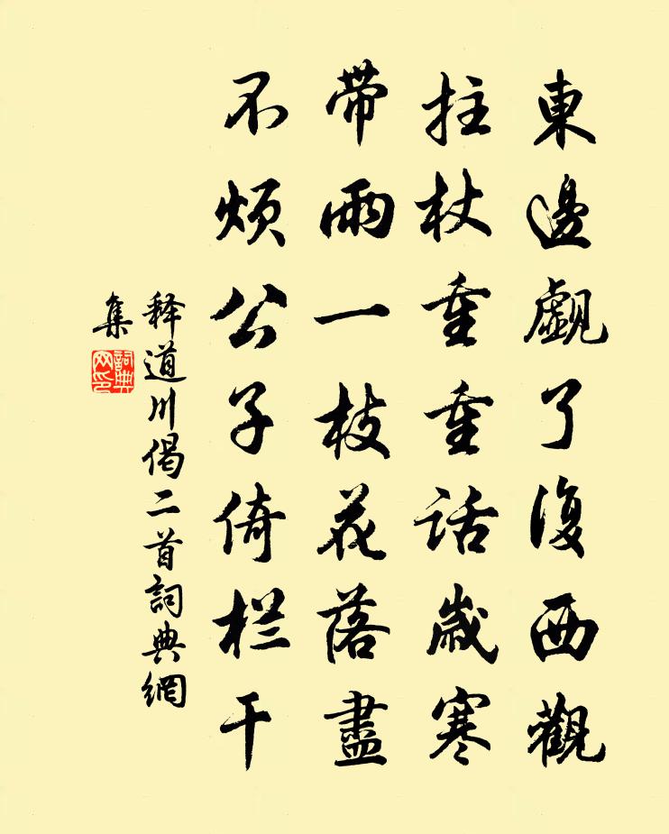 詩詞名句歷史字典書法欣賞書法字典國語詞典說文解字康熙字典古漢語字典標 題 作 者 詩 句 偈二首作者:釋道川 朝代:宋代偈二首原文東邊覷了復西觀,拄杖重重話歲寒。帶雨一枝花落盡,不煩公子倚欄乾。詩詞問答問:偈二首的作者是誰?答:釋道川問:偈二首寫於哪個朝代?答:宋代釋道川偈二首書法欣賞偈二首書法作品詩詞推薦游莊嚴寺園賀鑄〔宋代〕石楠花落小池清,獨下平橋弄扉行。蔽日綠陰無覓處,不如歸去兩三聲。題村舍杜牧〔唐代〕三樹稚桑春未到,扶床乳女午啼飢。潛銷暗鑠歸何處?萬指侯家自不知。和野菜吟趙希逢〔宋代〕人生何用廣田宅,憂懷千歲不滿百。飢來糲飯薦苜蓿,不必膾魯更炮鱉。何人日流餓虎涎,望望一飽蟻慕羶。豈知山中吟陳允平〔宋代〕山深春亦寒,野鳥聲綿蠻。山花隨處發,香風吹幽蘭。頭白吟邵雍〔宋代〕頭白已多時,況能垂白髭。不如猶甚幸,竊比未全衰。潤屋雖無鏹,承家卻有兒。敢言貧淨潔,似我亦應稀。登甘露寺閣王令〔宋代〕忽忽勞生歲月催,時偷高跡出浮埃。風沾草樹紅朝動,春入川源綠夜回。欲出壯懷臨八極,可無樽酒到高台。江山又聞邊報四首劉克莊〔宋代〕八駿西遊造父驂,六飛草草幸東南。故宮久嘆生禾黍,急驛毋煩貢荔柑。自古廟謨勞聖慮,即今軍事有人參。行宮太上皇后合端午帖子詞汪應辰〔宋代〕中興雖帝業,內治本陰功。天下供榮養,方知福報崇。送吉州詹守五首彭龜年〔宋代〕骨鯁嘉言憶舊臣,故應赴詔近嚴宸。席前若下清明問,且說江南一味貧。次韻林次中九日都下感事二首蘇頌〔宋代〕桃杏初開已去家,又逢蘭菊綻新花。感時謾綴茱萸佩,惜別應憐棠棣華。迢遞宦遊來日下,悠揚歸思繞天涯。一尊謁翰林劉學士不遇李山甫〔唐代〕夢繞清華宴地深,洞宮橫鎖曉沈沈。鵬飛碧海終難見,鶴入青霄豈易尋。六尺羈魂迷定止,兩行愁血謝知音。平生冬不出吟邵雍〔宋代〕冬非不欲出,欲出苦日短。年老恐話長,天寒怕歸晚。山翁頭有風,鄉友情非淺。必欲相招延,春光況不遠。次韻蘇守金橘陳棣〔宋代〕孤根移植自秋山,長養潛私刺史天。青女染成金色淺,馮夷剖出蚌胎圓。慚非甘吉曾同傳,恥與楊盧議並肩。況有重建東堂程九萬〔宋代〕宦遊偶落雲水鄉,恥以貧墨為吏商。三年寄傲南窗月,一瓣為炷東堂香。翛然清風揖佳客,好古博雅真揚揚。舊題送傅守歸劉宰〔宋代〕令行肅觀學,仁施先困窮。適此饑饉餘,喟彼杼軸空。勞來窮人謀,祈禳與天通。那得三百州,落落旨此公。頌證道歌證道歌釋印肅〔宋代〕大丈夫,秉慧劍,一掃邪魔如掣電。金剛三昧獨威雄,不見觀音誰得見。江城子(海棠花下燒燭詞)劉辰翁〔宋代〕紅欹醉袖殢闌乾。夜將闌。去難拚。燒蜜調蜂,重照錦團欒。春到洞房深處暖,方知道,月宮寒。枝枝紅淚不曾乾經故翰林袁學士居溫庭筠〔唐代〕劍逐驚波玉委塵,謝安門下更何人。西州城外花千樹,儘是羊曇醉後春。望巫山張喬〔唐代〕溪疊雲深轉谷遲,暝投孤店草蟲悲。愁連遠水波濤夜,夢斷空山雨雹時。邊海故園荒後賣,入關玄發夜來衰。東歸達磨大師贊釋普濟〔宋代〕的的西天末法僧,來分此土最初燈。神光冷地一吹滅,蔥嶺忙忙只暗登。名句推薦漢家君臣歡宴終,高議雲台論戰功。王維《少年行四首》 哀哀父母,生我勞瘁。佚名《蓼莪》 惟有河邊雁,秋來南向飛。庾信《重別周尚書》 泥落畫梁空,夢想青春語。吳文英《生查子·秋社》 關山正飛雪,烽火斷無煙。王維《隴西行》 自是人生長恨水長東。李煜《相見歡·林花謝了春紅》 笑十三楊柳女兒腰,東風舞。岳珂《滿江紅·小院深深》 花徑不曾緣客掃,蓬門今始為君開。杜甫《客至》 烈士暮年,壯心不已。曹操《龜雖壽》 人有不及,可以情恕。房玄齡《晉書·列傳·第六章》