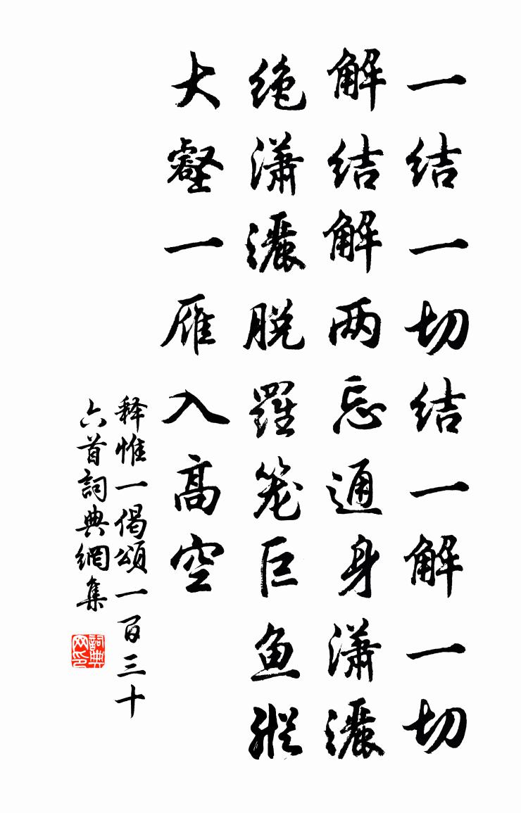 詩詞名句歷史字典書法欣賞書法字典國語詞典說文解字康熙字典古漢語字典標 題 作 者 詩 句 偈頌一百三十六首作者:釋惟一 朝代:宋代偈頌一百三十六首原文一結一切結,一解一切解。結解兩忘,通身瀟灑。絕瀟灑,脫羅籠。巨魚縱大壑,一雁入高空。詩詞問答問:偈頌一百三十六首的作者是誰?答:釋惟一問:偈頌一百三十六首寫於哪個朝代?答:宋代釋惟一偈頌一百三十六首書法欣賞偈頌一百三十六首書法作品詩詞推薦九峰過重陽陳藻〔宋代〕登高卻是今最高,九峰寺上誦莊騷。茶話恰宜湯餅素,滿身風癢怕村醪。過廣安吊張才叔諫議陸游〔宋代〕春風疋馬遇孤城,欲吊先賢涕已傾。許國肺肝知激烈,照人眉宇尚崢嶸。中原成敗寧非數,後世忠邪自有評。嘆息送沈少府之任淮南劉長卿〔唐代〕惜君滯南楚,枳棘徒棲鳳。獨與千里帆,春風遠相送。此行山水好,時物亦應眾。一鳥飛長淮,百花滿雲夢。相期步蟾宮章謙亨〔宋代〕團圞小酌醺醺醉。廝捱著、沒人肯睡。呼盧直到五更頭,便鋪了妝檯梳洗。庭前鼓吹喧人耳。驀忽地、又添一歲。減字木蘭花(戲萬安胡簿)郭應祥〔宋代〕棲鸞高士。文採風流誰得似。年德雖高。對酒當歌氣尚豪。明眸皓齒。一朵紅蓮初出水。膝上安排。愛惜須教不離史魏公東湖別墅二首劉應時〔宋代〕雲抹山容疑潑綠,月涵波影自搖金。丈夫出處如雲月,猿鶴安能識此心。雜曲歌辭。攜手曲田娥〔唐代〕攜手共惜芳菲節,鶯啼錦花滿城闕。行樂逶迤念容色,色衰只恐君恩歇。鳳笙龍管白日陰,盈虧自感青天月。丙申元日五絕方回〔宋代〕新年仍著舊年衣,老健深慚七十希。一炷爐香拜天地,今春早早買船歸。阮郎歸(西湖春暮)馬子嚴〔宋代〕清明寒食不多時。香紅漸漸稀。番騰妝束鬧蘇堤。留春春怎知。花褪雨,絮沾泥。凌波寸不移。三三兩兩叫船兒。代上余太宰生辰強至〔宋代〕瑞挺真儒翊聖時,溈山秀氣育豐規。慶符昌運千齡會,前應中秋十日期。天上光連奎昴宿,人間身占鳳凰池。枌榆鷓鴣天 為朱氏小妓繡蓮賦三首張翥〔元代〕半臂京綃穩稱身。玉為顏面水為神。一痕頭導分雲綰,兩點眉山入翠顰。丹杏小,碧桃新。雛鶯恰囀上林春。平生苦竹村南馬上賀鑄〔宋代〕楚澤薰風后,林皋夕照間。漁船沿綠岸,鳥道轉荒山。久負杯中樂,長偷馬上閒。悠悠白門路,何日杖藜還。金牛長老德鎧寫平園真求贊周必大〔宋代〕經傳白馬,寺假金牛。祖意西來,江水東流。於我何有,色見音求。千帆任過,長對沙洲。得片石著歲寒欄乾外二首錢時〔宋代〕梅竹交陰晚更奇,等閒片石亦相宜。此時亭上瀟瀟雨,牆外行人卻未知。二公見和又成一首寄之吳芾〔宋代〕憶昔同台接勝游,相期端不愧清流。一時人物存無幾,百歲光陰挽不留。老去只思陶靖節,向來尤嘆薛居州。亦聞題籌筆驛武侯祠孫應時〔宋代〕北出當年此運籌,悠然欹臥與神謀。三軍節制馴貔虎,千里餱糧捷馬牛。漢業興亡惟我在,蜀山重複遣人愁。驛前將軍一首蘇籀〔宋代〕將軍義勇名,蜂蟻嘗旅拒。俯邇建赤油,超搖揮白羽。不辭援鼓桴,豈以遺君父。匈奴恨未滅,致官逾噲伍。麾下大兒時中堂成德修弟喜而賦之因次元韻陶夢桂〔宋代〕有譚名利者,耳若了不聞。心乎平似水,身也懶於雲。眇眇居人世,駸駸過隙曛。田園趣歸去,風月謾平分。有子閒趣陸游〔宋代〕堅閉門來又過冬,一裘且復擁龍鍾。不辭陋巷如漿冷,自愛新醅似粥醲。迎婦橋邊燈煜煜,賽神林外鼓冬冬。豈惟王子開朝散早年以疾病謝事還江陰求詩為別三張耒〔宋代〕田園何日到,水國洗秋寒。興來出飲酒,興罷歸杜門。漫郎游已倦,老眼亂丹鉛。扁舟肯載我,共看雪濤翻。名句推薦清娥畫扇中,春樹鬱金紅。溫庭筠《清明日》 枝枝相覆蓋,葉葉相交通。佚名《孔雀東南飛 / 古詩為焦仲卿妻作》 不以規矩,不能成方圓孟子《孟子·離婁章句上·第一節》 人生有酒須當醉,一滴何曾到九泉。高翥《清明日對酒》 綠樹暗長亭,幾把離尊,陽關常恨不堪聞。陸游《浪淘沙·丹陽浮玉亭席上作》 半壁見海日,空中聞天雞。李白《夢遊天姥吟留別 / 別東魯諸公》 綴玉聯珠六十年,誰教冥路作詩仙。李忱《吊白居易》 樂極生悲,否極泰來。施耐庵《水滸傳·第二十六回》 接天蓮葉無窮碧,映日荷花別樣紅。楊萬里《曉出淨慈寺送林子方》 兄弟不睦,則子侄不愛顏之推《顏氏家訓·兄弟篇》