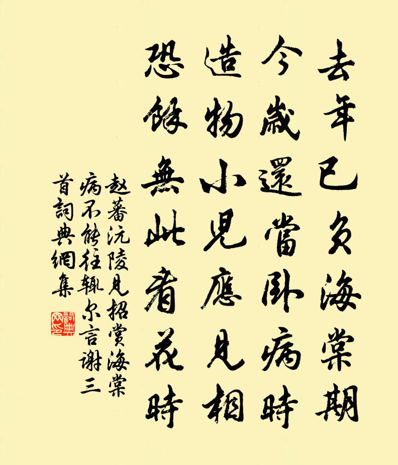 詩詞名句歷史字典書法欣賞書法字典國語詞典說文解字康熙字典古漢語字典標 題 作 者 詩 句 沅陵見招賞海棠病不能往輒爾言謝三首作者:趙蕃 朝代:宋代原文去年已負海棠期,今歲還當臥病時。造物小兒應見相,恐余無此看花時。詩詞問答問:《沅陵見招賞海棠病不能往輒爾言謝三首》的作者是誰?答:趙蕃問:該詩寫於哪個朝代?答:宋代書法欣賞沅陵見招賞海棠病不能往輒爾言謝三首書法作品詩詞推薦見牽牛花有感釋寶曇〔宋代〕籬落牽牛又著花,摘花心在鬢先華。故園紅染薑絲在,安得緘封寄各槎。過蕉塤楊萬里〔宋代〕楓葉乾余尚小紅,苕花飛盡不留茸。經旬欲雪還無雪,只作清寒惱殺儂。題李彥澤紫雲洞郭印〔宋代〕老李天中仙,一念人間世。簪裳四十秋,不取公卿位。星斗爛文章,日月懸忠義。緣斷還帝鄉,飄飄若蟬蛻。玉骨挽諸葛壽之孫應時〔宋代〕命矣三年病,在乎百歲期。屍饔猶有母,傳業更無兒。便作平生盡,空多國士知。增光在金友,人得記堝篪。禪人並化主寫真求贊釋正覺〔宋代〕瘦骨岩岩,殘毳毿毿。坐寒雲巘,心空月潭。虛應亡機而若谷,深禪有口而如鉗。槃珠勿遺其色,囊錐不露其尖。聞蛩有感張耒〔宋代〕遙夜飛螢動秋思,獨臥空山驚晚歲。可堪六月已聞蛩,日暮咿咿響庭際。關河多風氣蕭索,碧樹先秋早搖落。鳴機雪中雪坡十憶姚勉〔宋代〕近郊勝處小雲居,一水如龍湊佛廬。長記釣蓑披雪去,磚爐溫酒煮溪魚。送嚴陵汪學正巽元並寄趙賓暘方回〔宋代〕子去桐江路,諸生迓水濱。為言前郡守,獨憶老詩人。揖拜衣冠古,歌游棟宇新。故吾誰見念,辛苦戰場塵。和張倅湖上十絕姜特立〔宋代〕休日吟邊引興長,豈容簿領更相妨。怪君詩思如河決,曾夢西江水滌腸。再次韻趙帥見寄三首陳造〔宋代〕枝撐強趁火城春,蹤跡猶煩問水濱。更醉南州好紅紫,凝香詩伯虹化神。立春前二日獲雪宋祁〔宋代〕佳雪春前降,層陰臘外留。日昏霏霰集,風定舞花稠。浩氣皚皚遍,繁光袞袞流。灑林初亂塢,拂瓦暗平溝。洞矗感禿鶖潛吟顧夐〔唐代〕昔日曾看瑞應圖,萬般祥瑞不如無。摩訶池上分明見,仔細看來是那鶘。春暮吟邵雍〔宋代〕禽不通人情,唯知春已暮。亦或叫提壺,亦或叫歸去。題袁氏別業 / 偶游主人園賀知章〔唐代〕主人不相識,偶坐為林泉。莫謾愁沽酒,囊中自有錢。送別友人詩沈約〔南北朝〕君東我亦西。銜悲涕如霰。浮雲一南北。何由展言宴。方作異鄉人。贈子同心扇。遙裔發海鴻。連翻出檐燕。春秋【雙調】沉醉東風 宮詞孫周卿〔元代〕雙拂黛停分翠羽,一窩雲半吐犀梳。寶靨香,羅襦素,海棠嬌睡起誰扶?腸斷春風倦繡圖,生怕見紗窗唾縷。花月石洞二首李流謙〔宋代〕香霧團成蓋,茶花白勝酥。對書閒境界,覓句靜工夫。客信因魚得,歸程約雁俱。庭前海棠樹,尚及一看無。偈頌一百零二首釋慧遠〔宋代〕大哉花釋迦文,花生下便作花怪。南北花東西行,點胸也忒殺。棄捨輪王位,反受父母拜。六載向雪山,精進修淨夜題玉泉白居易〔唐代〕遇客多言愛山水,逢僧盡道厭囂塵。玉泉潭畔松間宿,要且經年無一人。入夜應潭對岸作示成父趙蕃〔宋代〕溪山風月兩相當,痼疾真成得秘方。往日同舟但饒信,只今去路落湖湘。貧離親戚古所嘆,歸去田園老未忘。試趼名句推薦有真性情,須有真涵養:有大識見,乃有大文章。王永彬《圍爐夜話·第一六二則》 家家乞巧望秋月,穿盡紅絲幾萬條。林傑《乞巧》 雨里雞鳴一兩家,竹溪村路板橋斜。王建《雨過山村》 富貴必從勤苦得,男兒須讀五車書。杜甫《柏學士茅屋》 小桃無主自開花,菸草茫茫帶曉鴉。戴復古《淮村兵後》 故人西辭黃鶴樓,煙花三月下揚州。李白《黃鶴樓送孟浩然之廣陵》 命如南山石,四體康且直佚名《孔雀東南飛並序/古詩為焦仲卿妻作》 勸君莫打枝頭鳥,子在巢中望母歸。白居易《鳥》 人閒桂花落,夜靜春山空。王維《鳥鳴澗》 峻法,所以凌過游外私也;嚴刑,所以遂令懲下也。韓非及後人《韓非子·有度》