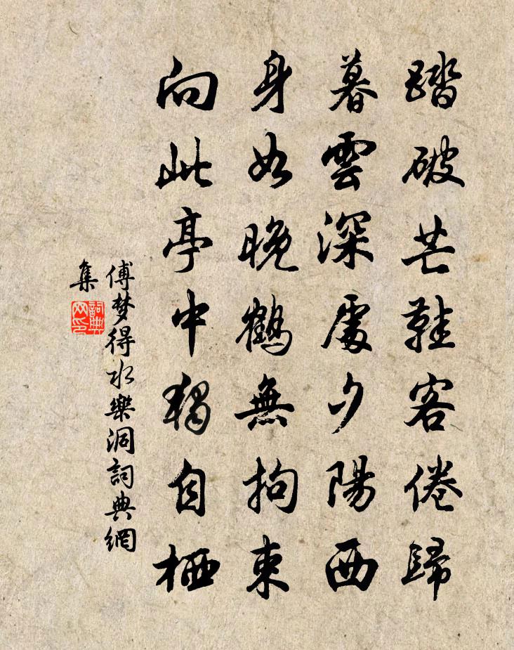 詩詞名句歷史字典書法欣賞書法字典國語詞典說文解字康熙字典古漢語字典標 題 作 者 詩 句 水樂洞作者:傅夢得 朝代:宋代水樂洞原文踏破芒鞋客倦歸,暮雲深處夕陽西。身如晚鶴無拘束,向此亭中獨自棲。詩詞問答問:水樂洞的作者是誰?答:傅夢得問:水樂洞寫於哪個朝代?答:宋代傅夢得水樂洞書法欣賞水樂洞書法作品詩詞推薦沿溪轉山入野亭小飲甚適袁說友〔宋代〕惜此青青一日春,愛閒因得兩三人。放身度密窮山崦,隨意居寬趁水濱。逸飲不成愁淡薄,苦吟終是喜清新。物華黃山遇雨汪兼山〔宋代〕乾坤老我頭先白,山水無情眼自青。三十六峰藏不得,小窗趺坐看圖經。賀新郎(代壽趙饒州)張輯〔宋代〕綠蔭涼尊俎。映雙旌、飛翻新帶,日邊恩露。千里湖山添鮮碧,玉宇光浮眉嫵。料范老、應難獨步。君亦胸中兵十至道初元六月不雨為民冒暑乞靈龍湫投辭未竟王挺之〔宋代〕欲呼雲雨沃焦田,裊裊籃輿入翠煙。萬仞孤高隨鳥道,一潭澄碧快龍眠。浮丘黃帝真成道,漢武秦皇謾學仙。但願梅趙崇鉘〔宋代〕新陽斡坤軸,枯朽皆光榮。稜層冰雪中,復見天地精。姑射神所為,伯夷聖之清。太白抱轗軻,靈均擁芳馨。是子揚州送別薛廷玉〔宋代〕匹馬揚州路,香開幾樹花。春光無揀擇,淮池亦繁華。日沸長江水,風昏古戰沙。爭雄舊時事,君去莫思家。出郊偶賦吳潛〔宋代〕聊驅小隊出郊圻,天遣涼風卻午曦。雨腳似披千疋練,山容如障數層帷。並岸低疇苗頷長,近坡高隴稻頭垂。因他念奴嬌遊子西〔宋代〕暑塵收盡,快晚來急雨,一番初過。是處涼飆回爽氣,直把殘雲吹破。星律飛流,銀河搖盪,只恐冰輪墮。雲梯穩結襪子楊維楨〔元代〕漢家九陛飛秋霜,公卿會立朝明堂。王生何人談老黃,廷辱廷尉理不山。廷尉跪結襪,有如壯夫出胯下,面無慚色上寵市早飯趙蕃〔宋代〕霧合疑為雨,雲開復變晴。梨花高朵盛,柳樹弱枝榮。問寺山場遠,逢虛旅飯營。侵晨王事起,亭午野田行。送李評事往宜春齊己〔唐代〕蘭舟西去是通津,名郡賢侯下禮頻。山遍寺樓看仰岫,台連城閣上宜春。鴻心夜過鄉心亂,雪韻朝飛句韻新。別有撰孔子正言竟述懷詩蕭衍〔南北朝〕志學恥傳習。弱冠闕師友。愛悅夫子道。正言思善誘。刪次起實沉。殺青在建酉。孤陋乏多聞。獨學少擊叩。仲冬侍宴賦是歸雁徐鉉〔唐代〕夜靜群動息,翩翩一雁歸。清音天際遠,寒影月中微。何處雲同宿,長空雪共飛。陽和常借便,免與素心違。再和元禮春懷十首黃庭堅〔宋代〕風光琰琰動春華,回首煙波萬里賒。山似翠屏西子國,溪如罨畫越王家。壽太守王邁〔宋代〕生申維岳詠松高,孕秀儲精歲月多。盛旦上元開甲子,前朝令節紀中和。銅符暫沖雄藩印,寶鴨行鳴禁路歌。天佑蟠雪夜登浦金樓遠望西山憶仲靈洒然有邁世之楊蟠〔宋代〕家占西湖島上雲,雪光月色更侵魂。興來爛漫心空老,詩罷蒼茫眼正昏。晉國衣冠何處覓,梁朝殿閣儼猶存。思君送無灰酒周馬師口占三絕劉宰〔宋代〕奉寄無灰酒十罌,不杯入藥可長生。藥成預約分酬我,眉壽相期比老彭。過松源,晨炊漆公店六首楊萬里〔宋代〕政是行人腸斷時,子規得得向人啼。若能淚得居人臉,始信春愁總為伊。雙調望江南(胡盤居生日)劉辰翁〔宋代〕盤之所,春蝶舞晴暄。溪傍野梅根種玉,牆圍修竹筍生鞭。深院待回仙。嘉熙好,四十二年前。猶記五星丁卯聚,送青神丞劉平仲解官三絕史堯弼〔宋代〕祖烈班班汗簡編,鄉來人物覺尤賢。轅攀耆老空遺恨,不受渠儂一大錢。名句推薦綠竹入幽徑,青蘿拂行衣。李白《下終南山過斛斯山人宿置酒》 壯心未與年俱老,死去猶能作鬼雄。陸游《書憤五首·其二》 脅肩諂笑,病於夏畦。孟子《孟子·滕文公章句下·第七節》 樓前柳,憔悴幾秋風。賀鑄《小重山·花院深疑無路通》 疏星淡月鞦韆院,愁雲恨雨芙蓉面。張可久《塞鴻秋·春情》 中秋月。月到中秋偏皎潔。徐有貞《中秋月·中秋月》 應知早飄落,故逐上春來。何遜《詠早梅 / 揚州法曹梅花盛開》 楚江湄,湘娥乍見,無言灑清淚周密《繡鸞鳳花犯·賦水仙》 催成清淚,驚殘孤夢,又揀深枝飛去。陸游《鵲橋仙·夜聞杜鵑》 自笑好山如好色,只今懷樹更懷人。閒愁閒恨一番新。辛棄疾《浣溪沙·偕叔高子似宿山寺戲作》