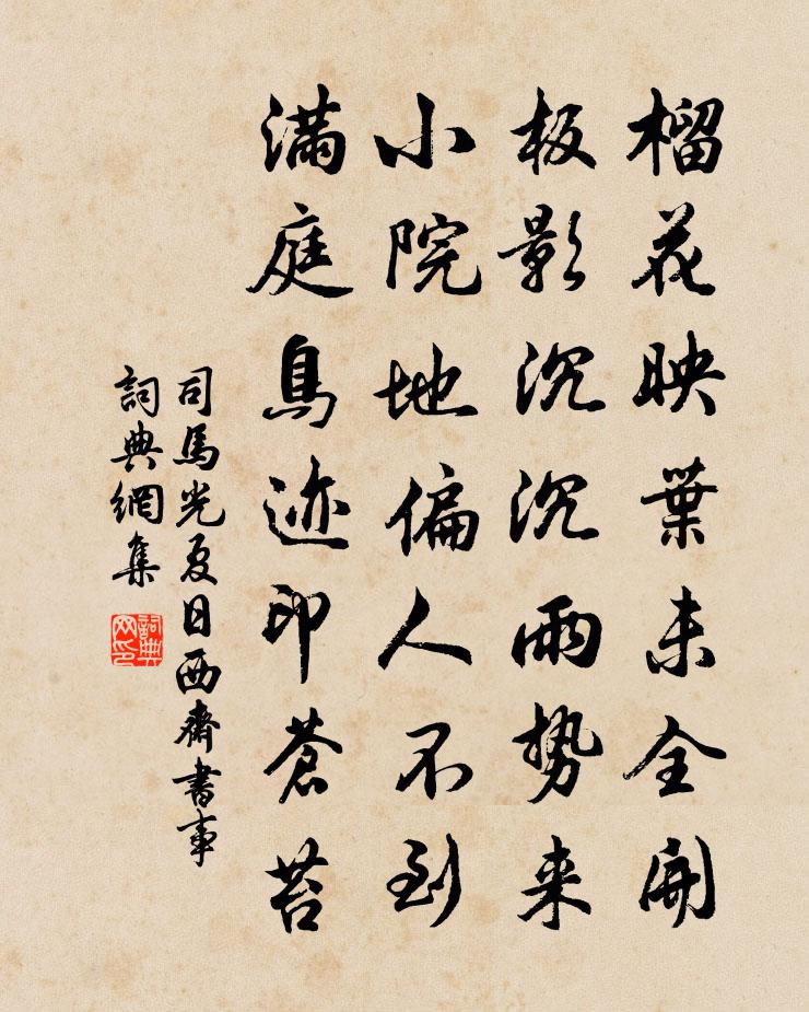 榴花映葉未全開,板影沉沉雨勢來。小院地偏人不到,滿庭鳥跡印蒼苔。