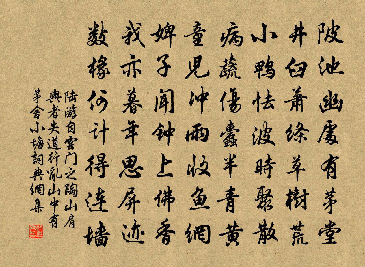 陂池幽處有茅堂,井臼蕭絛草樹荒。小鴨怯波時聚散,病蔬傷蠹半青黃。