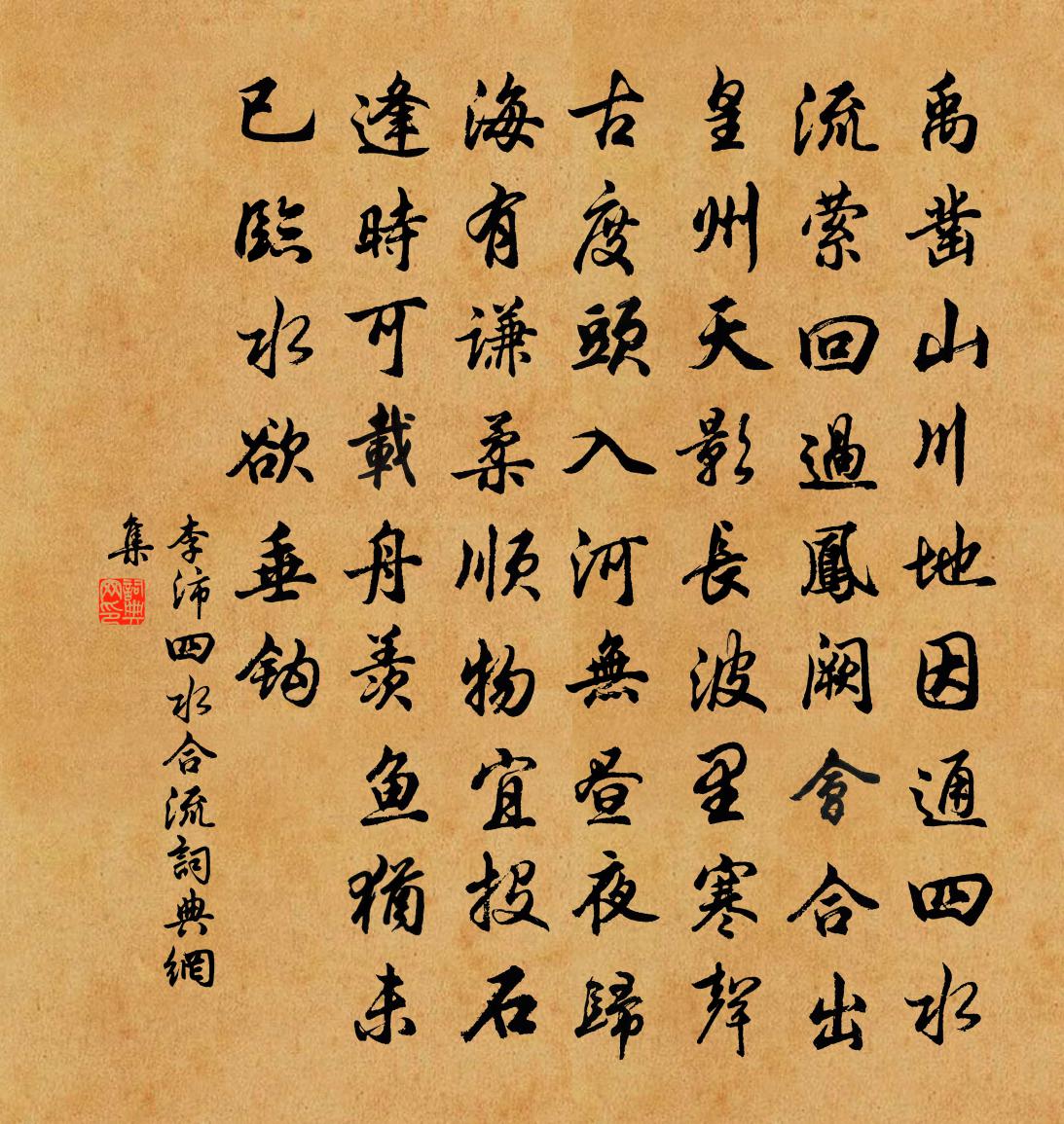 詩詞名句歷史字典書法欣賞書法字典國語詞典說文解字康熙字典古漢語字典標 題 作 者 詩 句 四水合流作者:李沛 朝代:唐代四水合流原文禹鑿山川地,因通四水流。縈迴過鳳闕,會合出皇州。天影長波里,寒聲古度頭。入河無晝夜,歸海有謙柔。順物宜投石,逢時可載舟。羨魚猶未已,臨水欲垂鉤。詩詞問答問:四水合流的作者是誰?答:李沛問:四水合流寫於哪個朝代?答:唐代問:四水合流是什麼體裁?答:五排李沛四水合流書法欣賞四水合流書法作品注釋全唐詩:卷780-10詩詞推薦送李鐔游新安杜荀鶴〔唐代〕邯鄲李鐔才崢嶸,酒狂詩逸難乾名。氣直不與兒輩洽,醉來擬共天公爭。孤店夜燒枯葉坐,亂時秋踏早霜行。一間謝傅參議彥濟惠筍用山谷韻黃公度〔宋代〕北方九月霜,賓盤無生菜。嶺南信地暖,窮冬竹萌賣。君念庾郎貧,繭栗供庖宰。中有歲寒姿,真時久不壞。前身二月朔大雪已五日三首方回〔宋代〕侵尋半月是花朝,大雪漫天五日飄。臘月如春眾芳吐,繁華時節卻蕭條。悲納鐵張祜〔唐代〕長聞為政古諸侯,使佩刀人盡佩牛。誰謂今來正耕墾,卻銷農器作戈矛。舞鶴曾鞏〔宋代〕蓬瀛歸未得,偃翼清溪陰。忽聞瑤琴奏,遂舞玉山岑。舞罷復嘹唳,誰知天外心。黃昏小雨中蹔憩蒼頭在傍雲初未嘗得瞑予乃甚陸游〔宋代〕人看初無寐,形勞幸少休。夢魂雖栩栩,鼻息未齁齁。輕若風中絮,浮如水上漚。死生君了否?試向此中求。送馮尊師王禹偁〔宋代〕前日訪潘閬,下馬入窮巷。忽見雙筍石,臥向青苔上。雲是馮尊師,秋來留在茲。今說東南行,問我堅乞詩。又見秦樓月/憶秦娥黎廷瑞〔宋代〕葉葉里。一枝冷浸銅瓶水。銅瓶水。飛英簇簇,硯屏香幾。夜來雪片敲窗紙。半衾芳夢相料理。相料理。梨花漠漠秋夕文宴得遙字皮日休〔唐代〕啼螿衰葉共蕭蕭,文宴無喧夜轉遙。高韻最宜題雪贊,逸才偏稱和雲謠。風吹翠蠟應難刻,月照清香太易消。無限登嵩山十首 石徑蘇轍〔宋代〕蒼壁上參天,微徑隨流水。聱牙石齒亂,紛薄黃葉委。牽攀不得上,顛仆幾將止。勉強終此行,更老知難至。紀夢陳藻〔宋代〕自從弱冠為遊子,玉融丹井壺山市。喔詩不用著工夫,已謫牂牁四千里。柳侯未五十,羅池作刺史。翰苑失詞華,宿鹽田驛用黃大聲韻李洪〔宋代〕使節經行地,南訛夏日長,盾威知畏仰,暑雨助清涼。叱馭登閩嶠,鳴珂入帝鄉。拂塵來者敬,妙墨尚淋浪。浣溪沙黃時龍〔宋代〕雨歇花梢月正明。映簾人靜繡燈昏。鴛鴦成字便停針。笑啟玉奩明酒暈,緩尋金葉熨香心。一春情緒此時深。蕭蕭張耒〔宋代〕蕭蕭風雨五更初,枕上秋聲獨井梧。只有菊花猶灼灼,苦教摧拉就荒蕪。滿庭芳 寄馬行街董公書馬鈺〔元代〕同侗稽首,董公道偉。自遠清論三歲。渴德之懷,筆舌豈能盡意。伏想邇來法候,愈沖和、燕居無滯。予今則,處江上阻風宋祁〔宋代〕百尺危檣倚曙空,古祠簫鼓隔丹楓。誰將一隻仙人箭,換作樵溪旦暮風。則堂文天祥〔宋代〕北入京城,賈餘慶迎逢賣國。既令學士降詔,俾天下州郡歸附之。又各州付一省劄,惟樞密則堂、家先生鉉翁於省夏日登樓晚望姚合〔唐代〕避暑高樓上,平蕪望不窮。鳥窮山色去,人歇樹陰中。數帶長河水,千條弱柳風。暗思多少事,懶話與芝翁。偈頌六十八首釋法薰〔宋代〕若論此事,何必多言。不在內,不在外,不在中間,離婁行處浪滔天。雜曲歌辭。昔昔鹽。蟠龍隨鏡隱趙嘏〔唐代〕鸞鏡無由照,蛾眉豈忍看。不知愁發換,空見隱龍蟠。那愜紅顏改,偏傷白日殘。今朝窺玉匣,雙淚落闌乾。名句推薦悵恨不逢如意酒。尋思難值有情人。晏幾道《浣溪沙·閒弄箏弦懶系裙》 妙年出補父兄處,公自才力應時須黃庭堅《送范德孺知慶州》 暮雨忽來鴻雁杳,莽關山、一派秋聲里。龔自珍《金縷曲·癸酉秋出都述懷有賦》 數年來往鹹京道,殘杯冷炙謾消魂晏殊《山亭柳·贈歌者》 散關三尺雪,回夢舊鴛機。李商隱《悼傷後赴東蜀辟至散關遇雪》 德不孤,必有鄰。孔子弟子《論語·里仁篇》 蘭舟斜纜垂揚下,只宜輔枕簟向涼亭披襟散發。白樸《得勝樂·夏》 知者順時而謀,愚者逆理而動范曄《後漢書·列傳·朱馮虞鄭周列傳》 是非只為多開口,煩惱皆因強出頭。佚名《增廣賢文·上集》 再折柳穿魚,賞梅催雪。詹玉《齊天樂·送童瓮天兵後歸杭》