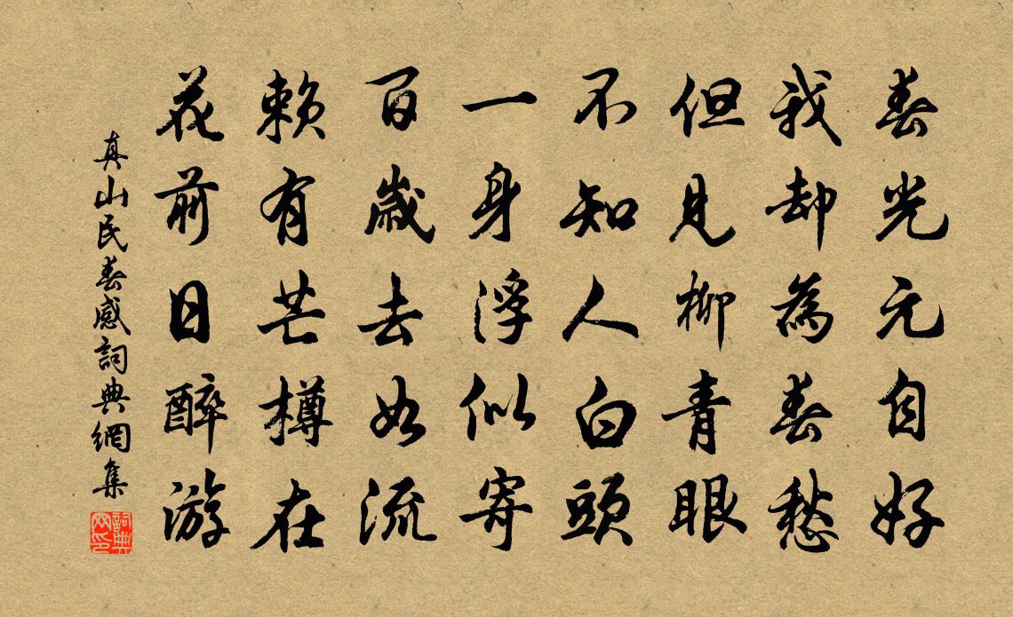 詩詞名句歷史字典書法欣賞書法字典國語詞典說文解字康熙字典古漢語字典標 題 作 者 詩 句 春感作者:真山民 朝代:宋代春感原文春光元自好,我卻為春愁。但見柳青眼,不知人白頭。一身浮似寄,百歲去如流。賴有芒樽在,花前日醉游。詩詞問答問:春感的作者是誰?答:真山民問:春感寫於哪個朝代?答:宋代真山民春感書法欣賞春感書法作品詩詞推薦諸公餞子敦軾以病不往複次前韻蘇軾〔宋代〕君為江南英,面作河朔偉。人間一好漢,誰似張長史。上書苦留君,言拙輒報已。置之勿復道,出處俱可喜。攀輿送金陵胡撫乾仲芳劉過〔宋代〕故家凋喪後,初識澹庵孫。玉樹明庭角,冰澌吐話言。荊州得上幕。楚壤帶中原。多欲附舟去,白魚朱橘繁。讀李益詩賀鑄〔宋代〕君虞興聖孫,詩律早專美。樂府度新聲,宮酺奉天子。鮮風獵蘭苕,華月濯桃李。獨有連眉郎,才稱劣相比。頗聞已亥出南康宮伯稱以詩贈行次韻三首李呂〔宋代〕誰憐甲子混泥塗,老鈍何能展壯圖。方恨此行垂橐去,辱君贈句當駢珠。癸卯除夜聊復爾齋偶題范成大〔宋代〕五夜燈花重,東風角韻來。雪慳衣未纊,春早句多梅。寂歷羅門亞,溫藥黁鼎煨。老嫌新歲換,病喜舊星回。鬱壘金縷曲/賀新郎劉辰翁〔宋代〕曉殿龍光起。御香濃、新詩寫就,雲飛相第。一自騎箕承帝賚,千載君臣魚水。端不負、當年弧矢。赤壁周郎神遊愛月夜眠遲慢佚名〔宋代〕禁鼓初敲,覺六街夜悄,車馬人稀。暮天澄淡,雲收霧卷,亭亭皎月如珪。冰輪碾出遙空,無私照臨千里。最堪憐鳳棲梧/蝶戀花杜安世〔宋代〕別浦遲留戀清淺。菱蔓荷花,盡日妨鉤線。向晚澄江靜如練。風送歸帆飛似箭。鷗鷺相將是家眷。坐對雲山,一任紹興祀大火十二首佚名〔宋代〕聲香接神,肸鄉恍惚。求神以誠,薦誠以物。有籍斯玉,有篚斯幣。是用薦陳,昭茲精意。送陳著作韓維〔宋代〕高才不沉沒,奮筆動天幄。古今明治亂,王霸辨醇駁。文成數千言,粲若玉就琢。拜官諸侯府,千文茲把握。過別望亭驛酬別周判官白居易〔唐代〕何事出長洲,連宵飲不休?醒應難作別,歡漸少於愁。燈火穿村市,笙歌上驛樓。何言五十里,已不屬蘇州。致政大夫胡公輓詩五首周麟之〔宋代〕西帥乘遲日,趨庭正妙年。飛書騰白羽,曳彩汎紅蓮。晚伏追風驥,長嗟墮水鳶。卷舒安義命,何恨及重泉。河北道中懷故鄉強至〔宋代〕一為南國別,久負故園期。細雨破花氣,和風柔柳枝。競舟紅浪動,挑菜綠煙披。寂寞洪河北,桑麻空此時。又次韻四首張嵲〔宋代〕異世如張贄,深居似敬通。致身寧有意,覓句恐無功。世事忘言外,群情一笑中。詩書猶可詠,吾道未終窮。和龔翠岩雨中述懷韻陳深〔宋代〕風流翰墨傅千古,議論文章自一家。靜愛雲林披白苧,懶趙閨闔草黃麻。江山故國閒停櫂,風雨僧窗自淪茶。甚欲偈頌一百五十首釋心月〔宋代〕德山一棒,臨濟一喝。家貧難辦素,事忙不及草。三千里外見譊訛,未免蝦跳不出斗。游洞霄李彙〔宋代〕至真方域古今傳,琳館興從漢武年。石作雙門何突兀,山為九鎖自迴環。仙人隱跡留中路,處士靈壇閟遠巔。甘潔蚤晴發廣安軍,晚宿萍池村莊范成大〔宋代〕夜雨洗煩蒸,曉風薦清穆。雲頭聵鐵山,日腳迸金瀑。暑塗一日涼,遠客萬事足。羈人正奔波,觀者何陸續。翠蓋贈別華岳〔宋代〕惆悵長亭嘆別離,送君東去望西歸。落花也似知人意,沾定春衫不肯飛。過閩關劉基〔明代〕關頭霧露白蒙蒙,關下斜陽照樹紅。過了秋風渾未覺,滿山秔稻入閩中。名句推薦君子多知而擇焉,博學而算焉,多言而慎焉。戴聖《大戴禮記·曾子立事第四十九》 去年花里逢君別,今日花開已一年。韋應物《寄李儋元錫》 秋風生渭水,落葉滿長安。賈島《憶江上吳處士》 正蹇驢吟影,茶煙灶冷,酒亭門閉。吳文英《無悶·催雪》 幽音變調忽飄灑,長風吹林雨墮瓦李頎《聽董大彈胡笳聲兼寄語弄房給事》 焉知後之視今,不如今之視昔也?王通《中說·卷七·述史篇》 月出於東山之上,徘徊於鬥牛之間。蘇軾《前赤壁賦》 出犯繁花露,歸穿弱柳風溫庭筠《清明日》 甘井近竭,招木近伐。墨子《墨子·01章 親士》 時危見臣節,世亂識忠良。鮑照《代出自薊北門行》
