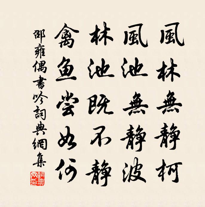 詩詞名句歷史字典書法欣賞書法字典國語詞典說文解字康熙字典古漢語字典標 題 作 者 詩 句 偶書吟作者:邵雍 朝代:宋代偶書吟原文風林無靜柯,風池無靜波。林池既不靜,禽魚嘗如何。詩詞問答問:偶書吟的作者是誰?答:邵雍問:偶書吟寫於哪個朝代?答:宋代邵雍偶書吟書法欣賞偶書吟書法作品詩詞推薦尾犯(重九和劉隨如)趙以夫〔宋代〕長嘯躡高寒,回首萬山,空翠零亂。渺渺清秋,與斜陽天遠。引光祿、清吟興動,憶龍山、舊遊夢斷。袷衣初試,次韻王適留別蘇轍〔宋代〕遠謫勞君兩度行,復將文字試平衡。乾時豈為斗升祿,聞道應忘寵辱驚。未了新書誰與讀,重留佳句不勝情。決科上張舍人方乾〔唐代〕海內芳聲誰可並,承家三代相門深。剖符已副東人望,援筆曾傳聖主心。此地清廉惟飲水,四方焦熱待為霖。他年別墅懷歸陸龜蒙〔唐代〕東去滄溟百里餘,沿江潮信到吾廬。就中家在蓬山下,一日堪憑兩寄書。清心鏡 京兆全真庵馬鈺〔元代〕皮張仙,修造主。一身兩役,兼為化主。修庵舍、獨辦一間,禱長安施主。論修行,分賓主。悟取氣神,與身為主眼兒媚黃公度〔宋代〕羊,嘗遺示梅詞。公依韻和之。初公被召命而西過分水嶺,有詩云:“嗚咽泉流萬仞峰,斷腸從此各西東。誰知不偈頌四十一首釋慧暉〔宋代〕璞玉光寒冰雪氣,松柏操彰湛水裡。分明訊息砂中金,丈夫自有沖天志。望月(一作張瑛詩)劉雲〔唐代〕天漢涼秋夜,澄澄一鏡明。山空猿屢嘯,林靜鵲頻驚。題談氏濯纓亭胡宏〔宋代〕茶陵水似滄浪情,我行征驂登小亭。孔聖去矣不可見,野人有歌誰復聽。孟子能推孔聖心,寥寥斯意有誰尋。中原梁宗廟登歌 四沈約〔南北朝〕犧象既飾。罍俎斯具。我郁載馨。黃流乃注。峨峨卿士。駿奔是務。佩上鳴階。纓還拂樹。悠悠億兆。天臨日煦。高宗皇帝輓詞林栗〔宋代〕兼愛無南北,全能冠古今。典墳供夜覽,烽火自宵沉。睿藻成章煥,宸鈞寓意深。萬年垂琬琰,誰識至仁心。許侯贈詩借韻謝二首楊公遠〔宋代〕揮灑雲煙筆有神,袞褒字字燭吾真。從今詩畫多增重,寒谷頓回天地春。寄題武夷陳子浩〔宋代〕武夷山水稱奇絕,歷歷仙源路可通。人古道尊精舍在,曾玄世隔幔亭空。萬年宮接青冥上,九曲溪流碧嶂中。幾欲祭曲江楊維楨〔元代〕天子憶忠言,前此枉聖恩。始知龍虎道,即上是東門。奉和魯望漁具十五詠皮日休〔唐代〕伐彼槎櫱枝,放於冰雪浦。游魚趁暖處,忽爾來相聚。徒為棲托心,不問庇庥主。一旦懸鼎鑊,禍機真自取。題唐岱山水便面乾隆〔清代〕嘗聞名山有旦評,可覽不如可游妙,可游復不如可民,繪林想亦同茲道。唐岱筆法老尤健,雲煙淡染秋山照,縛茅題鞏縣西門周襄王廟晏殊〔宋代〕人來人去市朝變,山後山前煙霧凝。縈帶二川河洛水,寂寥千古帝王陵。孝宗明堂前朝獻景靈宮八首真宗〔宋代〕嘉玉既設,量幣既陳。彷佛靈游,來顧來寧。對越伊何,厥惟一純。佑我熙事,以迄於成。嘉魚池寧某〔宋代〕四百峰巒隱畫屏,翠光樓閣起山溟。高侔太岳千山小,勢鎮乾坤萬古青。石洞猿啼煙月落,嘉池龍起水雲腥。臨流觀社行劉克莊〔宋代〕吾家世南折簡呼,有日曷不見子都。牽衣況復幼吾幼,閉戶大似愚公愚。鮮妝袨服出空巷,鈿車繡轂來塞塗。展烏名句推薦目送征鴻飛杳杳,思隨流水去茫茫。孫光憲《浣溪沙·蓼岸風多橘柚香》 夜月一簾幽夢,春風十里柔情。秦觀《八六子·倚危亭》 連天衰草,望斷歸來路。李清照《點絳唇·閨思》 斜陽照墟落,窮巷牛羊歸。王維《渭川田家》 以權利合者,權利盡而交疏。司馬遷《史記·鄭世家》 料峭春風吹酒醒,微冷,山頭斜照卻相迎。蘇軾《定風波·三月七日》 君子有三樂,而王天下不與存焉。孟子《孟子·盡心章句上·第二十節》 松花釀酒,春水煎茶。張可久《人月圓·山中書事》 雁聲吹過黃昏雨,籬邊月圓萋緊端木國瑚《齊天樂·菊影(雁聲吹過黃昏雨)》 相思似海深,舊事如天遠。樂婉《卜運算元·答施》