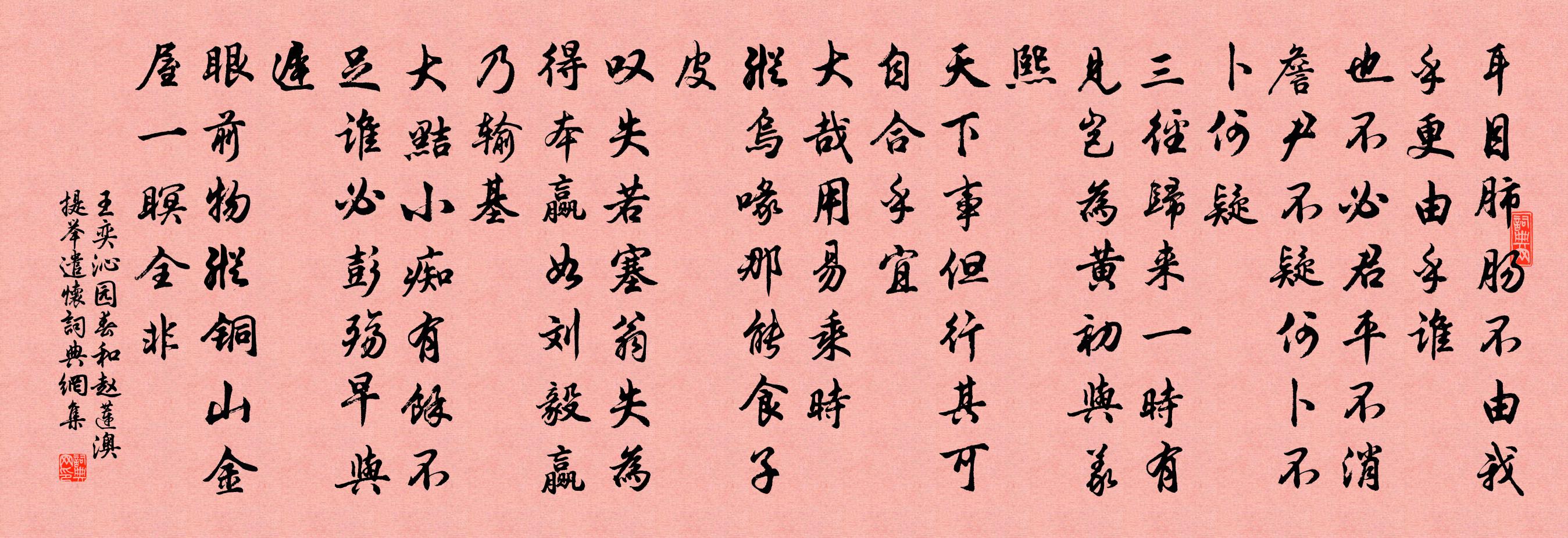 詩詞名句歷史字典書法欣賞書法字典國語詞典說文解字康熙字典古漢語字典標 題 作 者 詩 句 沁園春(和趙蓮澳提舉遣懷)作者:王奕 朝代:宋代原文耳目肺腸,不由我乎,更由乎誰。也不必君平,不消詹尹,不疑何卜,不卜何疑。三徑歸來,一時有見,豈為黃初與義熙。天下事,但行其可,自合乎宜。大哉用易乘時。縱烏喙那能食子皮。嘆失若塞翁,失為得本,贏如劉毅,贏乃輸基。大黠小痴,有餘不足,誰必彭殤早與遲。眼前物,縱銅山金屋,一瞑全非。詩詞問答問:《沁園春(和趙蓮澳提舉遣懷)》的作者是誰?答:王奕問:該詩寫於哪個朝代?答:宋代問:該詩是什麼體裁?答:詞書法欣賞沁園春(和趙蓮澳提舉遣懷)書法作品詩詞推薦韓簿之常山送行一首蘇籀〔宋代〕蒼隼卑飛亦將擊,素琴不擬貴高張。勾稽俛首親朱墨,甘旨役心謀稻粱。吏乾能稱追伯仲,朝端近例寘周行。題名題文發叔所藏潘子真水墨江湖八境小軸洞庭波楊萬里〔宋代〕湖水吞天去,湖風送浪還。銀山何處是,青底是君山。再賦梅花陸游〔宋代〕老來愛酒剩狂顛,況復梅花到眼邊。不怕幽香妨靜觀,正須疏影伴臞仙。松筠共嘆冰霜晚,桃李從教雨露偏。此去代贈蘇泂〔宋代〕隔溪楊柳絲絲綠,比妾心情少日時。待得楊花逐流水,此時妾意有誰知。絕句關澥〔宋代〕野艇歸時蒲葉雨,繰車鳴處楝花風。江南舊日經行地,盡在於今醉夢中。良月二十一日郡庠置酒爐亭勞余出山且取子美陳著〔宋代〕蘭菊不競芳,鴻燕各有時。可以人不如,大哉義曰隨。吹笛兒李中〔唐代〕隴頭休聽月明中,妙竹嘉音際會逢。見爾樽前吹一曲,令人重憶許雲封。風玉錢時〔宋代〕句裹論工非得句,弦間覓趣未忘弦。忽聽檐外敲風玉,三代遺音妙不傳。史院席上作吳充〔宋代〕蘭台開史局,玉斝賜君餘。賓友求三事,規摹本八書。汗青裁仿此,衰白盍歸歟。詔許從容會,何妨醉上車。題梁王舊園徐鉉〔唐代〕梁王舊館枕潮溝,共引垂藤系小舟。樹倚荒颱風淅淅,草埋攲石雨修修。門前不見鄒枚醉,池上時聞雁鶩愁。節士自嘲絕句馮涓〔唐代〕取水郎中何日了,破柴員外幾時休。早知蜀地區娵與,悔不長安大比丘。掃花游(李仁山別墅)趙文〔宋代〕結廬勝境,似舊日曾游,玉連佳處。萬花織組。愛迴廊宛轉,楚腰束素。度密穿青,上有燕支萬樹。探梅去。正竹送趙寬堂二首杜范〔宋代〕馬塍眩朱白,孤白自疎影。冰雪幾歲寒,誰解為渠領。李園百樹花,人與凡木屏。濕蘚回春風,猿鶴並刷整。為我題載雪錄蕭介父〔宋代〕亂雲連野水連空,只有沙鷗共數公。想得句成天亦喜,雪花迎櫂入吳中。高宗郊前朝獻景靈宮二十一首真宗〔宋代〕涓選休辰,有事嘉薦。琅琅瓊佩,陟降嚴殿。其陟伊何,幣玉斯奠。周旋中禮,千億儲義。初夏登北山衛宗武〔宋代〕春山如佳人,形色麗而秀。茲來悵非時,已入朱明候。片紅飛不留,萬綠新改舊。接茵芳草蔓,偃蓋古木茂。黛鬟禪人寫師真請贊釋慧遠〔宋代〕師子哮吼,象五迴旋。左顧右盼,七穴八穿。平地和聲便拶,等閒{左孛右攵}跳上天。築著梵王香案,然後退身淨髮釋慧開〔宋代〕鋒芒未露鬼神號,能劃群牛頂{左寧右頁}毛。四海聱頭俱按下,豈容存著一織毫。雲陽寺石竹花司空曙〔唐代〕一自幽山別,相逢此寺中。高低俱出葉,深淺不分叢。野蝶難爭白,庭榴暗讓紅。誰憐芳最久,春露到秋風。奉和聖制同二相以下群官樂遊園宴胡皓〔唐代〕五酺終宴集,三錫又歡娛。仙阜崇高異,神州眺覽殊。南山臨皓雪,北闕對明珠。廣座鵷鴻滿,昌庭駟馬趨。綺羅名句推薦婿為燕國王,身被詔獄加。李白《秦女休行》 玉露凋傷楓樹林,巫山巫峽氣蕭森杜甫《秋興八首·其一》 曉月墜,宿雲微,無語枕頻欹。李煜《喜遷鶯·曉月墜》 燕歌未斷塞鴻飛,牧馬群嘶邊草綠。李益《塞下曲·其一》 好水好山看不足,馬蹄催趁月明歸。岳飛《池州翠微亭》 秋風蕭瑟天氣涼,草木搖落露為霜,群燕辭歸鵠南翔。曹丕《燕歌行二首·其一》 上有好者,下必有甚焉者矣。孟子《孟子·滕文公章句上·第二節》 入苑白泱泱,宮人正靨黃。李賀《同沈駙馬賦得御溝水》 積土成山,風雨興焉;荀子《勸學》 桑柘廢來猶納稅,田園荒後尚征苗。杜荀鶴《山中寡婦 / 時世行》