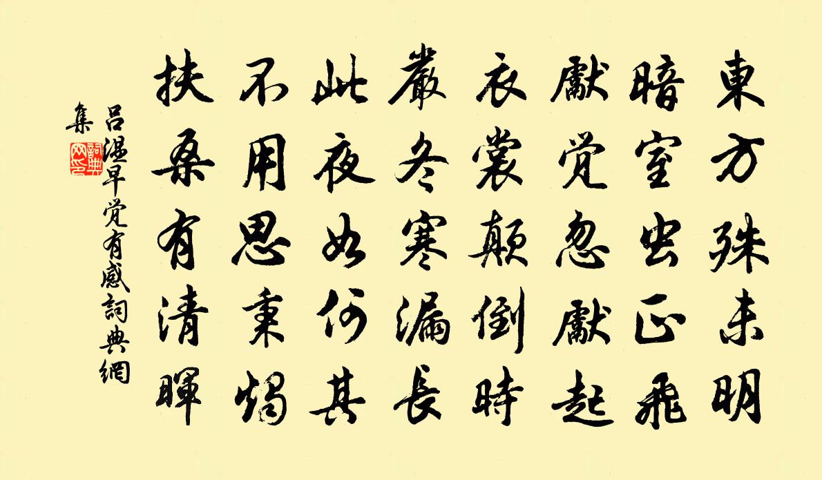 詩詞名句歷史字典書法欣賞書法字典國語詞典說文解字康熙字典古漢語字典標 題 作 者 詩 句 早覺有感作者:呂溫 朝代:唐代早覺有感原文東方殊未明,暗室蟲正飛。先覺忽先起,衣裳顛倒時。嚴冬寒漏長,此夜如何其。不用思秉燭,扶桑有清暉。詩詞問答問:早覺有感的作者是誰?答:呂溫問:早覺有感寫於哪個朝代?答:唐代問:早覺有感是什麼體裁?答:五律呂溫早覺有感書法欣賞早覺有感書法作品注釋全唐詩:卷371-46詩詞推薦晝寢陸游〔宋代〕困睫芒羊一欠伸,頹然忽已墮紗巾。鼻端雷動君無怪,路熟華胥不問津。題烏程簿廳浮玉亭七首袁說友〔宋代〕浮屠高直一溪雲,水面渾如鏡面分。此景正緣高士得,不然何以獨輸君。朝中措陳三聘〔宋代〕秋山橫截半湖光。湖渚橘枝黃。紈扇罷搖蟾影,練衣已怯風涼。插紅裂蟹,銀絲鱠鯽,莫負傳觴。醉里乾坤廣大,禁中庭樹楊億〔宋代〕直幹依金闥,繁陰覆綺楹。纍珠晨露重,嘒管夜蟬清。霜桂丹丘路,星榆北斗城。歲寒徒自許,蜀柳笑孤貞。江城子(宴守倅)王質〔宋代〕柳梢無雪受風吹。綠垂垂。乳鴉啼。直下蒲萄,春水未平堤。卻似今年春氣早,白團扇,已相宜。紅巾當日鳥銜飛留山間種藝十絕劉克莊〔宋代〕春風滿面喜津津,縱有嗔拳不忍嗔。尚恐傍觀安註腳,笑他何事與何人。禱雨木欄堂四首陳造〔宋代〕物享用達幽秘,政戾自奸陰陽。我已泣刑白鶂,誰繼請烹洪羊。題壁二首胡叔陽子〔宋代〕奉崇香火若君難,莫把經文作戲言。兒女損休都管盡,明春速入武當山。廉村薛庭芝訴貧於余余亦貧不能周之贈以是詩薛嵎〔宋代〕兩窮相值愁無計,同是開元補闕孫。百世清風於此在,莫將貧悴對人言。乘月棹舟送大曆寺靈聰上人不及許渾〔唐代〕萬峰秋盡百泉清,舊鎖禪扉在赤城。楓浦客來煙未散,竹窗僧去月猶明。杯浮野渡魚龍遠,錫響空山虎豹驚。一字登延慶佛閣用出郊韻三首吳潛〔宋代〕遠峰近嶂似環連,擁翠排青到面前。可聖可賢桑落酒,不寒不暖菊花天。吐吞湖海酎金兕,批判煙雲揮玉蟬。此客籠鵠山房李壁〔宋代〕蕭條白石閉嚴扃,留作遊人萬古情。猶有山中舊麋鹿,舉頭如聽讀書聲。又和雪霽司馬光〔宋代〕南宮來幾時,挾纊易春衣。意謂花將晚,何言雪尚飛。夜聲通旅枕,曉色弄晴暉。繼日勞王事,離鴻已北歸。送盧緘歸揚州趙嘏〔唐代〕曾向雷塘寄掩扉,荀家燈火有餘輝。關河日暮望空極,楊柳渡頭人獨歸。隋苑荒颱風裊裊,灞陵殘雨夢依依。今年讀通鑑雜興孫應時〔宋代〕莫怪新亭泣楚囚,王公原不辨中州。石頭門外千年恨,他日相思一涕流。句釋子耶〔宋代〕松欺胝雪千年古,竹掃溪風六月寒。送元侍御還荊南幕府李嘉祐〔唐代〕迢遞荊州路,山多水又分。霜林澹寒日,朔雁蔽南雲。八座由持節,三湘亦置軍。自當行直指,應不為功勳。越昌謠項安世〔宋代〕夜系扁舟鸚鵡邊,洲邊人語更堪憐。煙煨影里招魂魄,瓦礫堆中立市廛。明符到時惟赤地,吾儕今日見青天。子孫送筇杖與劉湛然道士王禹偁〔宋代〕有客遺竹杖,九節共一枝。鶴脰老更長,龍骨乾且奇。我問何所來,來從西南夷。因思漢武帝,求此民力疲。明明觀物四首蛩岳珂〔宋代〕春蠶繰繭白如霜,機婦停機待天涼。井蛩一夜秋已至,寸絲千結縈柔腸。催租吏囂翁媼怒,裘葛未成心轉苦。篝燈名句推薦讀書須用意,一字值千金。佚名《增廣賢文·上集》 至若窮陰凝閉,凜冽海隅,積雪沒脛,堅冰在須。李華《弔古戰場文》 而今才道當時錯,心緒淒迷。納蘭性德《採桑子·當時錯》 江暗雨欲來,浪白風初起。何遜《相送》 孤舟向廣武,一鳥歸成皋。岑參《鞏北秋興寄崔明允》 天之生此民也,使先知覺後知,使先覺覺後覺也。孟子《孟子·萬章章句上·第七節》 汀洲無浪復無煙,楚客相思益渺然。劉長卿《自夏口至鸚鵡洲夕望岳陽寄源中丞》 臥聞兒女夸翁健,詩句年光一樣新劉克莊《戊午元日二首》 昔有佳人公孫氏,一舞劍器動四方。杜甫《觀公孫大娘弟子舞劍器行》 志於道,據於德,依於仁,游於藝。孔子弟子《論語·述而篇》