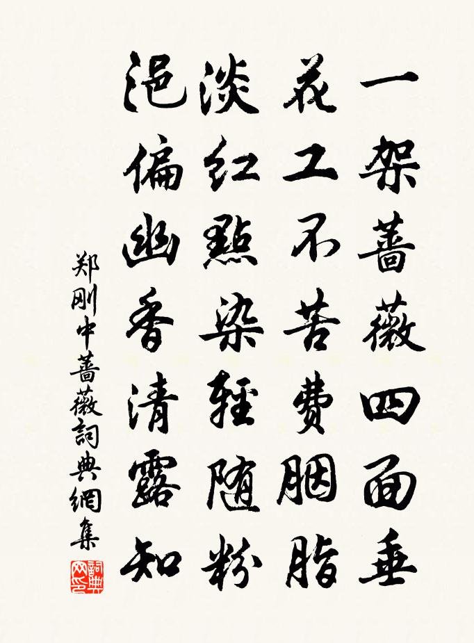 詩詞名句歷史字典書法欣賞書法字典國語詞典說文解字康熙字典古漢語字典標 題 作 者 詩 句 薔薇作者:鄭剛中 朝代:宋代薔薇原文一架薔薇四面垂,花工不苦費胭脂。淡紅點染輕隨粉,浥偏幽香清露知。詩詞問答問:薔薇的作者是誰?答:鄭剛中問:薔薇寫於哪個朝代?答:宋代鄭剛中薔薇書法欣賞薔薇書法作品詩詞推薦對芳樽廣韋蘇州詩作姜特立〔宋代〕對芳樽,老來萬事不足論。朱唇皓腕年少伴,青山白雲居古鄰。對芳樽,老來萬事不足論。水亭裴夷直〔唐代〕歲律行將變,君恩竟未回。門前即潮水,朝去暮常來。奉寄李十五秘書二首杜甫〔唐代〕避暑雲安縣,秋風早下來。暫留魚復浦,同過楚王台。猿鳥千崖窄,江湖萬里開。竹枝歌未好,畫舸莫遲回。行李冬日讀白集愛其貧堅志士節病長高人情之句作陸游〔宋代〕漢禍始外戚,唐亂基宦寺。小人計已私,頗復指他事。公卿恬駭機,關河入危涕。草茅豈無人,死抱經世志?西江月尹志平〔元代〕山後重興道院,燕南仍自干戈。道人功行累來多。免卻非災橫禍。每日誦經報國,終朝念道降魔。福生禍滅養沖和和蔡仲謀苦熱梅堯臣〔宋代〕大熱曝萬物,萬物不可逃。燥者欲出火,液者欲流膏。飛鳥厭其羽,走獸厭其毛。人亦畏絺綌,況乃服冠袍。廣廈邵公母牟融〔唐代〕搔首驚聞楚些歌,拂衣歸去淚懸河。劬勞常想三春恨,思養其如寸草何。浙水夢懷千里遠,蘇台愁望白雲多。傷心奉和御製扇徐鉉〔唐代〕齊紈新裂月輪全,蟬雀分明彩翠鮮。救暍自符仁主意,揚風須假手中扇。暫遮樓日霞光透,半掩歌唇寶靨圓。一曲寄題陳良臣頤軒四首劉子翬〔宋代〕七事疑生何晏,三爻夢感虞翻。獨養靈龜不昧,有人高臥頤軒。重過紅泉林亦之〔宋代〕憶昔嘈嘈來拜經,秋燈秋雨苦吟聲。如今秋雨秋燈夜,大半當年猶未生。悼老瓊二首韓元吉〔宋代〕歌舞相從六換年,秦箏已斷下能弦。荷花滿眼垂楊綠,腸斷清宵月正圓。閒甚戲作陸游〔宋代〕酒盡枵樽腹,書拋委架麈。漸能閒過日,始覺老催人。玉麈王夷甫,金龜賀季真。若論方外事,終媿葛天民。奉和族祖紫嚴翁謾興十首汪炎昶〔宋代〕地稈山故崇,河黃濟故清。彼豈超然中,但婢吾無能。我家壁中書,不知相牛經。寄定海許少府釋智圓〔宋代〕見說梅仙邑,波濤接杳冥。訟庭秋蘚合,吟閣海雲醒。愛月宵留客,尋僧畫掩扃。公餘幽興在,時夢故山青。答韓愈、李觀別,因獻張徐州孟郊〔唐代〕富別琴愁在顏,琴貧別愁銷骨。懶磨舊琴鏡,畏見新白髮。古樹春無琴,子規啼有血。離弦不堪聽,一聽四五絕。雩祀樂章。雍和褚亮〔唐代〕紺筵分彩,寶圖吐絢。鳳管晨凝,雲歌曉囀。肅事蘋藻,虔申桂奠。百穀斯登,萬箱攸薦。景德祀九宮貴神三首佚名〔宋代〕倬彼垂象,照臨下土。躔次運行,功德周普。九宮既位,惟德是輔。神之至上,皇皇斯覩。雜詠一百首善財劉克莊〔宋代〕放勛訪吾叔,魯叟問弘聃。所以此童子,諸方亦遍參。子年劉郎寫余老貌求贊楊萬里〔宋代〕鬢少梳欲無,髭短鑷更少。搔鬢祗捻髭,覓句何日了。初一作和夏且幽莊盧照鄰〔唐代〕伺有高蹤客,耿介坐幽莊。卞哩人事少,風煙鳥路長。瀑水含秋氣,垂藤引夏涼。苗深全覆隴,荷上半徑塘。釣諸名句推薦雲想衣裳花想容,春風拂檻露華濃李白《清平調·其一》 多君相門女,學道愛神仙李白《送內尋廬山女道士李騰空二首》 白日何短短,百年苦易滿。李白《短歌行》 邯鄲驛里逢冬至,抱膝燈前影伴身。白居易《邯鄲冬至夜思家》 光陰荏苒,日月如梭。施耐庵《水滸傳·第六十二回》 達士者,達乎死生之分,達乎死生之分。則利害存亡弗能惑矣。呂不韋《呂氏春秋·覽·恃君覽》 誠者,天之道也;思誠者,人之道也。至誠而不動者,未之有也;不誠,未有能動者也。孟子《孟子·離婁章句上·第十二節》 那堪旅館經殘臘,只把空書寄故鄉。王建《維揚冬末寄幕中二從事》 遠水不救近火。韓非及後人《韓非子·說林上》 牧人驅犢返,獵馬帶禽歸。王績《野望》