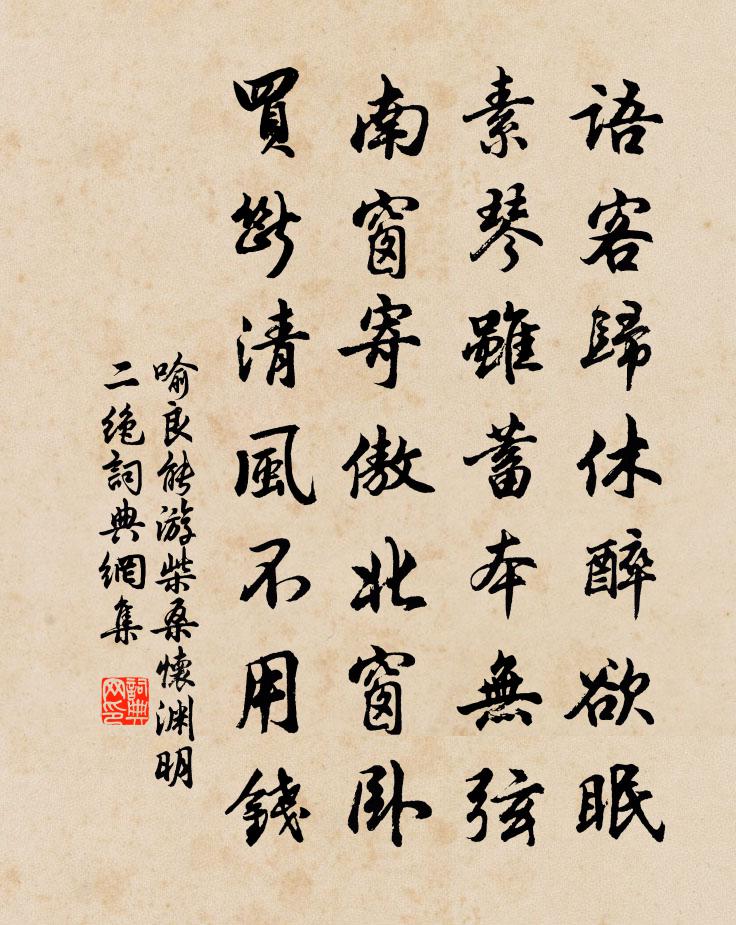 詩詞名句歷史字典書法欣賞書法字典國語詞典說文解字康熙字典古漢語字典標 題 作 者 詩 句 游柴桑懷淵明二絕作者:喻良能 朝代:宋代游柴桑懷淵明二絕原文語客歸休醉欲眠,素琴雖蓄本無弦。南窗寄傲北窗臥,買斷清風不用錢。詩詞問答問:游柴桑懷淵明二絕的作者是誰?答:喻良能問:游柴桑懷淵明二絕寫於哪個朝代?答:宋代喻良能游柴桑懷淵明二絕書法欣賞游柴桑懷淵明二絕書法作品詩詞推薦次韻毛君燒松花六絕蘇轍〔宋代〕美人寒甚懶開扉,金作松花插羃{上四下離}。幾度低頭疑墮落,青煙已斷未消時。次韻曾侍郎張鎡〔宋代〕世上曾誰歌白雪,慨嘆風人聲屢咽。旋蟲時叩豈無聞,盡發宮商方應節。江西源正非旁流,文清詩名不易收。師承和呂吏部觀延慶院李唐畫山水李復〔宋代〕道人曾去禮清涼,幻 * 出翠壁光。聞說幻師能幻幻,煙雲草樹攝他方。燕歸梁(為人生日作)趙鼎〔宋代〕綽約彤霞降紫霄。是仙子風標。湘裙明佩響瓊瑤。散馥郁、暗香飄。小春十月寒猶淺,妝粉弄梅梢。秦樓風月待吹絕句黃文雷〔宋代〕莫怪人言濟叔痴,東行西去又思歸。兒童舊讀從溫故,一笑今朝到式微。春女行王翰〔唐代〕紫台穹跨連綠波,紅軒鉿匝垂纖羅。中有一人金作面,隔幌玲瓏遙可見。忽聞黃鳥鳴且悲,鏡邊含笑著春衣。羅袖括賀新涼林正大〔宋代〕生長湖山曲。羨吳兒、呼吸湖光,飽餐山淥。世外不須論隱逸,誰似先生冰玉。自骨冷、神清無俗。我不識君曾夢風雨中望峽口諸山奇甚戲作短歌陸游〔宋代〕白鹽赤甲鹽天下雄,鹽拔地突兀鹽摩蒼穹,鹽凜然猛士撫長劍,空有豪健無雍容,不令氣象少渟滀,常恨天地無全送春趙湘〔唐代〕留客強歌還強醉,送春多雨又多風。五更池館孤燈盡,三月江城一夜空。青鑒照髭疑有白,子規啼樹已無紅。相逢文德皇后輓歌朱子奢〔唐代〕神京背紫陌,縞駟結行輈。北去橫橋道,西分清渭流。寒光向壟沒,霜氣入松楸。今日泉台路,非是濯龍游。汴渠春望漕舟數十里宋庠〔宋代〕虎眼春波溢宕溝,萬艘銜尾餉史州。控淮引海無窮利,枉是滔滔本濁流。啼禽梅堯臣〔宋代〕盆繭未成絲,破褲勸可脫。安知增羞顏,赤脛衣短褐。句諶祜〔宋代〕六鰲傾側動乾坤,國母巡荒護帝孫。北極星辰臨草地,西風觀闕臥花門。夜雨陸游〔宋代〕寒雨連三夕,幽居只數椽。家貧輕過節,身老怯增年。日月悲歌里,關山淚眼邊。梅花自開落,嘆息為誰妍?和魯望白菊張賁〔唐代〕雪彩冰姿號女華,寄身多是地仙家。有時南國和霜立,幾處東籬伴月斜。謝客瓊枝空貯恨,袁郎金鈿不成夸。自知玉樹後庭花陳叔寶〔南北朝〕麗宇芳林對高閣,新裝艷質本傾城;映戶凝嬌乍不進,出帷含態笑相迎。妖姬臉似花含露,玉樹流光照後庭;花開旅次朔方劉皂〔唐代〕客舍并州數十霜,歸心日夜憶鹹陽。無端又渡桑乾水,卻望并州似故鄉。和靖州判官陳子從山水圖十韻星灣晚酌魏了翁〔宋代〕士非耕釣者,而從蓑笠翁。人生貴適志,莘渭亦時中。井上桐陸龜蒙〔唐代〕美人傷別離,汲井長待曉。愁因轆轤轉,驚起雙棲鳥。獨立傍銀床,碧桐風裊裊。偈頌五十一首釋大觀〔宋代〕空手把鉏頭,男命怕羅睺。步行騎水牛,石虎生肉彪。人從橋上過,橋流水不流。羲和鞭白日,少吳行清秋。名句推薦自古聖賢盛德大業,未有不由學而成者也。黃宗羲《明儒學案·甘泉學案·侍郎許敬菴先生孚遠》 寄相思,寒雨燈窗,芙蓉舊院。吳文英《宴清都·秋感》 雙燕飛來,陌上相逢否?撩亂春愁如柳絮。馮延巳《鵲踏枝·幾日行云何處去》 休說鱸魚堪膾,盡西風,季鷹歸未?辛棄疾《水龍吟·登建康賞心亭》 一日不作,百日不食。司馬遷《史記·三十世家·趙世家》 吳洲如見月,千里幸相思。李白《送張舍人之江東》 山高必有怪,嶺峻卻生精。吳承恩《西遊記·第二十七回》 野竹分青靄,飛泉掛碧峰。李白《訪戴天山道士不遇》 雨雪雰雰,益之以霢霂。佚名《信南山》 倚杖柴門外,臨風聽暮蟬。王維《輞川閒居贈裴秀才迪》