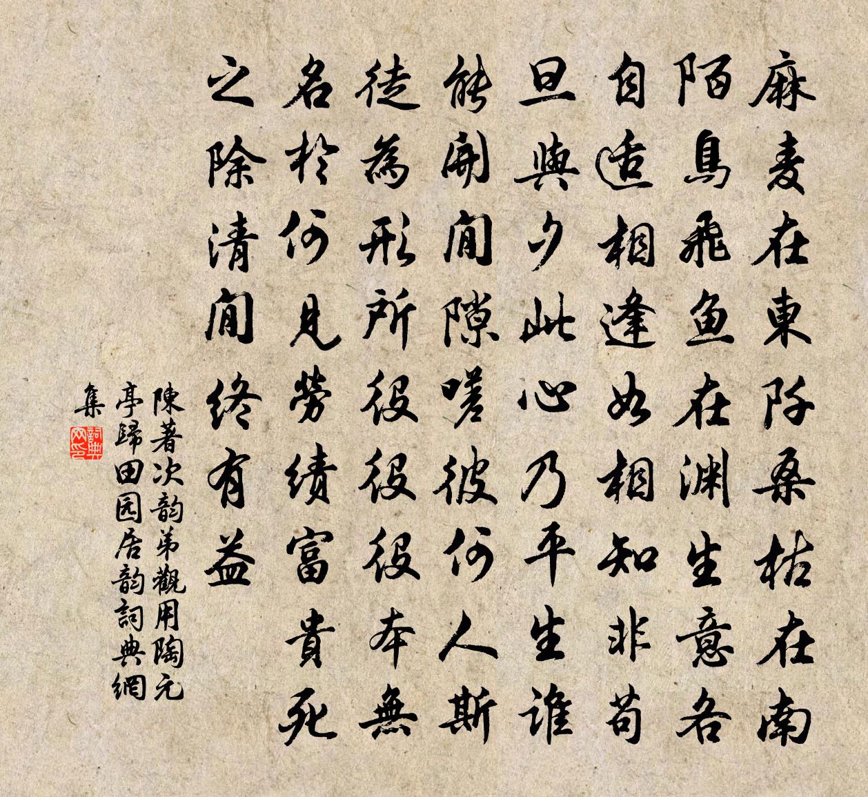 詩詞名句歷史字典書法欣賞書法字典國語詞典說文解字康熙字典古漢語字典標 題 作 者 詩 句 次韻弟觀用陶元亭歸田園居韻作者:陳著 朝代:宋代原文麻麥在東阡,桑枯在南陌。鳥飛魚在淵,生意各自適。相逢如相知,非苟旦與夕。此心乃平生,誰能開閒隙。嗟彼何人斯,徒為形所役。役役本無名,於何見勞績。富貴死之除,清閒終有益。詩詞問答問:《次韻弟觀用陶元亭歸田園居韻》的作者是誰?答:陳著問:該詩寫於哪個朝代?答:宋代書法欣賞次韻弟觀用陶元亭歸田園居韻書法作品詩詞推薦大聖樂陸游〔宋代〕電轉雷驚,自嘆浮生,四十二年。試思量往事,虛無似夢,悲歡萬狀,合散如煙。苦海無邊,愛河無底,流浪看成和張器先十絕楊萬里〔宋代〕散盡千金買盡書,短檠兩夜趁三餘。相如自倚多文富,不問家無澹石儲。郊祀慶成三首任希夷〔宋代〕廣樂鏘鳴列炬燃,禮成猶想吉初蠲。鴛班夜賀天顏喜,寶仗朝回物采鮮。萬姓竦瞻雙鳳闕,一封飛下九重天。乾坤真宗奉聖祖玉清昭應宮十一首真宗〔宋代〕明明文考,儲精上蒼。禮樂明作,溥率實王。功德累治,歷數會昌。孝思罔極,丕祐無疆。鄉人禱雨有應時寓烏石鄧深〔宋代〕力穡乃有秋,斯言聞自古。天時或不順,人事亦安取。今年問何如,常暘頗為苦。大田紛拆裂,槁苗渴灌注。井瓮蝶戀花 壽陳北山程文海〔元代〕月掛新年弓未彀。璧水溶溶,已覺春光透。國子先生松竹友。一尊請為斯文壽。況是雪中萱樹茂。華萼相輝,天地秋懷羅公升〔宋代〕舊日方山子,淒涼寄一簞。蟲聲來倦枕,秋思入憑欄。已是肱三折,那堪指一彈。中宵更風雨,誰念客氈寒。小園即事陳深〔宋代〕淡黃楊柳著煙輕,細草茸茸親屐行。行到水邊心會處,夕陽一樹否花明。梅花六首趙蕃〔宋代〕畫論形似已為非,牝牡那窮神駿姿。莫向眼前尋尺度,要從物外極觀窺。山因雨霧青增黛,水為風紋綠起漪。以是失題(此盧綸詩,題作赴虢州留別故人)李益〔唐代〕世故相逢各未閒,百年多在別離間。昨夜秋風今夜雨,不知何處入空山。熙寧蜡祭十三首佚名〔宋代〕秩秩禮文,為壇四方。嘉粟旨酒,百神迪賞。敷興萬物,既阜既昌。伊樂厥昌,傅工無疆。十月晦日睡起王諶〔宋代〕睡起西窗午正蹉,小春天氣尚融和。顛狂絕笑檐前蝶,不道殘陽已不多。化成岩二首趙汝鐩〔宋代〕一線沿崖路,衰殘步屟遲。攀蘿沖霧上,倚檻俯空危。石佛像須久,山僧言不知。看來眾亭子,最是妙高奇。安仁道中陸游〔宋代〕千古臨邛路,飄然偶獨游。病身那迫老,遠客更禁秋。水退橋未葺,渡閒船自流。飛騰付年少,回首思悠悠。論語絕句一百首張九成〔宋代〕參聞吾道無心語,只在當時一唯間。多學反嗟疑子貢,望雲猶隔數重關。近吟衛宗武〔宋代〕歷歷疏林點暮鴉,幽幽雨砌菊猶花。浮雲卷盡四山碧,倚遍喬松待月華。同李魯二郎中游三茅觀王炎〔宋代〕路入疏梅密竹間,俯看水墨畫湖山。玉妃妒我清游好,剪水飛花作苦寒。題汪水雲詩卷十首胡斗南〔宋代〕越舞吳謳別幾春,御船坊下即迷律。年來依舊多游賞,半是南人半北人。大滌洞留題趙汝諿〔宋代〕坡老吟來今幾齡,翠蛟飛舞若天成。欄乾小倚揮觴處,最愛泉聲亂雨聲。家近雲山九鎖深,誅茅已負十年心。筍輿分繡閣夜作二首高似孫〔宋代〕識字始多憂,悟理良自苦。少小習句讀,豈解工訓詁。一從入老大,甚覺悔雕組。人生各用命,何乃太知古。典謨名句推薦燕子不知人去也,飛認闌乾。韓疁《浪淘沙·莫上玉樓看》 紅顏未老恩先斷,斜倚薰籠坐到明。白居易《後宮詞》 甘受人欺,定非懦弱;自謂予智,終是糊塗。王永彬《圍爐夜話·第一二五則》 嫦娥應悔偷靈藥,碧海青天夜夜心。李商隱《嫦娥》 竹竿有甘苦,我愛抱苦節。孟郊《苦寒吟》 同穴窅冥何所望,他生緣會更難期。元稹《遣悲懷三首·其三》 獨自上層樓,樓外青山遠。程垓《卜運算元·獨自上層樓》 一向年光有限身,等閒離別易銷魂,酒筵歌席莫辭頻。晏殊《浣溪沙·一向年光有限身》 將壇醇酒冰漿細,元夜邀賓燈火新。趙時春《元宵飲陶總戎家二首》 不聞不若聞之,聞之不若見之,見之不若知之,知之不若行之。荀子《荀子·儒效》