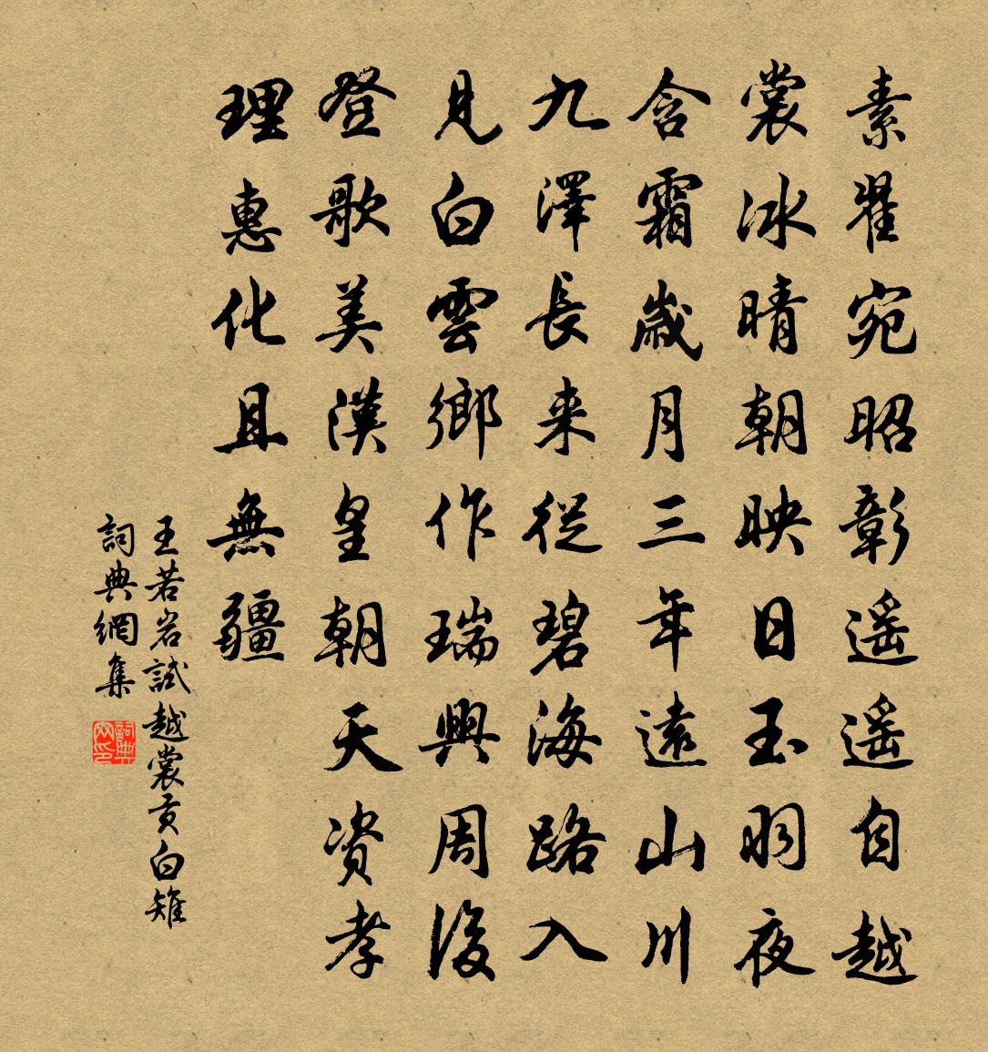 詩詞名句歷史字典書法欣賞書法字典國語詞典說文解字康熙字典古漢語字典標 題 作 者 詩 句 試越裳貢白雉作者:王若岩 朝代:唐代試越裳貢白雉原文素翟宛昭彰,遙遙自越裳。冰晴朝映日,玉羽夜含霜。歲月三年遠,山川九澤長。來從碧海路,入見白雲鄉。作瑞興周后,登歌美漢皇。朝天資孝理,惠化且無疆。詩詞問答問:試越裳貢白雉的作者是誰?答:王若岩問:試越裳貢白雉寫於哪個朝代?答:唐代問:試越裳貢白雉是什麼體裁?答:五排王若岩試越裳貢白雉書法欣賞試越裳貢白雉書法作品注釋全唐詩:卷782-15詩詞推薦劉宗元索余賦愚谷古人以愚自命及命人者多矣彭龜年〔宋代〕以愚名谷意何如,肯以愚溪認作吾。天地中間有真我,蕭然陋巷不關渠。雙石白居易〔唐代〕蒼然兩片石,厥狀怪且醜。俗用無所堪,時人嫌不取。結從胚渾始,得自洞庭口。萬古遺水濱,一朝入吾手。擔舁歲除夜過白土市不宿夜幾失道田家地臥四十韻方回〔宋代〕臘月廿九日,丁亥之歲除。朝發句容縣,寒空晴色初。初晴信可喜,泥深猶尺余。午憩白土市,暮指丹陽湖。未至春日登望海亭張伯玉〔宋代〕望海亭前春色深,風光澹澹海沈沈。潮如世路來還去,山帶城蕪古到今。坐見微雲生別岸,吟驚幽鳥起層陰。勸君九日趙蕃〔宋代〕澗落峰寒似住時,重陽面目許誰知。搖搖楓葉未全赤,草草菊花成後期。酒量稍增愁渴肺,詩材頓減費衰髭。一年河傳(仙呂調)張先〔宋代〕花暮。春去。都門東路。嘶馬將行。江南江北,十里五里郵亭。幾程程。高城望遠看回睇。煙細。晚碧空無際。今訪紫芝回與子舒集葛天民〔宋代〕君參唐句法,親得浪仙衣。薄宦因吟苦,高風與世違。春寒留夜飲,月黑借燈歸。共隱知何日,空山老蕨薇。海康書事十首秦觀〔宋代〕海康臘己酉,不論冬孟仲。殺牛檛祭鼓,城郭為沸動。雖非堯歷頒,自我先人用。大笑荊楚人,嘉平獵雲夢。衢學講堂更名時心和貳車韻車韻五首袁甫〔宋代〕道心無壞變無成,只怕微雲點太清。重坎之亨人不識,一輪素月本來明。春去王鎡〔宋代〕一簾翠雨柳生煙,金屋無人理管弦。春去啼鶯留不住,隨花飛過別鞦韆。古意十四首章雲心〔宋代〕百川畢東注,兩丸盡西頹。二物常汲汲,未嘗少徘徊。短生亦如斯,逝者良可哀。自昔青雲士,皆為黃土堆。何如春日雜題陸游〔宋代〕客路行無窮,漁唱聽不厭。濤江西限吳,雲岫南入剡。蹇驢過小市,高柳擁孤店。去去望前村,鴉歸煙欲歛。舟中晚望二首楊萬里〔宋代〕晚浪翻風玉作鱗,夕陽卷玉藥成金。忽然濯出西川錦,制就霞衣不用針。偈頌六十首釋曇華〔宋代〕金佛不度爐,木佛不度火。泥佛不度水,真佛屋裹坐。萬牛挽不回,千個與萬個。好事積如山,祗緣輕放過。不放葉大猷輓詩虞儔〔宋代〕月旦評猶在,題輿事已非。田園寧作計,鷗鷺本忘機。此地期相款,終天願忽違。西風送丹旐,老淚不禁揮。送曾大卿將漕江東喻良能〔宋代〕公去何嘗負二宜,要持玉節瑞明時。江畿列郡皆爭睹,台閣名流總賦詩。鵰鶚暫為雲外舉,鳳凰終集上林枝。近臣臨江仙張伯壽〔宋代〕吳越家聲傳鐵券,當年功指山河。公侯袞袞後來多。休符鍾俊傑,氣宇稟沖和。磊落胸襟清廟器,鵬程背可天摩。建除體二首答黃魯直教授晁補之〔宋代〕建鼓求亡子,初昧學所之。除去日月多,及此歲未遲。滿國和巴人,若士誰與知。平陸不推舟,客行當來茲。定居送費六還蜀駱賓王〔唐代〕星樓望蜀道,月峽指吳門。萬行流別淚,九折切驚魂。雪影含花落,雲陰帶葉昏。還愁三徑晚,獨對一清尊。偈傾一百三十三首釋法薰〔宋代〕禪非意想,道絕功勳。 * ,有迷路人。名句推薦雲深山塢,煙冷江皋,人生未易相逢。吳文英《聲聲慢·友人以梅蘭瑞香水仙供客曰四香分韻得風字》 善有善報,惡有惡報。佚名《增廣賢文·上集》 繁采寡情,味之必厭。劉勰《文心雕龍·情采》 雞肋,棄之如可惜,食之無所得陳壽《三國志·魏書·武帝紀》 功過不宜少混,混則人懷惰隳之心洪應明《菜根譚·概論》 擇子莫擇父,擇親莫擇鄰。佚名《增廣賢文·下集》 酌酒會臨泉水,抱琴好倚長松。王維《田園樂七首·其七》 雁聚河流濁,羊群磧草膻。齊己《送人游塞》 擬泛煙中片葉,但兩湖佳處,任風吹泊徐燦《念奴嬌·西湖雨感次素庵韻》 驪山四顧,阿房一炬,當時奢侈今何處?張養浩《山坡羊·驪山懷古》