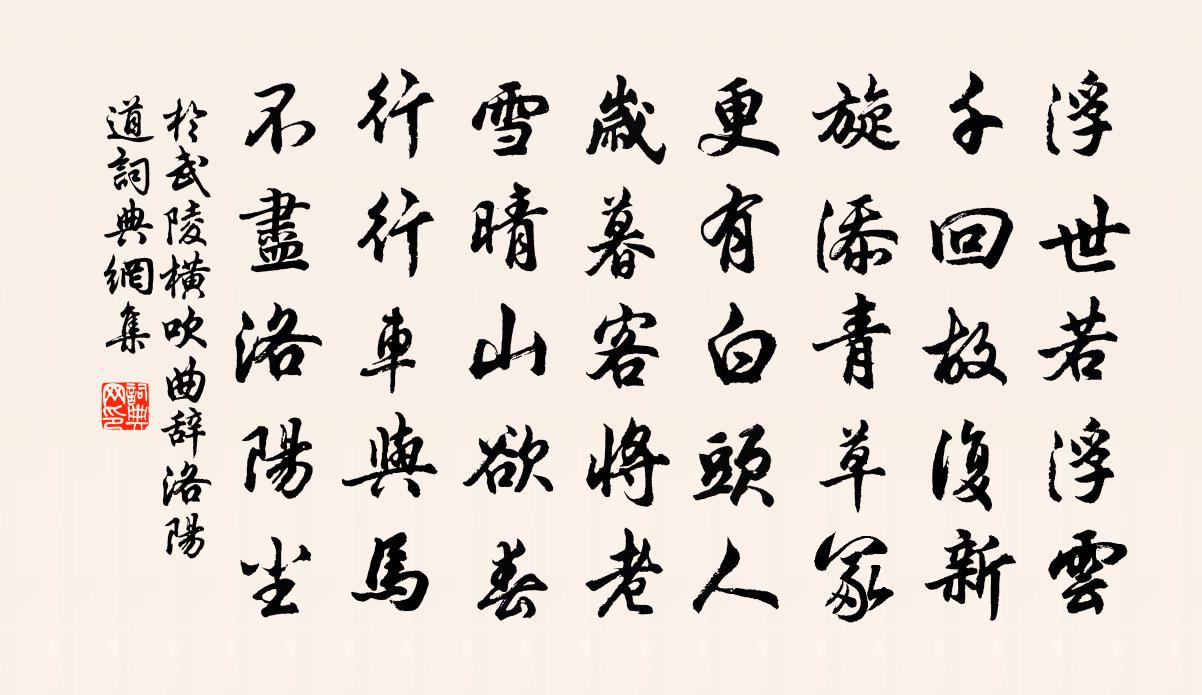 詩詞名句歷史字典書法欣賞書法字典國語詞典說文解字康熙字典古漢語字典標 題 作 者 詩 句 橫吹曲辭。洛陽道作者:於武陵 朝代:唐代橫吹曲辭。洛陽道原文浮世若浮雲,千回故復新。旋添青草冢,更有白頭人。歲暮客將老,雪晴山欲春。行行車與馬,不盡洛陽塵。詩詞問答問:橫吹曲辭。洛陽道的作者是誰?答:於武陵問:橫吹曲辭。洛陽道寫於哪個朝代?答:唐代問:橫吹曲辭。洛陽道是什麼體裁?答:樂府於武陵橫吹曲辭。洛陽道書法欣賞橫吹曲辭。洛陽道書法作品注釋全唐詩:卷18_63詩詞推薦載芟佚名〔先秦〕載芟載柞,其耕澤澤。千耦其耘,徂隰徂畛。侯主侯伯,侯亞侯旅,侯彊侯以。有嗿其饁,思媚其婦,有依其士。中書令程文簡輓辭三首蘇頌〔宋代〕星墜寢門夕,歌興夢奠時。騎箕良弼去,罷社國人悲。富貴驚川逝,功名白日垂。只應金石刻,無愧伯喈辭。緣識宋太宗〔宋代〕少年多語笑,終日遂心娛。不會凡情識,如痴我亦愚。鷓鴣天(劉運判生日)王以寧〔宋代〕瑞雪當空舞素英。玳筵收得滿金瓶。洗教雙眼明如鏡,看取黃河幾度清。龜畀壽,鶴為形。年年長願見儀刑。他年送客東歸楊凝〔唐代〕君向古營州,邊風戰地愁。草青縵別路,柳亞拂孤樓。人意傷難醉,鶯啼咽不流。芳菲只合樂,離思返如秋。玉井亭觀蓮姚勉〔宋代〕幾隊紅妝擁蓋青,凌波仙子立娉婷。晚涼孤坐香風裡,如在西湖四望亭。蝶戀花 丁亥正月十三日親朋治具,醉中賦此許有壬〔元代〕老子行年過耳順。蓬鬢蕭疏,人道猶風韻。領略風光元有分。賞心又喜燒燈近。薄雪初消寒欲盡。詞館多閒,時得和路樞四首胡寅〔宋代〕林壑蒼茫渺一涯,辱化詞藻借光華。大聲豈直金投地,清夢懸知筆有花。不似罷兵初度嶺,應同奏疏早名家。曳裾送僧歸吳司馬光〔宋代〕高枕聊成夢,晴空忽見花。浮生儘是客,何處得為家。旅食帝城久,歸舟澤國賒。角因菰菜味,回首浩無涯。同吉老飲清平戲作集句黃庭堅〔宋代〕飛蓋相追隨,攜手共行樂。我有一樽酒,聊厚不為薄。珍木郁蒼蒼,眾鳥欣有托。密竹使逕迷,初篁包綠籜。有渰疊後晁說之〔宋代〕病眼終朝更懶開,難輸心曲語悠哉。從教苔徑無人到,日日潮聲自上來。和董端明大野漁父圖李彌遜〔宋代〕撇棹歸來起暮涼,樂哉誰復慕軒裳。橫短笛,罷鳴榔。紅藕花繁作陣香。寒食清明十首劉克莊〔宋代〕原沉向九泉,推死已千年。有水皆爭渡,無村不禁菸。頌古二十一首釋鼎需〔宋代〕全鋒敵勝鐵牛機,電掣雷奔已是遲。等閒活捉盧陂老,縱饒猛略若為施。君不見,寰中意氣,閫外威權,擬議沖前和毛生瑞香胡寅〔宋代〕久雨妨園涉,奇芬待客吹。今朝搴翠幄,晴日麗繁枝。一一花相簇,翩翩蝶未知。薰篝蒙紫錦,香過每輕披。偶書王安石〔宋代〕雄也營身足,聃兮悞汝多。捐書知聖已,絕學奈禽何。六州歌頭王之道〔宋代〕燧瑊勳業,何敢望西平。觀當日,清大憝,震天聲。績其凝。追配汾陽郭,臨淮李,掃妖孽,植顛仆,復疆宇,洗梅蘭宋伯仁〔宋代〕清標同插古軍持,清似西山凍餒時。嚼蕊弄香無說處,屈平和靖已何之。墳庵枕上追愴賦此張栻〔宋代〕秋氣惻惻侵戶牖,霜林風過猶餘音。八年淚濕龍塘土,展轉不眠中夜心。醉桃源 祿存文曲王吉昌〔元代〕祿存文曲附神光。驅驅逐色忙。昧禪徒亂角和商。如何作道場。雙簾掩,瑣明堂。仙童奪正陽。神功機在性昭彰。名句推薦柳色參差掩畫樓,曉鶯啼送滿宮愁。司馬扎《宮怨 / 閨怨》 君若清路塵,妾若濁水泥;曹植《明月上高樓》 野客預知農事好,三冬瑞雪未全消。戴復古《除夜》 黃河水繞漢宮牆,河上秋風雁幾行。李夢陽《秋望》 枯枝無醜葉,涸水吐清泉李白《長歌行》 梳洗罷,獨倚望江樓。溫庭筠《望江南·梳洗罷》 江河之水,非一水之源也;千鎰之裘,非一狐之白也。墨子《墨子·01章 親士》 十有五而志於學,三十而立,四十而不惑,五十而知天命,六十而耳順,七十而從心所欲,不逾矩。孔子弟子《論語·為政篇》 尚憐終南山,回首清渭濱。杜甫《奉贈韋左丞丈二十二韻》 新妝宜面下朱樓,深鎖春光一院愁。劉禹錫《和樂天春詞 / 春詞》
