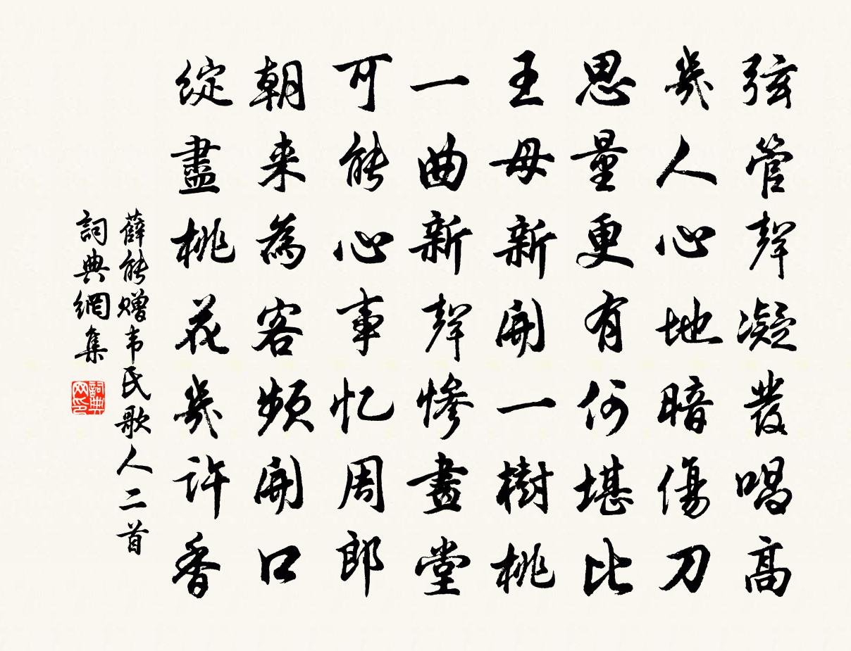 詩詞名句歷史字典書法欣賞書法字典國語詞典說文解字康熙字典古漢語字典標 題 作 者 詩 句 贈韋氏歌人二首作者:薛能 朝代:唐代贈韋氏歌人二首原文弦管聲凝發唱高,幾人心地暗傷刀。思量更有何堪比,王母新開一樹桃。一曲新聲慘畫堂,可能心事憶周郎。朝來為客頻開口,綻盡桃花幾許香。詩詞問答問:贈韋氏歌人二首的作者是誰?答:薛能問:贈韋氏歌人二首寫於哪個朝代?答:唐代問:贈韋氏歌人二首是什麼體裁?答:七絕薛能贈韋氏歌人二首書法欣賞贈韋氏歌人二首書法作品注釋全唐詩:卷561-55詩詞推薦芝產之五日有雙蓮生於東池亟往視之出水已二郭印〔宋代〕七層芝草煌煌秀,一本荷花兩兩芳。無象太平人不識,天教卉木效珍祥。龍翔宮趙崇嶓〔宋代〕地闢金光界,龍飛析木津。指麾開輦路,祠祀拜元辰。天近雲光暖,花濃雨脈春。君王自仁壽,閒殺華封人。題西樓有感王柏〔宋代〕往事傷心不可論,高情還許小通門。旋鋤荒草追風景,因種殘花劃雪痕。敗壁古苔權作主,破窗夜雨暗消魂。青山雜詩二首張耒〔宋代〕高堂斷四聽,鳴雨曉未止。堂空雨聲大,滴滴清我耳。朝眠引幽夢,遇我同心子。談笑未容周,夢開坐千里。高郵野望二首楊萬里〔宋代〕江南十里九青山,江北無山只野田。更遣野田無遠樹,郭熙盡巧若為傳。望書歸/搗練子賀鑄〔宋代〕邊堠遠,置郵稀。附與征衣襯鐵衣。連夜不妨頻夢見,過年惟望得書歸。迎倉使李監丞八絕曾豐〔宋代〕入境諏民察吏余,羅浮賞罷更豐湖。相迎魚鳥如相告,車騎今回又較都。靈岩一線天徐幾〔宋代〕盡日摩挲蘚石斑,幾人來此駐吟鞍。誰知一線通天處,照見人心凜凜寒。漁家傲毛滂〔宋代〕鬢底青春留不住。功名薄似風前絮。何似瓮頭春沒數。都占取。只消一紙長門賦。寒日半窗桑柘暮。倚闌目送繁雲山台葛紹體〔宋代〕春曉欄乾無數山,山雲濃淡去來間。湖光一片東城外,鷗鷺相親風日寒。早發宜陵即事羅鄴〔唐代〕霜白山村月落時,一聲雞後又登岐。居人猶自掩關在,行客已愁驅馬遲。身事不堪空感激,鬢毛看著欲凋衰。青萍閏月四日石湖眾芳爛漫范成大〔宋代〕北垞南岡總是家,兒童隨逐任驩嘩。開嘗臘尾蒸來酒,點數春頭接過花。盡把園林蒙錦繡,多添門戶鎖煙霞。杖藜淮陰行五首劉禹錫〔唐代〕簇簇淮陰市,竹樓緣岸上。好日起檣竿,烏飛驚五兩。今日轉船頭,金烏指西北。煙波與春草,千里同一色。船頭玉女詞張安石〔唐代〕綺薦銀屏空積塵,柳眉桃臉暗銷春。不須更學陽台女,為雨為雲趁惱人。資中八首范祖禹〔宋代〕夷界荒山幾萬重,西窮月窟與天通。何時漢使還持節,從此乘槎上碧空。前利路運判沖佑李君輓詩二首魏了翁〔宋代〕篤謹寧違俗,清淳不近名。幾多岐上泣,獨自吉中行。歲晚露沾草,山空霜滿荊。南溪後月夜,的的為誰明。宋江三十六贊龔開〔宋代〕地下閻羅,追魂攝魄。今其活矣,名喝太伯。山中玩物雜言十首戴表元〔宋代〕時露下百草,流螢此飛翻。初如灰燼微,忽作秋星繁。念彼生育處,回光照其根。君莫輕流螢,流螢尚知恩。八年正月天慶節上清宮行香錫慶院御筵日揚輝夏竦〔宋代〕實籙標嘉節,需雲錫惠筵。烈暉騰愛景,瑞彩擬非煙。焜燿璇霄外,輪囷絳闕前。居歆方屢告,偉兆溢祥編。霓裳羽衣歌(和微之)白居易〔唐代〕我昔元和侍憲皇,曾陪內宴宴昭陽。千歌百舞不可數,就中最愛霓裳舞。舞時寒食春風天,玉鉤欄下香案前。案前名句推薦積土成山,風雨興焉;荀子《勸學》 海棠未雨,梨花先雪,一半春休。王雱《眼兒媚·楊柳絲絲弄輕柔》 治民者,禁奸於未萌。韓非及後人《韓非子·心度》 勇,志之所以敢也。墨子《墨子·40章 經(上)》 三春白雪歸青冢,萬里黃河繞黑山。柳中庸《征人怨 / 征怨》 青天蜀道難,紅葉吳江冷。張可久《普天樂·秋懷》 未信此情難系絆,楊花猶有東風管。蘇軾《蝶戀花·蝶懶鶯慵春過半》 閒夢江南梅熟日,夜船吹笛雨蕭蕭。皇甫松《夢江南·蘭燼落》 客睡何曾著,秋天不肯明杜甫《客夜》 酒闌更喜團茶苦,夢斷偏宜瑞腦香。李清照《鷓鴣天·寒日蕭蕭上瑣窗》