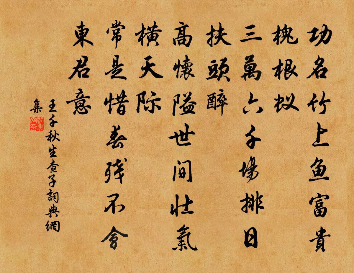 詩詞名句歷史字典書法欣賞書法字典國語詞典說文解字康熙字典古漢語字典標 題 作 者 詩 句 生查子作者:王千秋 朝代:宋代生查子原文功名竹上魚,富貴槐根蟻。三萬六千場,排日扶頭醉。高懷隘世間,壯氣橫天際。常是惜春殘,不會東君意。詩詞問答問:生查子的作者是誰?答:王千秋問:生查子寫於哪個朝代?答:宋代問:生查子是什麼體裁?答:詞王千秋生查子書法欣賞生查子書法作品詩詞推薦寄外舅郭大夫陳師道〔宋代〕丈人魯諸生,明刑如皋陶。幸寬右顧憂,未惜一身遙。西南萬里行,可以斷繩橋。慎勿用惠文,神母仁如堯。滿庭芳張元乾〔宋代〕三十年來,雲遊行化,草鞋踏破塵沙。遍參尊宿,曾記到京華。衲子如麻似粟,誰會笑、瞿老拈花。經離亂,青山雜曲歌辭。古離別常理〔唐代〕君御狐白裘,妾居緗綺幬。粟鈿金夾膝,花錯玉搔頭。離別生庭草,征行斷戍樓。蠨蛸網清曙,菡萏落紅秋。小膽陳菊圃參政寄詩千里外托興於秋燕春花以示玩馬廷鸞〔宋代〕冠峨獬豸服緋花,欲獻甘芹謂苦茶。誤盡靈烏報凶吉,終然爰止托誰家。贈英公大師穎贄〔宋代〕蠻牋免管少年時,幾賦簾前祝壽詩。三殿荷恩卿相看,兩朝承寵帝王知。尋窮太華高低景,念盡長安內外碑。可惜次韻賓暘張氏山園紅菊方回〔宋代〕惟菊可配松,受命天地正。吾家植千本,朝耘暮灌潤。未言制頹齡,且用樂野性。嚴霜百草死,後皇布肅令。始知偈頌五十一首釋大觀〔宋代〕不動本位,瑞應人間。冠群靈而首出,攝大千於毫端。萬彙熙熙兮春台之樂,萬邦納納兮磐石之安。九日復口洪咨夔〔宋代〕涼邊未放菊花斑,莫作重陽節物看。就網買魚風露重,推篷舉酒水天寬。箭頭歲月離弦易,局面功名下著難。慚愧次韻師厚病間十首黃庭堅〔宋代〕葅寒知園秋,飯白問米賤。婦孫勸甘旨,霜兔頗宜面。黃花不舉酒,佳句余嫪戀。經行宴坐堂,鼠跡書幾硯。贈僧李洞〔唐代〕不羨王公與貴人,唯將雲鶴自相親。閒來石上觀流水,欲洗禪衣未有塵。夜泊李陽驛高邁〔宋代〕風拂烏紗兩鬢秋,李陽溪上夜停舟。市燈閃月聞鳴犬,城柝敲高起睡鷗。千里遠馳承寵命,通宵不寐為民憂。幽懷偈頌七十六首釋師觀〔宋代〕年去年來年年事,日來日往日日新。木人撫掌呵呵笑,一段風光畫不成。見便見,莫沈吟。樓上已吹新歲角,堂前溪亭春日二首借屋三間俯近郊,溪流如練繞蘭程公許〔宋代〕極目青天蜀道難,無因長坂得聊驂。思鄉浪費腸回九,行世何妨臂拍三。楊柳風微生百媚,棠梨書永帶餘酣。天涯送東川成路鈐項安世〔宋代〕壯歲專城身欲老,兒時射策眼今昏。戰創滿面誰能管,舊事逢人且莫論。壁壘旌旗分一路,弟兄父子就名門。回瞻故相賈秋壑舊府黃庚〔宋代〕當年構華屋,權勢傾衛霍。堂宇窮斧斤,天氣煥丹雘。花石擬平泉,水陸致茲壑。惟聞丞相嗔,肯後天下樂。朱門燭影搖紅元好問〔金代〕紅葉翻階,晚風微扇回輕暖。群仙高跨紫雲車,來赴蓬萊宴。繡幕圍香處遠。*簾花、時時影轉。彩衣嬉戲,玉女勸農同幕皆預即事四絕陳杰〔宋代〕烏帽持觴鬢似銀,近前不怕相公嗔。未知此日殷勤意,曾到深村作苦人。渡淮武元衡〔唐代〕暮濤凝雪長淮水,細雨飛梅五月天。行子不須愁夜泊,綠楊多處有人煙。題周希稷清閟軒喻良能〔宋代〕之子蘊琅玕,幽軒足考槃。蘢蔥煙翠濕,瑣碎日光寒。似向蘭亭見,全勝墨三看。是中雖信美,未可懶彈冠。經故宅有感周繇〔唐代〕身沒南荒雨露賒,朱門空鎖舊繁華。池塘鑿就方通水,桃杏栽成未見花。異代圖書藏幾篋,傾城羅綺散誰家。昔年名句推薦亂碧萋萋,雨後江天曉。梅堯臣《蘇幕遮·草》 我家洗硯池邊樹,朵朵花開淡墨痕。王冕《墨梅》 天蒼蒼,野茫茫。風吹草低見牛羊。佚名《敕勒歌》 一顧傾人城,再顧傾人國。李延年《李延年歌》 東風靜、細柳垂金縷。万俟詠《三台·清明應制》 涉江玩秋水,愛此紅蕖鮮。李白《折荷有贈》 知之盛者,莫大於成身,成身莫大於學。呂不韋《呂氏春秋·紀·孟夏紀》 對秋深,離恨苦,數夜滿庭風雨。孫光憲《更漏子·對秋深》 郭門臨渡頭,村樹連谿口。王維《新晴野望》 涕零雨面毀形顏,誰能懷憂獨不嘆。曹丕《燕歌行二首·其二》