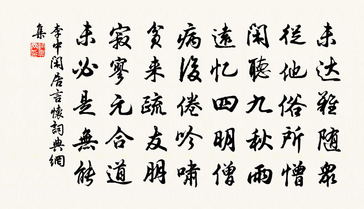 詩詞名句歷史字典書法欣賞書法字典國語詞典說文解字康熙字典古漢語字典標 題 作 者 詩 句 閒居言懷作者:李中 朝代:唐代閒居言懷原文未達難隨眾,從他俗所憎。閒聽九秋雨,遠憶四明僧。病後倦吟嘯,貧來疏友朋。寂寥元合道,未必是無能。詩詞問答問:閒居言懷的作者是誰?答:李中問:閒居言懷寫於哪個朝代?答:唐代問:閒居言懷是什麼體裁?答:五律李中閒居言懷書法欣賞閒居言懷書法作品注釋全唐詩:卷750-5詩詞推薦嶼贈白雲先生王迥孟浩然〔唐代〕悠悠清水江,水落沙嶼出。回潭石下深,綠筿岸傍密。鮫人潛不見,漁父歌自逸。憶與君別時,泛舟如昨日。夕陽春晏寄從弟德潤李中〔唐代〕相思禁菸近,樓上動吟魂。水國春寒在,人家暮雨昏。朱橋通竹樹,香徑匝蘭蓀。安得吾宗會,高歌醉一尊。延平次趙糾曹韻十四首古香陳宓〔宋代〕秋根托岩隈,靜對意味長。春來長柔柯,無風自生香。梅市暮歸三山陸游〔宋代〕日日蠻童佩一壼,壼乾時亦復村酤。橫林露塔遠猶見,暮靄籠山淡欲無。綠浦例憑菰作界,畫橈常遣鷺前驅。此身選冠子佚名〔宋代〕憔悴江山,淒涼古道,寒日澹煙殘雪。行人立馬,手摺江梅,紅萼素英初發。月下瑤台,弄玉飛瓊,不老年年春色見牽牛花有感釋寶曇〔宋代〕籬落牽牛又著花,摘花心在鬢先華。故園紅染薑絲在,安得緘封寄各槎。度大庾嶺宋之問〔唐代〕度嶺方辭國,停軺一望家。魂隨南翥鳥,淚盡北枝花。山雨初含霽,江雲欲變霞。但令歸有日,不敢恨長沙。送淮南提刑孫學士梅堯臣〔宋代〕淮南木老霜欲飛,順令恐縱諸侯威。命書才出邸掾謁,已見衣繡車迎歸。樂莫我聽筵莫迓,清如蟾蜍夜吐暉。不須有聞帳中香以為熬蠍者戲用前韻二首黃庭堅〔宋代〕我讀蔚宗香傳,文章不減二班。誤以甲為淺俗,卻知麝要防閒。寄雲居掩室和尚釋師範〔宋代〕鷲峰雲散霜天冷,南北東西片月孤。喜得江湖好訊息,點胸尊者在雲居。九日黃史鑄〔宋代〕露叢花發例皆遲,異品敷金不詭隨。應節及時真可愛,登高且把泛瑤卮。洛陽牡丹圖歐陽修〔宋代〕洛陽地脈花最宜,牡丹尤為天下奇。我昔所記數十種,於今十年半忘之。開圖若見故人面,其間數種昔未窺。客言寄題蜀李氏義概堂樓鑰〔宋代〕養氣非為俠,輕財弗市恩。仁聲高月旦,義概徹天閽。稱美推賢嗣,揚名有順孫。活人幾百萬,何止駟容門。即事十首劉克莊〔宋代〕香火萬家市,煙花二月時。居人空巷出,去寒海神祠。和束熙之論舊王令〔宋代〕當年齠齔偶同門,餬口重來已十春。仰嘆早成渾屬子,始知老拙盡輸人。火煙論友勞薰灼,桂櫱為生合苦辛。待看戊辰重陽絕句劉克莊〔宋代〕馮唐白首尚含香,衛武諄諄肯惰荒。萬一享年如二老,猶堪爛醉十重陽。端午帖子溫成合四首歐陽修〔宋代〕聞說仙家事杳微,世傳宜偽豈能知。遙思海上三山樂,寧記人間五日時。賀新郎(別鶴林)葛長庚〔宋代〕昔在神霄府。是上皇嬌惜,便自酣歌醉舞。來此人間不知歲,仍是酒龍詩虎。做弄得、襟情如許。俯仰紅塵幾今古空洞歌張志和〔唐代〕無自而然,自然之元;無造而化,造化之端。廓然愨然,其形團圞。反爾之視,絕爾之思,可以觀。送棗陽軍使劉似之兼棗陽令姜特立〔宋代〕四方男子志,當在壯年時。民社非輕異,才猷且小施。附庸今列邑,大國古稱隨。莫謂朝廷遠,行看召驛馳。名句推薦人生百年有幾,念良辰美景,休放虛過。元好問《驟雨打新荷》 仁者見之謂之仁,知者見之謂之知佚名《易傳·繫辭傳上·第五章》 富貴不能淫,貧賤不能移,威武不能屈。此之謂大丈夫。孟子《孟子·滕文公章句下·第二節》 當時相候赤欄橋,今日獨尋黃葉路。周邦彥《玉樓春·桃溪不作從容住》 孤花片葉,斷送清秋節。納蘭性德《清平樂·孤花片葉》 願春暫留,春歸如過翼。周邦彥《六醜·落花》 謀先事則昌,事先謀則亡。劉向《說苑·談叢》 離恨做成春夜雨。添得春江,劃地東流去楊炎正《蝶戀花·別范南伯》 人生不可安閒,有恆業,才足收放心王永彬《圍爐夜話·第八三則》 江皋樓觀前朝寺,秋色入秦淮。徐再思《人月圓·甘露懷古》