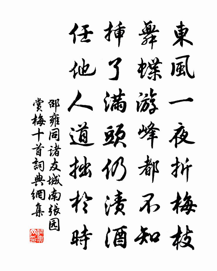詩詞名句歷史字典書法欣賞書法字典國語詞典說文解字康熙字典古漢語字典標 題 作 者 詩 句 同諸友城南張園賞梅十首作者:邵雍 朝代:宋代同諸友城南張園賞梅十首原文東風一夜折梅枝,舞蝶游峰都不知。插了滿頭仍漬酒,任他人道拙於時。詩詞問答問:同諸友城南張園賞梅十首的作者是誰?答:邵雍問:同諸友城南張園賞梅十首寫於哪個朝代?答:宋代邵雍同諸友城南張園賞梅十首書法欣賞同諸友城南張園賞梅十首書法作品詩詞推薦和嚴惲秀才落花杜牧〔唐代〕共惜流年留不得,且環流水醉流杯。無情紅艷年年盛,不恨凋零卻恨開。中秋不見月次韻元衡十四夜江乾步月五言趙蕃〔宋代〕月待今宵滿,秋空此夕中。與君俱客路,而我欠詩工。短髮添新白,頹顏失舊紅。波長嬉屬玉,渚遠愴賓鴻。歲暮陸游〔宋代〕半生浪走跨秦吳,白道還如筮仕初。凍芋濁醪邀里巷,昏煙濕雪暗郊墟。窮空敢恨寒無褐,憂患元因出有車。笑掩廣平宴會蘇頌〔宋代〕胡中宮室本穹廬,暫對皇華辟廣除。編曲垣牆都草創,張旃帷幄類鶉居。朝儀強效鵷行列,享禮猶存體薦餘。玉帛贈黃秀才別李覯〔宋代〕朝閨入有籍,疏遠雖見君。世眼不識道,貧賤無高文。蘭惠生同草,鴻鵠心在雲。贈子喜別離,兒女安得聞。青陽佚名〔兩漢〕青陽開動,根荄以遂,膏潤並愛,跂行畢逮。霆聲發榮,處頃聽,枯槁復產,乃成厥命。眾庶熙熙,施及夭胎,群次韻叔興見贈趙汝騰〔宋代〕眼界紛紛盡掃除,雲煙杳霧是匡廬。江山信美非吾土,井邑繁雄想舊廬。落筆縱橫盾草檄,感時憂憤欲成書。要須送魏時中胡才卿還城吳潛〔宋代〕歲晏謝紛務,掩關慕幽居。於道良未親,養真卿自娛。孰謂雙彥來,南征千里余。忻然肯相過,修贄期讀居。媿無桂州黃潭舜祠宋之問〔唐代〕虞世巡百越,相傳葬九疑。精靈游此地,祠樹日光輝。禋祭忽群望,丹青圖二妃。神來獸率舞,仙去鳳還飛。日暝訪菊顧逢〔宋代〕白髮蕭蕭映帽紗,相扶訪菊到山家。攙先一日東籬醉,要見人間未見花。真如靖老請贊釋妙倫〔宋代〕夜叉心,菩薩面。動則雲翻大野鬼翻懼聞,靜則練繞長溪人皆喜見。有一道 * 呪,三千里外學念者也靈驗。和道溪君別業(一作和友人溪居別業)溫庭筠〔唐代〕積潤初銷碧草新,鳳陽晴日帶雕輪。風飄弱柳平橋晚,雪點寒梅小苑春。屏上樓台陳後主,鏡中金翠李夫人。花房贈僧釋如淨〔宋代〕喝聲霹靂震晴空,白棒飛星化活龍。不入這般兒女隊,亂花翻袖舞春風。宿黃花館楊發〔唐代〕孤館蕭條槐葉稀,暮蟬聲隔水聲微。年年為客路無盡,日日送人身未歸。何處離鴻迷浦月,誰家愁婦擣霜衣。夜深送鄭司倉人蜀盧照鄰〔唐代〕商人丹水北,遊客錦城東。別意還無已,寓憂自不窮。優雲朝結陣,江月夜臨空。關塞疲征馬,霜氛落早鴻。潘年忍辱仙人丘處機〔元代〕天下週遊身不動。人間照了心無用。閒把虛空頻*弄。行雲從。八方上下輕放縱。兔角錐兒鑽骨痛。龜毛拂子敲山壽李雁湖吳泳〔宋代〕往往黃樞府,璇題護兩扉。剪除當路棘,紉補坐朝衣。風急操舟濟,江空擲釣歸。年年湖上雁,旭旦望南飛。梅花和黃覺民四首王之道〔宋代〕夜來春信到南枝,姑射神人逞雪肌。多謝長須解予意,送將羈客換新詩。和李文思早秋五首邵雍〔宋代〕日腳雲微淡,林梢葉漸黃。可堪須變色,徹了為侵霜。酒到難成醉,風來易得涼。老年何所欲,唯願且平康。清平樂吳文英〔宋代〕柔柯翦翠。胡蝶雙飛起。誰墮玉細花徑里。香帶薰風臨水。露紅滴□秋枝。金泥不染禪衣。結得同心成了,任教春名句推薦千萬恨,恨極在天涯。溫庭筠《夢江南·千萬恨》 猿鳥猶疑畏簡書,風雲常為護儲胥。李商隱《籌筆驛》 山中相送罷,日暮掩柴扉。王維《送別 / 山中送別 / 送友》 戲馬台南山簇簇,山邊飲酒歌別曲。張籍《送遠曲》 承恩不在貌,教妾若為容。杜荀鶴《 * 怨》 三更月。中庭恰照梨花雪。賀鑄《子夜歌·三更月》 順風而呼,聲非加疾也,而聞者彰。荀子《勸學》 聖人之官人,猶匠之用木也,取其所長,棄其所短。司馬光《資治通鑑·周紀一》 顧小而忘大,後必有害;狐疑猶豫,後必有悔。司馬遷《史記·七十列傳·李斯列傳》 雁字無多,寫得相思幾許。周密《掃花游·九日懷歸》